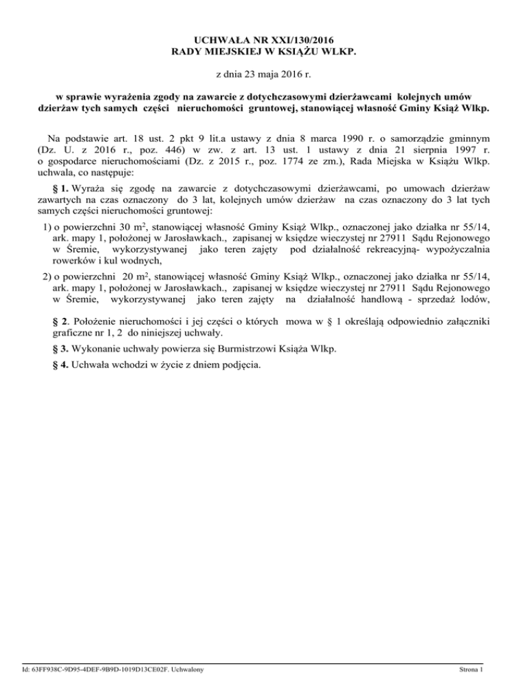 UCHWAŁA NR XXI/130/2016 RADY MIEJSKIEJ W KSIĄŻU WLKP. z dnia 23 maja 2016 r. w sprawie wyrażenia zgody na zawarcie z dotychczasowymi dzierżawcami kolejnych umów dzierżaw tych samych części nieruchomości gruntowej, stanowiącej własność Gminy Książ Wlkp. Na podstawie art. 18 ust. 2 pkt 9 lit.a ustawy z dnia 8 marca 1990 r. o samorządzie gminnym (Dz. U. z 2016 r., poz. 446) w zw. z art. 13 ust. 1 ustawy z dnia 21 sierpnia 1997 r. o gospodarce nieruchomościami (Dz. z 2015 r., poz. 1774 ze zm.), Rada Miejska w Książu Wlkp. uchwala, co następuje: § 1. Wyraża się zgodę na zawarcie z dotychczasowymi dzierżawcami, po umowach dzierżaw zawartych na czas oznaczony do 3 lat, kolejnych umów dzierżaw na czas oznaczony do 3 lat tych samych części nieruchomości gruntowej: 1) o powierzchni 30 m2, stanowiącej własność Gminy Książ Wlkp., oznaczonej jako działka nr 55/14, ark. mapy 1, położonej w Jarosławkach., zapisanej w księdze wieczystej nr 27911 Sądu Rejonowego w Śremie, wykorzystywanej jako teren zajęty pod działalność rekreacyjną- wypożyczalnia rowerków i kul wodnych, 2) o powierzchni 20 m2, stanowiącej własność Gminy Książ Wlkp., oznaczonej jako działka nr 55/14, ark. mapy 1, położonej w Jarosławkach., zapisanej w księdze wieczystej nr 27911 Sądu Rejonowego w Śremie, wykorzystywanej jako teren zajęty na działalność handlową - sprzedaż lodów, § 2. Położenie nieruchomości i jej części o których mowa w § 1 określają odpowiednio załączniki graficzne nr 1, 2 do niniejszej uchwały. § 3. Wykonanie uchwały powierza się Burmistrzowi Książa Wlkp. § 4. Uchwała wchodzi w życie z dniem podjęcia. Id: 63FF938C-9D95-4DEF-9B9D-1019D13CE02F. Uchwalony Strona 1 Załącznik nr 1 do Uchwały Nr XXI/130/2016 Rady Miejskiej w Książu Wlkp. z dnia 23 maja 2016 r. Id: 63FF938C-9D95-4DEF-9B9D-1019D13CE02F. Uchwalony Strona 1 Załącznik nr 2 do Uchwały Nr XXI/130/2016 Rady Miejskiej w Książu Wlkp. z dnia 23 maja 2016 r. Id: 63FF938C-9D95-4DEF-9B9D-1019D13CE02F. Uchwalony Strona 1 UZASADNIENIE Do Uchwały Nr XXI/130/2016 Rady Miejskiej w Książu Wlkp. z dnia 23 maja 2016 roku. Umowy dzierżaw, których przedmiotem są opisane w uchwale części nieruchomości gruntowej stanowiącej własność Gminy Książ Wlkp., położonej w Jarosławkach zawarte zostały z dzierżawcami jako teren zajęty pod działalność rekreacyjno- handlową. Po upływie oznaczonego do trzech lat terminu na który powyższe umowy zostały zawarte i w związku z tym wygaśnięciem umów, dotychczasowi dzierżawcy wystąpili do Burmistrza Książa Wlkp. z wnioskami o zawarcie kolejnych umów dzierżaw, tych samych części nieruchomości, to jest: 1) wniosek z dnia 18 marca 2016 roku- umowa dzierżawy od 01.06.2016 r. do 31.08.2016 r. z przeznaczeniem na działalność rekreacyjną - wypożyczalnia rowerków i kul wodnych, 2) wniosek z dnia 29 marca 2016 roku- umowa dzierżawy od 01.06.2016 r do 31.08.2016 r. z przeznaczeniem na działalnosć handlową - sprzedaż lodów. W obowiązującym stanie prawnym wynikającym z przepisu art. 18 ust. 2 pkt 9 lit. a ustawy z dnia 8 marca 1990 r. o samorządzie gminnym (Dz. U. z 2016 r., poz. 446) w zw. art. 13 ust.1 ustawy z dnia 21 sierpnia 1997 r. o gospodarce nieruchomościami ( Dz. z 2015 r., poz. 1774 ze zm.) w odniesieniu do nieruchomości wchodzących w skład zasobu gminnego, zawarcie z dotychczasowym dzierżawcą kolejnej umowy dzierżawy której przedmiotem jest ta sama nieruchomość po umowie zawartej na czas oznaczony do 3 lat, wymaga zgody Rady. W myśl art. 37 ust.4 ww. ustawy o gospodarce nieruchomościami, przy zawieraniu umów dzierżawy nieruchomości gminnych na czas oznaczony dłuższy niż 3 lata wymagany jest co do zasady przetarg na dzierżawę. Z powyższej regulacji wynika, że w przypadku, gdy dzierżawa ma nastąpić na czas oznaczony nie dłuższy niż 3 lata nie obowiązuje przetargowy tryb zawierania umowy dzierżawy. Jeżeli jest to jednak jak wyżej wskazano kolejna umowa dzierżawy której przedmiotem jest ta sama nieruchomość zawierana z dotychczasowym dzierżawcą po umowie zawartej na czas oznaczony do 3 lat, to wymagana jest zgoda Rady. W związku z powyższym podjęcie uchwały jest uzasadnione. Id: 63FF938C-9D95-4DEF-9B9D-1019D13CE02F. Uchwalony Strona 1
