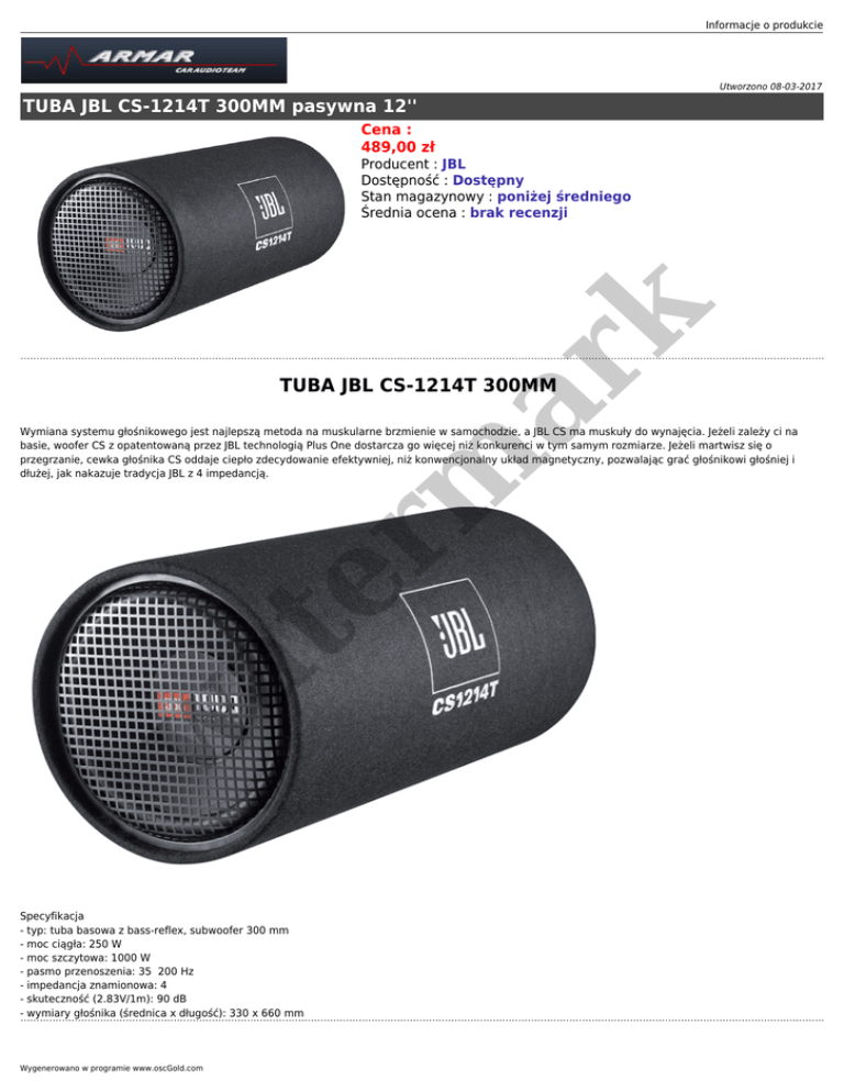 Informacje o produkcie Utworzono 08-03-2017 TUBA JBL CS-1214T 300MM pasywna 12'' Cena : 489,00 zł er m ar k Producent : JBL Dostępność : Dostępny Stan magazynowy : poniżej średniego Średnia ocena : brak recenzji TUBA JBL CS-1214T 300MM w at Wymiana systemu głośnikowego jest najlepszą metoda na muskularne brzmienie w samochodzie, a JBL CS ma muskuły do wynajęcia. Jeżeli zależy ci na basie, woofer CS z opatentowaną przez JBL technologią Plus One dostarcza go więcej niż konkurenci w tym samym rozmiarze. Jeżeli martwisz się o przegrzanie, cewka głośnika CS oddaje ciepło zdecydowanie efektywniej, niż konwencjonalny układ magnetyczny, pozwalając grać głośnikowi głośniej i dłużej, jak nakazuje tradycja JBL z 4 impedancją. Specyfikacja - typ: tuba basowa z bass-reflex, subwoofer 300 mm - moc ciągła: 250 W - moc szczytowa: 1000 W - pasmo przenoszenia: 35 200 Hz - impedancja znamionowa: 4 - skuteczność (2.83V/1m): 90 dB - wymiary głośnika (średnica x długość): 330 x 660 mm Wygenerowano w programie www.oscGold.com