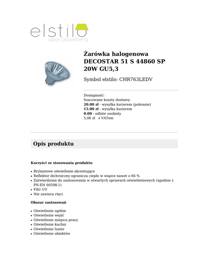 Żarówka halogenowa DECOSTAR 51 S 44860 SP 20W GU5,3 Symbol elstilo: CHR763LEDV Dostępność: Szacowane koszty dostawy: 20.00 zł - wysyłka kurierem (pobranie) 15.00 zł - wysyłka kurierem 0.00 - odbiór osobisty 5,06 zł z VATem Opis produktu Korzyści ze stosowania produktu ● ● ● ● ● Brylantowe oświetlenie akcentujące Reflektor dichroiczny ogranicza ciepło w wiązce nawet o 66 % Zatwierdzone do zastosowania w otwartych oprawach oświetleniowych (zgodnie z PN-EN 60598-1) Filtr UV Nie zawiera rtęci Obszar zastosowań ● ● ● ● ● ● Oświetlenie ogólne Oświetlenie wejść Oświetlenie miejsca pracy Oświetlenie kuchni Oświetlenie luster Oświetlenie obiektów Cechy produktu ● ● ● Średnia trwałość: 2000 h Ściemnialne Wskaźnik oddawania barw Ra: 100 Dane techniczne Trzonek: GU5.3 Napięcie znamionowe [V]: 12 Kąt świecenia [°]: 10 Barwa światła [K]: 2000-3500 (ciepła) Temperatura barwowa [K]: 2800 Współczynnik mocy [?]: 1 Waga opakowania [kg]: 0,041 Trwałość [h]: 2000 Strumień świetlny [lm]: 210 Średnica [mm]: 51 Długość [mm]: 46 Długość opakowania [mm]: 58 Szerokość opakowania [mm]: 46 Żywotność [h]: 2000 Typ: Halogen Strumień świetlny zakres [lm]: 1501-2500 Strumień świetlny dokładny [lm]: 2000 Moc [W]: 20 LED: Nie