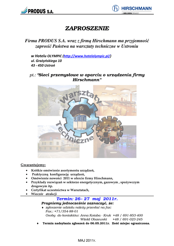 ZAPROSZENIE Firma PRODUS S.A. wraz z firmą Hirschmann ma przyjemność zaprosić Państwa na warsztaty techniczne w Ustroniu w Hotelu OLYMPIC (http://www.hotelolympic.pl/) ul. Grażyńskiego 10 43 - 450 Ustroń pt.: "Sieci przemysłowe w oparciu o urządzenia firmy Hirschmann” Gwarantujemy: • • • • • • Krótkie omówienie asortymentu urządzeń, Praktyczną konfigurację urządzeń, Omówienie nowości 2011 w ofercie firmy Hirschmann, Przykłady rozwiązań w sektorze energetycznym, gazowym , spożywczym drogowym itp. Certyfikat uczestnictwa w Warsztatach, Wieczór atrakcji Termin: 26– 27 maj 2011r. Pragniemy jednocześnie zaznaczyć, że: ♦ zgłoszenie udziału należy przesłać na fax: Fax.: +71/354-88-01 Osoby do kontaktów: Anna Kotaba - Kruk +48 / 691-853-400 Witold Olszewski +48 / 691-023-245 ♦ Termin nadsyłania zgłoszeń do 06.05.2011r. Ilość miejsc ograniczona. MAJ 2011r. PLAN WARSZTATÓW pt.: Sieci przemysłowe w oparciu o urządzenia firmy Hirschmann Czwartek 26.05.2011r. 10.00 – 10.15 10.15– 10.30 10.30 – 11.45 11.45 – 12.00 12.00 – 13.15 13.15 – 14.00 14.00 – 16.30 16.30 – 17.30 19.00 Poranna kawa, Rozpoczęcie Seminarium, Sieci przemysłowe w automatyce, Nowości 2011– przegląd nowych urządzeń i ich możliwości, Teoretyczne aspekty mechanizmów redundancji transmisji Hiper-Ring, Ring-Coupling, RSTP, Fast Hiper-Ring, MRP, Technologia SUBring etc. • Odległości i prędkość transmisji danych. • Energetyka IEC 61850 a Hirschmann • Sieci wirtualne VLAN i ich funkcjonowanie w układach automatyki, nadawanie priorytetów pakietom danych • Aplikacje multicastowe i ich zastosowanie, • Technologia radiowa WLAN, • Przerwa kawowa • Przykłady rozwiązań w sektorze energetycznym, gazowym, drogowym i morskim • Wstęp do zajęć praktycznych. • Sprawdzenie poprawności zainstalowanego oprogramowania HiDiscovery, IndHiVision, serwer TFTP. Przetestowanie możliwości oprogramowania. • Przedstawienie różnych sposobów konfiguracji urządzeń, hasła dostępu, przywracanie ustawień fabrycznych itp. • Wstępne budowanie struktury sieci docelowej. • Obiad Zajęcia praktyczne: • Upgrade urządzeń za pomocą serwera TFTP lub z poziomu Web. • Konfiguracja urządzeń za pomocą przeglądarki. • Konfiguracja urządzeń za pomocą gotowych plików konfiguracyjnych. • Pytania, dyskusja, sugestie • Wystąpienia firm współpracujących • Wieczór atrakcji i nagród • • • • • Piątek 27.05.2011r. 8.30 - 9.30 9.30 – 11.00 11.00 – 11.15 11.15 – 13.30 13.30 • Śniadanie Zajęcia praktyczne: • Zastosowanie urządzeń typu Firewall w automatyce Podłączenie zasilania, instalacja i uruchomienie urządzeń, • Obsługa urządzeń za pośrednictwem HiDiscavery, Ind.HiVision, Web, Hiperterminal. • Zapoznanie się z praktycznymi możliwościami urządzeń, • Pobieranie konfiguracji switcha i zapisywanie jej na serwerze TFTP (PC) • Przerwa kawowa Zajęcia praktyczne: • Budowanie i konfiguracja struktur redundantnych Hiper-Ring, Fast Hiper-RING, MRP, • Redundantne łączenie struktur Hiper-Ring za pomocą łączy Coupling, Subringów • Diagnostyka awarii w strukturach hiper-Ring i Coupling, Subring • Budowanie sieci Vlan na strukturach hiper-Ring i Coupling, • Nadawanie priorytetów. • Testowanie połączeń i mechanizmów redundancji w strukturze docelowej, • Urządzenia radiowe BAT, • Praktyczne sprawdzenie jakości i możliwości urządzeń firmy Hirschmann, • Przywracanie ustawień domyślnych urządzeń za pośrednictwem linii komend. Pytania i dyskusja. Obiad i zakończenie Warsztatów MAJ 2011r. Zgłoszenie Udziału - fax: +71/ 354 88 01 OD: DO PRODUS SA ul. Bystrzycka 69c 54-215 Wrocław tel: +71/ 354 88 00 tel/fax: +71/ 354 88 01 email: [email protected] Miejsce: Hotel OLYMPIC (http://www.hotelolympic.pl/) ul. Grażyńskiego 10 43 - 450 Ustroń Termin: 26– 27.05.2011r. Zgłaszamy swój udział: Warsztaty Techniczne pt.: „ Sieci przemysłowe w oparciu o urządzenia firmy Hirschmann” L.P Imię i nazwisko e-mail telefon 1 2 Koszt dwudniowego uczestniczenia – 1000,-zł netto od osoby + 23%VAT. (cena zawiera wszelkie koszty uczestnictwa łącznie z noclegiem i materiałami ). Płatność- przedpłata na podstawie faktury PROFORMA. Koszt dodatkowego noclegu 25/26 maj – 200,-netto. UWAGA!!! Dla Stałych Klientów 20% rabat od ceny Warsztatów. Termin nadsyłania zgłoszeń do 06.05.2011r. Ilość miejsc ograniczona dlatego prosimy o w miarę możliwości szybką rezerwację miejsc. MAJ 2011r. DOJAZD NA MIEJSCE: Hotel OLYMPIC**** Centrum Sportowo - Rekreacyjne "ZAWODZIE" Sp. z o.o. ul. Grażyńskiego 10 43 - 450 Ustroń www.hotelolympic.pl GPS: 49.72097; 18.817542 MAJ 2011r.