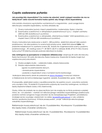 Często zadawane pytania: Jak powstają listy stypendialne? Czy można się odwołać, jeżeli czyjegoś nazwiska nie ma na takiej liście? Jakie warunki formalne trzeba spełnić aby Uwagi o liście stypendialnej: Lista została utworzona wg kryteriów wymienionych w regulaminie – pod uwagę brano rekrutacyjny wskaźnik stypendialny, na który składały się: 1) Oceny maturalne (suma) z trzech przedmiotów: matematyka, fizyka i chemia; 2) Ewentualne uczestnictwo w olimpiadach przedmiotowych (j.w.) – stopień centralny (200 lub 300 dodatkowych punktów) 3) Ewentualne uczestnictwo w olimpiadzie „Diamentowy Indeks” AGH (przedmioty j.w.) – stopień trzeci (100 lub 200 dodatkowych punktów). Oceny maturalne były skalowane w skali 0 – 200 punktów. Jeżeli ktoś zdawał tylko poziom podstawowy lub oba poziomy to ocena była prostą sumą. Jeżeli ktoś zdawał tylko na poziomie rozszerzonym to uzyskana ocena (R) służyła do wygenerowania oceny z poziomu podstawowego (P) według wzoru P = (R-30)*2; dla R w zakresie 30-80. (P=0; P=100.) Ocena byłą sumą P+R (identycznie jak podczas rekrutacji na studia). Listy rankingowe są sporządzone w kolejności alfabetycznej i obejmują 30 osób dla kierunku fizyka techniczna i 35 osób dla kierunku fizyka medyczna. Stypendia te będą mogły być wypłacone pod warunkami: 1) Osoba podjęła studia – odebrała indeks, złożyła ślubowanie; 2) Złożyła odpowiednie dokumenty: -zgoda na przetwarzanie danych, - oświadczenie stypendialne, - podanie o stypendium wraz z numerem konta bankowego brakujące dokumenty (druki do pobrania ze strony Wydziału) muszą być złożone w Dziekanacie do końca bieżącego tygodnia (piątek, 8 października; godz. 13.00). W przypadku, jeżeli jakaś osoba z opublikowanej listy nie spełnia wwym. warunków zostanie ona usunięta z listy. W piątek 8.10 popołudniu pojawią się nowe listy rankingowe, na których będą dopisane kolejne osoby z listy rezerwowej. Osoby, które nie znalazły się na obecnej liście (ani nie znajdą się na liście podanej w piątek) mimo, że – ich zdaniem – wartość ich rekrutacyjnego wskaźnika stypendialnego przekroczyła podane wartości progowe mogą odwołać się do Zarządzającego Projektem, prodziekana Andrzeja Lendy wysyłając wiadomość na adres: [email protected] w celu ustalenia terminu spotkania (rozmowy). W liście proszę podać „swoje” kalkulacje rekrutacyjnego wskaźnika stypendialnego. Reklamacje muszą zakończyć się do 15 października. Wywieszone 15 października listy będą miały charakter ostateczny. Reklamacje muszą zakończyć się do 15 października. Wywieszone 15 października listy będą miały charakter ostateczny. Listy stypendialne dla drugiego (i wyższych) semestru studiów sporządzane są w trybie określonym jednoznacznie w regulaminie. Kalendarium ewentualnych reklamacji zostanie podane przy wywieszeniu listy 2) Czy muszę chodzić na zajęcia wyrównawcze z przedmiotów matematyka i fizyka , jeżeli zdawałem maturę z tych przedmiotów (jednego z nich) w bardzo dobrym wynikiem? Tak jak wspominaliśmy – termin zajęcia wyrównawcze nie jest szczęśliwie wybrany. Chodzi o dodatkowe zajęcia, które mają Wam ułatwić naukę tych dwóch podstawowych przedmiotów. Jeżeli będziecie na nich „wszystko wiedzieć” to od Waszej inicjatywy będzie zależało zachęcić Prowadzących o rozszerzenie zakresu przerabianych problemów. Osoby szczególnie „dobrze sobie radzące” będą mogły występować same w roli Prowadzących, dyskutując na przykład ciekawy problem, jaki udało im się rozwiązać (a nawet znaleźć i rozwiązać). Proszę pamiętać że i obecność i aktywność na tych „dodatkowych zajęciach” będą Wam niewątpliwie pomocne w uzyskaniu dobrych (lepszych!) ocen z zaliczeń tych dwóch przedmiotów. A te oceny będą składały się na … semestralny wskaźnik stypendialny. 3) Czy w przypadku przerwania studiów (rezygnacja, złe postępy, przypadek losowy) muszę zwracać pobierane wcześniej stypendium? Nie. Nie ma takiego rygoru. Wydział i fundatorzy stypendiów okazują beneficjentom pomocy stypendialnej daleko idące zaufanie. Prosimy o docenienie tego gestu.