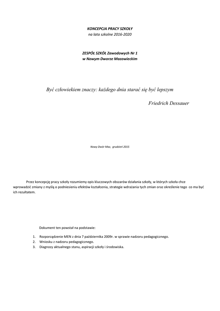 KONCEPCJA PRACY SZKOŁY na lata szkolne 2016-2020 ZESPÓŁ SZKÓŁ Zawodowych Nr 1 w Nowym Dworze Mazowieckim Być człowiekiem znaczy: każdego dnia starać się być lepszym Friedrich Dessauer Nowy Dwór Maz, grudzień 2015 Przez koncepcję pracy szkoły rozumiemy opis kluczowych obszarów działania szkoły, w których szkoła chce wprowadzić zmiany z myślą o podniesieniu efektów kształcenia, strategie wdrażania tych zmian oraz określenie tego co ma być ich rezultatem. Dokument ten powstał na podstawie: 1. 2. 3. Rozporządzenie MEN z dnia 7 października 2009r. w sprawie nadzoru pedagogicznego. Wniosku z nadzoru pedagogicznego. Diagnozy aktualnego stanu, aspiracji szkoły i środowiska. Planując rozwój szkoły uwzględniono analizę SWOT. Dostosowanie do pełnej realizacji programowej kształcenia w zawodzie MOCNE STRONY Wysoko wykwalifikowana kadra posiadająca duże doświadczenia zawodowe Dyspozycyjność rady pedagogicznej i dostosowanie kształcenia do wymogów i standardów egzaminacyjnych oraz rynku pracy Sukcesy uczniów w konkursach przedmiotowych i sporcie Otwartość na problemy uczniów Dobra opieka pedagogiczna Nauczyciele wspierają uczniów potrzebujących pomocy Praca szkoły na jedna zmianę Propagowanie idei wolontariatu poprzez udział w akcjach charytatywnych Dobra opinia o szkole w środowisku Ład i porządek, czystość pomieszczeń Dobre warunki lokalowe i wyposażenie w środki audiowizualne Możliwość ukończenia przez uczniów kursu prawa jazdy kat. B Realizacja zintegrowanej polityki bezpieczeństwa Realizacja projektów wspierających rozwój uczniów finansowanych ze środków UE Dobra współpraca z organem prowadzącym szkoły Bardzo dobre wyniki z egzaminów kwalifikacji w zawodzie SZANSE modernizacja pracowni do zajęć praktycznych i ich dostosowanie pod potrzeby egzaminów zewnętrznych. modernizacja obiektów sportowych poprawa poziomu kształcenia poprzez udział w projektach finansowanych przez UE zdobywanie dodatkowych umiejętności i kwalifikacji przez uczniów wzbogacenie oferty edukacyjnej. SŁABE STRONY Niezadawalająca zdawalność egzaminów maturalnych Niska frekwencja uczniów na zajęciach edukacyjnych Obniżająca się pozycja uczniów „na wejściu” Brak kółek zainteresowań Słabe zainteresowanie uczniów zajęciami pozalekcyjnymi Trudny dojazd do szkoły Małe zaangażowanie rodziców w działalność szkoły Duże zróżnicowanie intelektualne i społeczne uczniów Niewystarczająca opieka psychologiczna wynikająca z braku możliwości zatrudnienia w szkole psychologa Słabo wyposażona baza do prowadzenia zajęć praktycznych ZAGROŻENIA niż demograficzny słaby rozwój infrastruktury przemysłowej zagrożenia różnymi patologiami społecznymi upadek autorytetów obarczanie szkoły wyłączną odpowiedzialnością za kształtowanie postaw młodzieży biurokratyzacja szkoły kryzys ekonomiczny Cel główny: Budowanie systemu jakości pracy szkoły zapewniającego zaspokojenie potrzeb uczniów i nauczycieli w zakresie kształcenia, wychowania, opieki i rozwoju zawodowego Wspieranie rodziny w procesie wychowania i nauczania oraz stworzenie uczniom optymalnych warunków do prawidłowego wszechstronnego rozwoju intelektualnego i duchowego Unowocześnienie bazy szkoły, informatyzacja procesów edukacyjnych w celu poprawy efektywności kształcenia i wychowania Promowanie w działaniu szkoły zdrowego stylu życia i zachowań proekologicznych Motywowanie kadry do doskonalenia zawodowego Przygotowanie do życia w społeczeństwie informacyjnym przez wykorzystanie w procesie nauczania – uczenie się technologii informatycznej Cele szczegółowe: Zapewnienie ciągłego rozwoju szkoły Doskonalenie jakości pracy szkoły Kształtowanie pozytywnego wizerunku szkoły w środowisku lokalnym Zapewnienie wysokiego poziomu pracy dydaktycznej Planowanie doskonalenia nauczycieli zgodnie z potrzebami szkoły Rozwój bazy szkolnej Zapewnienie bezpieczeństwa psychicznego i fizycznego uczniom, nauczycielom Doskonalenie sprawności organizacji oraz systemu komunikowania się Zaspokajanie potrzeb edukacyjnych i zapewnianie rozwoju osobowego ucznia Podnoszenie efektywności kształcenia Podejmowanie systematycznych i skutecznych działań wychowawczych, profilaktycznych i opiekuńczych Wpajanie zasad tolerancji, poszanowania inności, odmienności Kierunki rozwoju: 1. 2. 3. 4. 5. 6. 7. 8. 9. 10. Podniesienie bezpieczeństwa fizycznego i psychicznego ucznia. Rozwój bazy dydaktycznej. Poprawa warunków pracy i nauki. Wzbogacenie księgozbioru ze szczególnym uwzględnieniem multimediów. Promowanie szkoły w środowisku lokalnym. Kształtowanie właściwych relacji międzyludzkich ( integracja ). Doskonalenie efektywności kształcenia zawodowego. Rozwój samorządności uczniów. Rozwijanie zainteresowań uczniów. Włączenie rodziców do życia szkoły. I. Organizacja i zarządzanie Cele strategiczne Zadania szczegółowe Wykonawcy Monitoring Termin Przewidywane efekty 1. Zwiększenie motywacji nauczycieli i uczniów do pracy i rozwoju Opracowanie planu doskonalenia zawodowego zgodnego z koncepcją rozwoju szkoły Dyrektor, nauczyciele na bieżąco, sprawozdanie z planu rozwoju zawodowego Listopad każdego roku objętego programem Udział nauczycieli w szkoleniach i kursach finansowanych ze środków UE nauczyciele na bieżąco, sprawozdanie z planu rozwoju zawodowego, sprawozdanie z planu pracy szkoły Okres objęty programem Organizowanie szkoleń i warsztatów dla nauczycieli dyrektor Harmonogram szkoleń i warsztatów Okres objęty programem Przygotowanie uczniów do matury i egzaminu potwierdzającego kwalifikacje w zawodzie nauczyciele Analiza Wyników egzaminów Okres objęty programem Doposażenie bazy techno-dydaktycznej umożliwiające prowadzenie zajęć z różnych przedmiotów z wykorzystaniem nowych technologii komunikacyjnych Dyrektor, nauczyciele Dzienniki lekcyjne, plany nauczania Okres objęty programem Szkoła