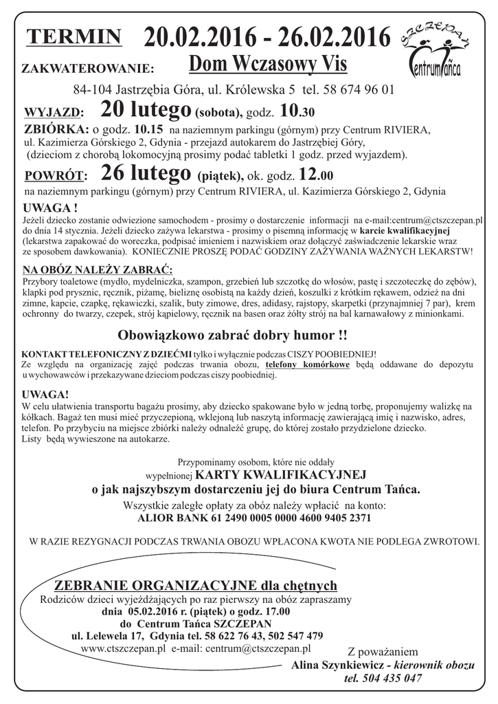TERMIN 20.02.2016 - 26.02.2016 ZAKWATEROWANIE: Dom Wczasowy Vis 84-104 Jastrzêbia Góra, ul. Królewska 5 tel. 58 674 96 01 20 lutego WYJAZD: (sobota), godz. 10.30 ZBIÓRKA: o godz. 10.15 na naziemnym parkingu (górnym) przy Centrum RIVIERA, ul. Kazimierza Górskiego 2, Gdynia - przejazd autokarem do Jastrzêbiej Góry, (dzieciom z chorob¹ lokomocyjn¹ prosimy podaæ tabletki 1 godz. przed wyjazdem). POWRÓT: 26 lutego (pi¹tek), ok. godz. 12.00 na naziemnym parkingu (górnym) przy Centrum RIVIERA, ul. Kazimierza Górskiego 2, Gdynia UWAGA ! Je¿eli dziecko zostanie odwiezione samochodem - prosimy o dostarczenie informacji na e-mail:[email protected] do dnia 14 stycznia. Je¿eli dziecko za¿ywa lekarstwa - prosimy o pisemn¹ informacjê w karcie kwalifikacyjnej (lekarstwa zapakowaæ do woreczka, podpisaæ imieniem i nazwiskiem oraz do³¹czyæ zaœwiadczenie lekarskie wraz ze sposobem dawkowania). KONIECZNIE PROSZÊ PODAÆ GODZINY ZA¯YWANIA WA¯NYCH LEKARSTW! NA OBÓZ NALE¯Y ZABRAÆ: Przybory toaletowe (myd³o, mydelniczka, szampon, grzebieñ lub szczotkê do w³osów, pastê i szczoteczkê do zêbów), klapki pod prysznic, rêcznik, pi¿amê, bieliznê osobist¹ na ka¿dy dzieñ, koszulki z krótkim rêkawem, odzie¿ na dni zimne, kapcie, czapkê, rêkawiczki, szalik, buty zimowe, dres, adidasy, rajstopy, skarpetki (przynajmniej 7 par), krem ochronny do twarzy, czepek, strój k¹pielowy, rêcznik na basen oraz ¿ó³ty strój na bal karnawa³owy z minionkami. Obowi¹zkowo zabraæ dobry humor !! KONTAKT TELEFONICZNY Z DZIEÆMI tylko i wy³¹cznie podczas CISZY POOBIEDNIEJ! Ze wzglêdu na organizacjê zajêæ podczas trwania obozu, telefony komórkowe bêd¹ oddawane do depozytu u wychowawców i przekazywane dzieciom podczas ciszy poobiedniej. UWAGA! W celu u³atwienia transportu baga¿u prosimy, aby dziecko spakowane by³o w jedn¹ torbê, proponujemy walizkê na kó³kach. Baga¿ ten musi mieæ przyczepion¹, wklejon¹ lub naszyt¹ informacjê zawieraj¹c¹ imiê i nazwisko, adres, telefon. Po przybyciu na miejsce zbiórki nale¿y odnaleŸæ grupê, do której zosta³o przydzielone dziecko. Listy bêd¹ wywieszone na autokarze. Przypominamy osobom, które nie odda³y wype³nionej KARTY KWALIFIKACYJNEJ o jak najszybszym dostarczeniu jej do biura Centrum Tañca. Wszystkie zaleg³e op³aty za obóz nale¿y wp³aciæ na konto: ALIOR BANK 61 2490 0005 0000 4600 9405 2371 W RAZIE REZYGNACJI PODCZAS TRWANIA OBOZU WP£ACONA KWOTA NIE PODLEGA ZWROTOWI. ZEBRANIE ORGANIZACYJNE dla chêtnych Rodziców dzieci wyje¿d¿aj¹cych po raz pierwszy na obóz zapraszamy dnia 05.02.2016 r. (pi¹tek) o godz. 17.00 do Centrum Tañca SZCZEPAN ul. Lelewela 17, Gdynia tel. 58 622 76 43, 502 547 479 www.ctszczepan.pl e-mail: [email protected] Z powa¿aniem Alina Szynkiewicz - kierownik obozu tel. 504 435 047