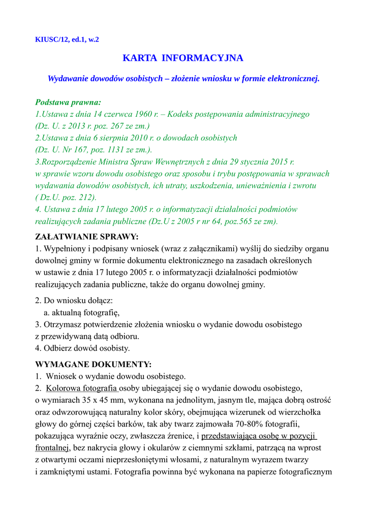 KIUSC/12, ed.1, w.2 KARTA INFORMACYJNA Wydawanie dowodów osobistych – złożenie wniosku w formie elektronicznej. Podstawa prawna: 1.Ustawa z dnia 14 czerwca 1960 r. – Kodeks postępowania administracyjnego (Dz. U. z 2013 r. poz. 267 ze zm.) 2.Ustawa z dnia 6 sierpnia 2010 r. o dowodach osobistych (Dz. U. Nr 167, poz. 1131 ze zm.). 3.Rozporządzenie Ministra Spraw Wewnętrznych z dnia 29 stycznia 2015 r. w sprawie wzoru dowodu osobistego oraz sposobu i trybu postępowania w sprawach wydawania dowodów osobistych, ich utraty, uszkodzenia, unieważnienia i zwrotu ( Dz.U. poz. 212). 4. Ustawa z dnia 17 lutego 2005 r. o informatyzacji działalności podmiotów realizujących zadania publiczne (Dz.U z 2005 r nr 64, poz.565 ze zm). ZAŁATWIANIE SPRAWY: 1. Wypełniony i podpisany wniosek (wraz z załącznikami) wyślij do siedziby organu dowolnej gminy w formie dokumentu elektronicznego na zasadach określonych w ustawie z dnia 17 lutego 2005 r. o informatyzacji działalności podmiotów realizujących zadania publiczne, także do organu dowolnej gminy. 2. Do wniosku dołącz: a. aktualną fotografię, 3. Otrzymasz potwierdzenie złożenia wniosku o wydanie dowodu osobistego z przewidywaną datą odbioru. 4. Odbierz dowód osobisty. WYMAGANE DOKUMENTY: 1. Wniosek o wydanie dowodu osobistego. 2. Kolorowa fotografia osoby ubiegającej się o wydanie dowodu osobistego, o wymiarach 35 x 45 mm, wykonana na jednolitym, jasnym tle, mająca dobrą ostrość oraz odwzorowującą naturalny kolor skóry, obejmująca wizerunek od wierzchołka głowy do górnej części barków, tak aby twarz zajmowała 70-80% fotografii, pokazująca wyraźnie oczy, zwłaszcza źrenice, i przedstawiająca osobę w pozycji frontalnej, bez nakrycia głowy i okularów z ciemnymi szkłami, patrzącą na wprost z otwartymi oczami nieprzesłoniętymi włosami, z naturalnym wyrazem twarzy i zamkniętymi ustami. Fotografia powinna być wykonana na papierze fotograficznym lub papierze fotograficznym przeznaczonym do drukarek. Fotografia powinna być wykonana nie wcześniej, niż 6 miesięcy przed dniem złożenia wniosku. 3. Na żądanie organu, w przypadku niezgodności danych zawartych we wniosku z danymi w Rejestrze Dowodów Osobistych – skrócony odpis polskiego aktu urodzenia, w przypadku zawarcia małżeństwa – skrócony odpis polskiego aktu małżeństwa, orzeczenie sądu, dokument poświadczający obywatelstwo polskie. 4. Dotychczasowy dowód osobisty lub w przypadku jego utraty – ważny np. paszport (do wglądu). Wniosek o wydanie dowodu osobistego w postaci elektronicznej należy złożyć w siedzibie dowolnej gminy wypełniony formularz wniosku o wydanie dowodu osobistego w postaci elektronicznej, należy opatrzyć bezpiecznym podpisem elektronicznym weryfikowanym przy pomocy ważnego kwalifikowanego certyfikatu lub podpisem potwierdzonym profilem zaufanym ePUAP. Pouczenie: 1. Ministerstwo Spraw Wewnętrznych uruchomiło na platformie ePUAP2 2. 3. 4. 5. www.ePUAP.gov.pl centralną usługę, z użyciem której można załatwić w drodze elektronicznej sprawę związaną ze złożeniem wniosku o wydanie dowodu osobistego. W celu skorzystania z ww. usługi niezbędne jest posiadanie indywidualnego konta na platformie ePUAP (loginu i hasła) które służą do zalogowania się na stronie oraz podpisywania przesyłanych do urzędu dokumentów. Instrukcja założenia konta na tej platformie znajduje się na stronie www.ePUAP.gov.pl. W celu złożenia wniosku o wydanie dowodu osobistego na stronie ePUAP2 należy odszukać Katalogu spraw/ Sprawy obywatelskie usługę o nazwie Wnioskowanie o wydanie dowodu osobistego, następnie zalogować się na portal ePUAP2, wypełnić znajdujący się tam Formularz wniosku o wydanie dowodu osobistego i przesłać go do organu dowolnej gminy. Administratorem strony internetowej ePUAP2 jest Ministerstwo Administracji i Cyfryzacji www.mac.gov.pl. OPŁATY: Brak. MIEJSCE ZŁOŻENIA : Elektroniczna skrzynka podawcza Urzędu Miasta Kostrzyn nad Odrą. MIEJSCE ODBIORU DOWODU OSOBISTEGO: Biuro Dowodów Osobistych Urzędu Miasta Kostrzyn nad Odrą. JEDNOSTAKA ODPOWIEDZIALNA: Urząd Stanu Cywilnego. TERMIN ODPOWIEDZI: Do 30 dni. TRYB ODWOŁAWCZY: Do Wojewody Lubuskiego, w terminie 14 dni od dnia doręczenia decyzji, za pośrednictwem organu, który wydał decyzję. UWAGI: 1. Pełnoletni obywatel RP zamieszkujący na jej terytorium jest obowiązany posiadać dowód osobisty. 2. Dowód osobisty należy wymienić w przypadku: • upływu terminu ważności dowodu osobistego – co najmniej 30 dni przed upływem terminu ważności, • zmiany danych zawartych w dowodzie osobistym - niezwłocznie, - wyjątek stanowi 89 ust. 2 ustawy o dowodach osobistych: zmiana adresu miejsca zameldowania posiadacza dowodu osobistego wydanego na podstawie przepisów ustawy z dnia 10 kwietnia 1974 r. o ewidencji ludności i dowodach osobistych nie stanowi podstawy do jego wymiany, • zmiany wizerunku twarzy posiadacza dowodu osobistego, w stosunku do wizerunku twarzy zamieszczonego w dowodzie osobistym w stopniu utrudniającym lub uniemożliwiającym identyfikacje jego posiadacza - niezwłocznie, • uszkodzenia dowodu osobistego w stopniu utrudniającym lub uniemożliwiającym identyfikację jego posiadacza - niezwłocznie. 3. W przypadku utraty dowodu osobistego należy niezwłocznie zgłosić jego utratę oraz wystąpić o wydanie dowodu osobistego. 4. Dowód osobisty wydaje się nieodpłatnie. 5. Dowód osobisty wydaje się na wniosek. 6. Wniosek składa się w organie dowolnej gminy na terytorium RP. 7. Wniosek można złożyć w formie pisemnej lub w formie dokumentu elektronicznego na zasadach określonych w ustawie z dnia 17 lutego 2005 r. o informatyzacji działalności podmiotów realizujących zadania publiczne. 8.Wniosek składa się osobiście, z wyjątkiem: – osoby małoletniej, której do ukończenia 18. roku życia zostało więcej niż 30 dni, w imieniu której wniosek składa jeden z rodzicó