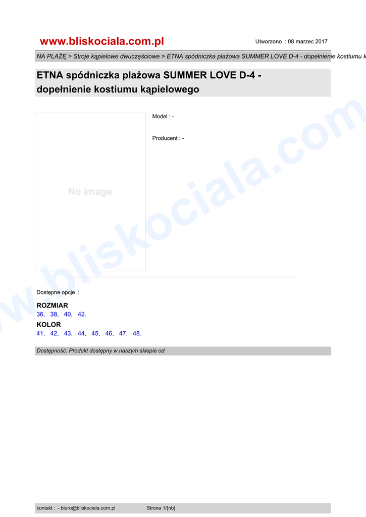 www.bliskociala.com.pl Utworzono : 08 marzec 2017 NA PLAŻĘ > Stroje kąpielowe dwuczęściowe > ETNA spódniczka plażowa SUMMER LOVE D-4 - dopełnienie kostiumu k ETNA spódniczka plażowa SUMMER LOVE D-4 dopełnienie kostiumu kąpielowego m o c . a l a Model : - Producent : - i c No image o k il s w b . w Dostępne opcje : ROZMIAR 36, 38, 40, 42. KOLOR 41, 42, 43, 44, 45, 46, 47, 48. Dostępność: Produkt dostępny w naszym sklepie od kontakt : - [email protected] Strona 1/{nb}