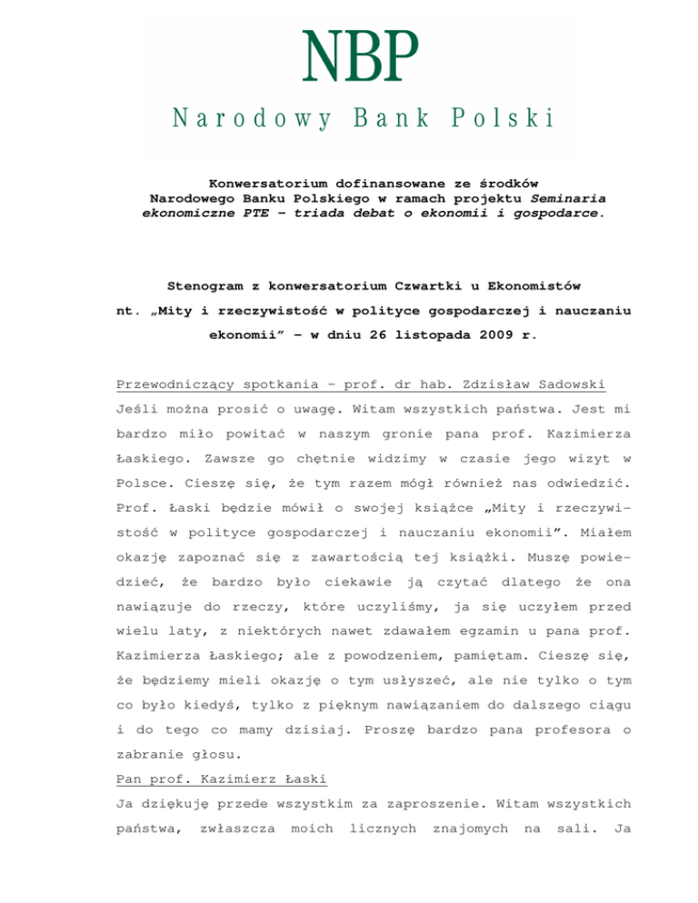 Konwersatorium dofinansowane ze środków Narodowego Banku Polskiego w ramach projektu Seminaria ekonomiczne PTE – triada debat o ekonomii i gospodarce. Stenogram z konwersatorium Czwartki u Ekonomistów nt. „Mity i rzeczywistość w polityce gospodarczej i nauczaniu ekonomii” - w dniu 26 listopada 2009 r. Przewodniczący spotkania – prof. dr hab. Zdzisław Sadowski Jeśli można prosić o uwagę. Witam wszystkich państwa. Jest mi bardzo miło powitać w naszym gronie pana prof. Kazimierza Łaskiego. Zawsze go chętnie widzimy w czasie jego wizyt w Polsce. Cieszę się, że tym razem mógł również nas odwiedzić. Prof. Łaski będzie mówił o swojej książce „Mity i rzeczywistość w polityce gospodarczej i nauczaniu ekonomii”. Miałem okazję zapoznać się z zawartością tej książki. Muszę powiedzieć, że bardzo było ciekawie ją czytać dlatego że ona nawiązuje do rzeczy, które uczyliśmy, ja się uczyłem przed wielu laty, z niektórych nawet zdawałem egzamin u pana prof. Kazimierza Łaskiego; ale z powodzeniem, pamiętam. Cieszę się, że będziemy mieli okazję o tym usłyszeć, ale nie tylko o tym co było kiedyś, tylko z pięknym nawiązaniem do dalszego ciągu i do tego co mamy dzisiaj. Proszę bardzo pana profesora o zabranie głosu. Pan prof. Kazimierz Łaski Ja dziękuję przede wszystkim za zaproszenie. Witam wszystkich państwa, zwłaszcza moich licznych znajomych na sali. Ja 2 Stenogram z konwersatorium Czwartki u Ekonomistów nt. „Mity i rzeczywistość w polityce gospodarczej i nauczaniu ekonomii” - 26 listopada 2009 r. właściwie nie bardzo chciałem mówić, ale jak mogę, to ja mogę mówić długo na ten temat. Ja nie wiem czy to jest cel naszego spotkania dlatego, że to co miałem do powiedzenia na temat mitu i rzeczywistości w polityce gospodarki i nauczaniu ekonomii napisałem w tej książeczce. I właściwie mogę tylko powiedzieć może dlaczego ta książka w ogóle powstała. Powstała na kanwie wykładów, które wygłosiłem jak zawsze sprowokowany przez moich przyjaciół, przez prof. Kowalika. Po czym te wykłady czekały przez kilka lat na to, żeby je wydać, co się okazało bardzo skomplikowane. Państwo sami wiecie, że jak się próbuje redagować słowo mówione, to człowiek dochodzi do wniosku, że o wiele łatwiej jest napisać wszystko od nowa. Wobec tego, że to było trudno, to czekało latami i tylko nalegania znowu Kowalika, po czym Jurka Osiatyńskiego spowodowały, że kiedyś lenistwo czy też brak czasu pokonane i zająłem się poważnie. Dlaczego? Dlatego, że to są rzeczy dość elementarne, co prawda nie w zastosowaniu, ale bo o ile chodzi o zastosowanie, to starałem się nawiązać do rzeczy bardzo aktualnych i poważnych. Ale o ile chodzi o rzeczy metodologiczne, raczej to jest wykład na poziomie podstawowym, bo adresowany jest do ludzi, którzy nie mają pojęcia o ekonomii, czyli także wyjaśnienie co to jest produkt narodowy, itd., jak się liczy ceny. Pewna elementarność, ... rzeczy do dalszego wiecie, tekstu. rządy tego Chodzi co o to, nazwałem jak że ... w państwo ekonomii wszyscy jest tego rodzaju, że studenci naprawdę, nawet tam gdzie ja spędziłem ostatni okres mojej działalności naukowej na uniwersytecie w ... pytałem kiedyś kolegów, czy przynajmniej studenci wiedzą, co to jest mnożnik. Oni powiedzieli, niekoniecznie. Więc ponieważ jest, była, teraz jest trochę lepiej, ponieważ 3 Stenogram z konwersatorium Czwartki u Ekonomistów nt. „Mity i rzeczywistość w polityce gospodarczej i nauczaniu ekonomii” - 26 listopada 2009 r. życie dało nam klapsa, niektórych to otrzeźwiło, ale nie wszystkich oczywiście, nawet powiem, że większość nie otrzeźwiło. To był powód dlaczego książeczka powstała, po prostu próba spopularyzowania pewnych elementarnych rzeczy z zakresu teorii efektywnego popytu, teorii, która niby istniała, ale była spychana na brzegi i to nie tylko jako alternatywna teoria, tylko jako teoria nienaukowa. Te inne to są naukowe teorie, a ta to jest taka, nie wiadomo co to właściwie jest. Więc w obronie tego powstała m.in. ta książeczka. Czy ona wywrze jakiś wpływ na nauczanie, nie wiem. Bardzo bym był rad, gdyby tak się stało. Wielkiej nadziei w tym zakresie nie ma, ale może. Jeśli chodzi o meritum sprawy, to ja bym powiedział jedną rzecz tylko i ona chyba jest najważniejsza, że ten kryzys, który przeżywamy, który mam nadzieję dobiega końca, ujawnił w sposób stanowczy pewne fakty. W okresie kiedy kryzys wystąpił z ogromnym napięciem, nieomal bez chwili wahania zaczęto pewne działania. Otóż te działania okazały się absolutnie sprzeczne z całą teorią menstrim. Nie ma ani jednego kroku w tym, co zrobiły rządu Stanów Zjednoczonych, i tym co zrobiły rządy zachodnioeuropejskie, które można by prześledzić do menstrim ekonomicznego. To wszystko są narzędzia ze starej skrzynki i gdyby nie było tej starej skrzynki, gdyby nie było Keynesa, gdyby nie było Kaleckiego, to nie byłoby tego, co się stało w zeszłym roku i pod koniec poprzedniego roku, w zeszłym roku głównie, mianowicie masowego zwiększenia płynności w systemie bankowym, niedopuszczenie do upadku banków, poza Lehmanem, który zresztą okazuje się, zdaje się, że to było tak, że co prawda złośliwi mówią, że chyba nie jest przypadkiem, że wszyscy kierownicy nawet tej państwowej w Ameryce, to są byli albo przyszli pracownicy 4 Stenogram z konwersatorium Czwartki u Ekonomistów nt. „Mity i rzeczywistość w polityce gospodarczej i nauczaniu ekonomii” - 26 listopada 2009 r. Goldman Sachs, a żaden nie był od Lehmana, wobec tego Lehman upadł. To chyba nie jest bez kozery, są też jakieś nagrania ile razy sekretarz stanu finansów rozmawiał tego dnia dramatycznego z Goldman Sachsem z 25 razy i w końcu Goldman upadł. Ale jest też prawdą, że gdyby Lehman nie, to kongres nie uchwaliłby takich strasznych p