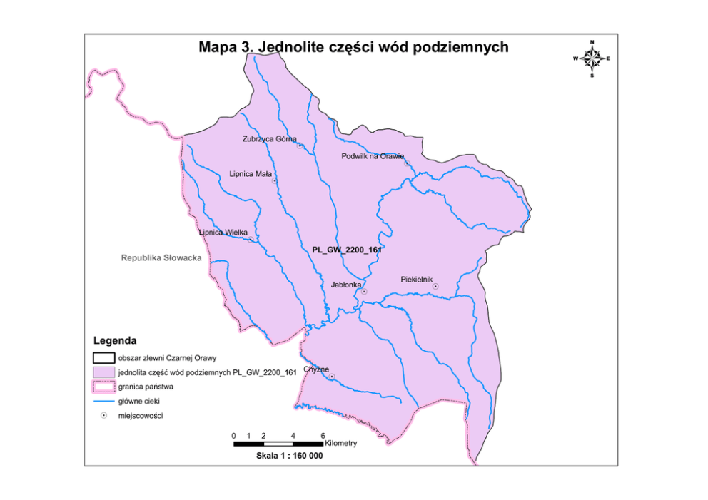 Mapa 3. Jednolite części wód podziemnych Zubrzyca Górna . Podwilk na Orawie . Lipnica Mała . Lipnica Wielka . PL_GW_2200_161 Republika Słowacka Jabłonka . Legenda obszar zlewni Czarnej Orawy jednolita część wód podziemnych PL_GW_2200_161 Chyżne . granica państwa główne cieki . miejscowości 0 1 2 4 6 Kilometry Skala 1 : 160 000 Piekielnik . 4