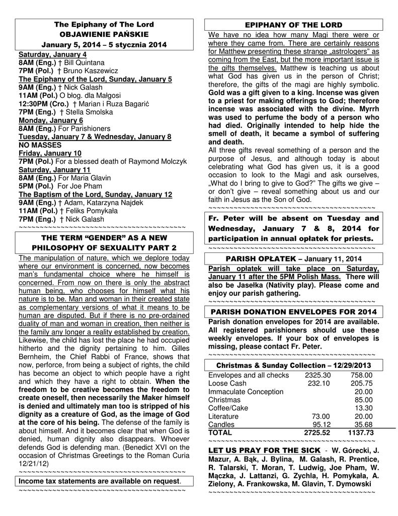 The Epiphany of The Lord OBJAWIENIE PAŃSKIE January 5, 2014 – 5 stycznia 2014 Saturday, January 4 8AM (Eng.) † Bill Quintana 7PM (Pol.) † Bruno Kaszewicz The Epiphany of the Lord, Sunday, January 5 9AM (Eng.) † Nick Galash 11AM (Pol.) O błog. dla Małgosi 12:30PM (Cro.) † Marian i Ruza Bagarić 7PM (Eng.) † Stella Smolska Monday, January 6 8AM (Eng.) For Parishioners Tuesday, January 7 & Wednesday, January 8 NO MASSES Friday, January 10 7PM (Pol.) For a blessed death of Raymond Molczyk Saturday, January 11 8AM (Eng.) For Maria Glavin 5PM (Pol.) For Joe Pham The Baptism of the Lord, Sunday, January 12 9AM (Eng.) † Adam, Katarzyna Najdek 11AM (Pol.) † Feliks Pomykała 7PM (Eng.) † Nick Galash ~~~~~~~~~~~~~~~~~~~~~~~~~~~~~~~~~~~~~~~~ THE TERM “GENDER” AS A NEW PHILOSOPHY OF SEXUALITY PART 2 The manipulation of nature, which we deplore today where our environment is concerned, now becomes man’s fundamental choice where he himself is concerned. From now on there is only the abstract human being, who chooses for himself what his nature is to be. Man and woman in their created state as complementary versions of what it means to be human are disputed. But if there is no pre-ordained duality of man and woman in creation, then neither is the family any longer a reality established by creation. Likewise, the child has lost the place he had occupied hitherto and the dignity pertaining to him. Gilles Bernheim, the Chief Rabbi of France, shows that now, perforce, from being a subject of rights, the child has become an object to which people have a right and which they have a right to obtain. When the freedom to be creative becomes the freedom to create oneself, then necessarily the Maker himself is denied and ultimately man too is stripped of his dignity as a creature of God, as the image of God at the core of his being. The defense of the family is about himself. And it becomes clear that when God is denied, human dignity also disappears. Whoever defends God is defending man. (Benedict XVI on the occasion of Christmas Greetings to the Roman Curia 12/21/12) ~~~~~~~~~~~~~~~~~~~~~~~~~~~~~~~~~~~~~~~~ Income tax statements are available on request. ~~~~~~~~~~~~~~~~~~~~~~~~~~~~~~~~~~~~~~~~ EPIPHANY OF THE LORD We have no idea how many Magi there were or where they came from. There are certainly reasons for Matthew presenting these strange „astrologers” as coming from the East, but the more important issue is the gifts themselves. Matthew is teaching us about what God has given us in the person of Christ; therefore, the gifts of the magi are highly symbolic. Gold was a gift given to a king. Incense was given to a priest for making offerings to God; therefore incense was associated with the divine. Myrrh was used to perfume the body of a person who had died. Originally intended to help hide the smell of death, it became a symbol of suffering and death. All three gifts reveal something of a person and the purpose of Jesus, and although today is about celebrating what God has given us, it is a good occasion to look to the Magi and ask ourselves, „What do I bring to give to God?” The gifts we give – or don’t give – reveal something about us and our faith in Jesus as the Son of God. ~~~~~~~~~~~~~~~~~~~~~~~~~~~~~~~~~~~~~~~~ Fr. Peter will be absent on Tuesday and Wednesday, January 7 & 8, 2014 for participation in annual opłatek for priests. ~~~~~~~~~~~~~~~~~~~~~~~~~~~~~~~~~~~~~~~~ PARISH OPŁATEK – January 11, 2014 Parish opłatek will take place on Saturday, January 11 after the 5PM Polish Mass. There will also be Jasełka (Nativity play). Please come and enjoy our parish gathering. ~~~~~~~~~~~~~~~~~~~~~~~~~~~~~~~~~~~~~~~~ PARISH DONATION ENVELOPES FOR 2014 Parish donation envelopes for 2014 are available. All registered parishioners should use these weekly envelopes. If your box of envelopes is missing, please contact Fr. Peter. ~~~~~~~~~~~~~~~~~~~~~~~~~~~~~~~~~~~~~~~~ Christmas & Sunday Collection – 12/29/2013 Envelopes and all checks 2325.30 758.00 Loose Cash 232.10 205.75 Immaculate Conception 20.00 Christmas 85.00 Coffee/Cake 13.30 Literature 73.00 20.00 Candles 95.12 35.68 TOTAL 2725.52 1137.73 ~~~~~~~~~~~~~~~~~~~~~~~~~~~~~~~~~~~~~~~~ LET US PRAY FOR THE SICK - W. Górecki, J. Mazur, A. Bąk, J. Bylina, M. Galash, R. Prentice, R. Talarski, T. Moran, T. Ludwig, Joe Pham, W. Mączka, J. Lattanzi, G. Zychla, H. Pomykała, A. Zielony, A. Frankowska, M. Glavin, T. Dymowski ~~~~~~~~~~~~~~~~~~~~~~~~~~~~~~~~~~~~~~~~ TRZECH KRÓLI – OBJAWIENIE PAŃSKIE Dlaczego Trzech KRÓLI? Przecież w Ewangelii nie ma mowy ani o królach, ani o liczbie. Najpierw zauważamy, że Ewangelista nie napisał o królach, ale o magach. Słowo spotykane dość często w Starym Testamencie. Wyrażeniem tym określano astrologów. Św. Mateusz krainę magów nazywa mianem „Wschód”. Za czasów Chrystusa rozumiano cały obszar na wschód od rzeki Jordan, czyli Arabię, Babilonię, Persję. Jedna z legend głosi, że któryś z tych magów pochodził z Afryki. Skąd takie przypuszczenie? W Psalmie 72 śpiewanego w czasie uroczystości; „Królowie Tarszisz i wysp przyniosą dary. Królowie Szeby i Saby złożą daninę. I oddadzą Mu pokłon wszyscy królowie...”. Prorok Izajasz mówi wprost o królach, którzy mają przybyć do Mesjasza, ale przytacza dary, jakie Mu mają złożyć: „Zaleje cię mnogość wielbłądów z Madianu i Efy. Wszyscy oni przybędą ze Saby, ofiarując złoto, kadzidło, nucąc radośnie hymn na cześć Pana” (Iz 60,6). Kadzidło i mirra były wówczas na wagę złota. Należały bowiem do najkosztowniejszych darów. Orygenes († 251) podaje liczbę trzy jako pierwszy wśród pisarzy chrześcijańskich. Królami zaś ich nazwał Cezary z Arles († 542). Dopiero od wieku VIII pojawiają się imiona trzech magów: Kacper, Melchior i Baltazar. Od XV/XVI wieków w kościołach poświęca się kadzidło i kredę. Kredą oznaczamy drzwi na znak, że w naszym mi