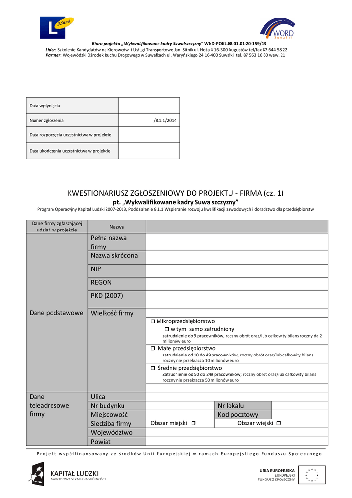 Biuro projektu „ Wykwalifikowane kadry Suwalszczyzny” WND-POKL.08.01.01-20-159/13 Lider: Szkolenie Kandydatów na Kierowców i Usługi Transportowe Jan Sitnik ul. Hoża 4 16-300 Augustów tel/fax 87 644 58 22 Partner: Wojewódzki Ośrodek Ruchu Drogowego w Suwałkach ul. Waryńskiego 24 16-400 Suwałki tel. 87 563 16 60 wew. 21 Data wpłynięcia Numer zgłoszenia /8.1.1/2014 Data rozpoczęcia uczestnictwa w projekcie Data ukończenia uczestnictwa w projekcie KWESTIONARIUSZ ZGŁOSZENIOWY DO PROJEKTU - FIRMA (cz. 1) pt. „Wykwalifikowane kadry Suwalszczyzny” Program Operacyjny Kapitał Ludzki 2007-2013, Poddziałanie 8.1.1 Wspieranie rozwoju kwalifikacji zawodowych i doradztwo dla przedsiębiorstw Dane firmy zgłaszającej udział w projekcie Nazwa Pełna nazwa firmy Nazwa skrócona NIP REGON PKD (2007) Dane podstawowe Wielkość firmy Mikroprzedsiębiorstwo w tym samo zatrudniony zatrudnienie do 9 pracowników, roczny obrót oraz/lub całkowity bilans roczny do 2 milionów euro Małe przedsiębiorstwo zatrudnienie od 10 do 49 pracowników, roczny obrót oraz/lub całkowity bilans roczny nie przekracza 10 milionów euro Średnie przedsiębiorstwo Zatrudnienie od 50 do 249 pracowników; roczny obrót oraz/lub całkowity bilans roczny nie przekracza 50 milionów euro Dane teleadresowe firmy Ulica Nr budynku Miejscowość Siedziba firmy Województwo Powiat Nr lokalu Kod pocztowy Obszar miejski Obszar wiejski Projekt współfinansowany ze środków Unii Europejskiej w ramach Europejskiego Funduszu Społecznego Biuro projektu „ Wykwalifikowane kadry Suwalszczyzny” WND-POKL.08.01.01-20-159/13 Lider: Szkolenie Kandydatów na Kierowców i Usługi Transportowe Jan Sitnik ul. Hoża 4 16-300 Augustów tel/fax 87 644 58 22 Partner: Wojewódzki Ośrodek Ruchu Drogowego w Suwałkach ul. Waryńskiego 24 16-400 Suwałki tel. 87 563 16 60 wew. 21 Telefon Adres e-mail Fax. Siedziby głównej Dane dotyczą: Oświadczam, iż podane wyżej dane są zgodne z prawdą: Filii Oddziału ………......................................................…................................................. miejscowość, data pieczęć podpis osoby upoważnionej do podejmowania decyzji w imieniu firmy Projekt współfinansowany ze środków Unii Europejskiej w ramach Europejskiego Funduszu Społecznego Biuro projektu „ Wykwalifikowane kadry Suwalszczyzny” WND-POKL.08.01.01-20-159/13 Lider: Szkolenie Kandydatów na Kierowców i Usługi Transportowe Jan Sitnik ul. Hoża 4 16-300 Augustów tel/fax 87 644 58 22 Partner: Wojewódzki Ośrodek Ruchu Drogowego w Suwałkach ul. Waryńskiego 24 16-400 Suwałki tel. 87 563 16 60 wew. 21 FORMULARZ ZGŁOSZENIOWY DO PROJEKTU - FIRMA (cz. 2) dane uzupełniające określające przynależność do określonej kategorii przedsiębiorców Oświadczam, iż reprezentowana przeze mnie firma posiada w chwili obecnej status: (dotyczy powiązań kapitałowych, prawie głosu lub dominującego wpływu firmy zgłaszającej się do udziału w projekcie z innymi firmami): A Przedsiębiorstwa niezależnego tj. przedsiębiorstwo, które nie ma żadnych przedsiębiorstw partnerskich ani związanych B Przedsiębiorstwa partnerskiego tj. przedsiębiorstwo, które posiada samodzielnie lub wspólnie z jednym lub kilkoma przedsiębiorstwami związanymi 25% lub więcej kapitału lub praw głosu w drugim przedsiębiorstwie. C Przedsiębiorstwa związanego tj. przedsiębiorstwa, które pozostają w jednym z poniższych związków: 1) przedsiębiorstwo posiada większość praw głosu w innym przedsiębiorstwie; lub 2) przedsiębiorstwo posiada prawo do powoływania lub odwoływania większości członków organu administracyjnego, zarządzającego lub nadzorczego innego przedsiębiorstwa; lub 3) przedsiębiorstwo posiada dominujący wpływ na działalność innego przedsiębiorstwa, lub; 4) przedsiębiorstwo kontroluje większość praw głosu w innym przedsiębiorstwie. Za przedsiębiorstwa związane uważa się przedsiębiorstwa pozostające w takim związku z: 1) jednym lub kilkoma przedsiębiorstwami; 2) osobą fizyczną lub grupą osób fizycznych działających wspólnie, jeżeli wykonują swoją działalność lub część swojej działalności na tym samym odpowiadającym rynku lub rynkach pokrewnych. Oświadczam, iż podane wyżej dane są zgodne z prawdą: ...................................................................................................... miejscowość, data pieczęć podpis osoby upoważnionej do podejmowania decyzji w imieniu firmy W przypadku zaznaczenia odpowiedzi B lub C prosimy o wskazanie następujących danych odnoszących się do przedsiębiorstw partnerskich lub związanych Typ powiązania z innym przedsiębiorstwem (partnerskie/ związane) Liczba osób zatrudnionych * (RJR) Roczny obrót* (w tys. euro) Całkowity bilans roczny * 1. 2. 3. Dane dotyczą w przedsiębiorstwa partnerskiego/związanego Projekt współfinansowany ze środków Unii Europejskiej w ramach Europejskiego Funduszu Społecznego Biuro projektu „ Wykwalifikowane kadry Suwalszczyzny” WND-POKL.08.01.01-20-159/13 Lider: Szkolenie Kandydatów na Kierowców i Usługi Transportowe Jan Sitnik ul. Hoża 4 16-300 Augustów tel/fax 87 644 58 22 Partner: Wojewódzki Ośrodek Ruchu Drogowego w Suwałkach ul. Waryńskiego 24 16-400 Suwałki tel. 87 563 16 60 wew. 21 Załącznik nr 1 do formularza zgłoszeniowego do projektu Oświadczenie o otrzymanej pomocy de minimis Oświadczam, że w okresie obejmującym bieżący rok kalendarzowy i poprzedzające go dwa lata kalendarzowe reprezentowana przeze mnie firma otrzymała nie otrzymała środki stanowiące pomoc de minimis. W przypadku otrzymania pomocy de minimis prosimy o wypełnienie poniższego zestawienia oraz załączenie kserokopii zaświadczeń potwierdzających otrzymanie pomocy de minimis. l.p. Organ udzielający pomocy de minimis Podstawa prawna Dzień udzielenia pomocy de minimis Wartość w Euro Nr programu pomocowego, umowy lub decyzji 1 