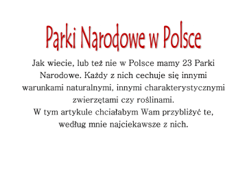 Jak wiecie, lub też nie w Polsce mamy 23 Parki Narodowe. Każdy z nich cechuje się innymi warunkami naturalnymi, innymi charakterystycznymi zwierzętami czy roślinami. W tym artykule chciałabym Wam przybliżyć te, według mnie najciekawsze z nich. Woliński Park Narodowy Dominującym krajobrazem jest pasmo wzniesień moreny czołowej graniczące z morzem i zalewem. Najwyższe klify osiągają wysokość 95 m. Abrazja klifowego wybrzeża corocznie przesuwa linię brzegu o około 80 cm. Wzgórza morenowe, które zajmują około 75% powierzchni parku najwyższą wysokość – 115,9 m n.p.m., osiągają w kulminacji Grzywacza. Drugim, pod względem zajmowanego obszaru jest krajobraz delty Świny z kilkudziesięcioma bagnistymi wysepkami, które rozdzielone są licznymi kanałami cieśniny Świny. Na tym terenie proces jego formowania jest również stale aktywny – corocznie zmienia się konfiguracja dna, powstają nowe płycizny, wysepki. Trzecim typem krajobrazu jest pojezierze z polodowcowymi jeziorami, ozami i kemami (okolice Warnowa). Niewielką część Parku zajmuje rozległy obszar sandru (Wapnica-Karnocice). We wschodniej części parku w pobliżu Warnowa i Wisełki, znajdują się polodowcowe jeziora: Warnowo Zachodnie, Warnowo Wschodnie, Jezioro Czajcze, Jezioro Domysłowskie, Zatorek i Wisełka. Dużą atrakcją parku są Ruchome Wydmy. W pigułce: Powierzchnia: 109,37 km2 Długość szlaków turystycznych: 44 km Siedziba: Międzyzdroje Symbol : Bielik Zwyczajny Rok założenia: 1960r. Białowieski Park Narodowy Białowieski Park Narodowy leży przy wododziale Wisły i Niemna. Na terenie parku nie ma żadnych jezior ani większych rzek. W puszczy ma swoje źródło rzeka Orłówka. Puszcza Białowieska jest najlepiej zachowanym lasem naturalnym na Niżu Europejskim. Ponad 2/3 powierzchni parku zajmują lasy liściaste. W miejscach zalewanych przez kilka miesięcy wodą, rosną olsy i łęgi, składające się głównie z olszy czarnej i jesionu. W suchszych miejscach rosną natomiast bory sosnowe, świerkowe i mieszane. Ogólnie flora parku liczy ponad 1000 gatunków roślin. Białowieski Park Narodowy charakteryzuje się dużą ilością martwego drewna. W Obszarze ochrony ścisłej zajmuje ono około 25% masy wszystkich drzew. Dzięki rozkładowi martwych pni do gleby wracają cenne substancje odżywcze, przywracające jej żyzność. Ponadto, martwe drewno staje się siedliskiem dla niezliczonej ilości organizmów saproksylicznych – grzybów, bakterii i bezkręgowców. Wiele z nich to gatunki zagrożone wyginięciem, niewystępujące nigdzie indziej w Europie. Symbolem parku jest żubr, gdyż właśnie w tym parku ocalono od zagłady to zwierzę. Żubry wyginęły już prawie całkowicie w XVIII wieku. Ich nieliczne populacje przeżyły jedynie na Kaukazie i w Puszczy Białowieskiej. W 1919 zabity został ostatni osobnik w Puszczy Białowieskiej. Wyginęła również populacja kaukaska. Do Białowieży zaczęto ściągać osobniki z ogrodów zoologicznych. Początkowo hodowane były na osobnym dziedzińcu. Obecnie w Białowieskiej Puszczy żyje około 750 żubrów (z czego około 440 po stronie polskiej), spośród 3000 na całym świecie; wszystkie pochodzą właśnie z białowieskiej hodowli. W pigułce: Powierzchnia: 105,17 km2 Długość szlaków turystycznych: 34,5 km Siedziba: Białowieża Symbol: Żubr Rok założenia: 1932r. Bieszczadzki Park Narodowy Bieszczadzki Park Narodowy jest trzecim co do wielkości parkiem narodowym na terenie Polski. Roślinność stanowi ok. 780 gatunków roślin naczyniowych, 250 gatunków mchów, 500 gatunków porostów i 1000 gatunków grzybów. Około 30 to endemiczne gatunki wschodniokarpackie, np. tojad wschodniokarpacki i tauryjski, goździk kartuzek, goździk skalny, lepnica karpacka, pszeniec biały. Spośród 230 gatunków kręgowców, w parku można spotkać takie zwierzęta jak: jeleń, ryś, żmija, żbik, sarna, dzik, niedźwiedź brunatny, wilk, orzeł przedni, orlik krzykliwy, puchacz, wąż Eskulapa, żubr, puszczyk uralski Poza kręgowcami jest też dużo wyjątkowych pierścienic, owadów i pajęczaków. W pigułce: Powierzchnia: 292,02 km2 Długość szlaków turystycznych: 206 km Siedziba: Ustrzyki Górne Symbol: Ryś Rok założenia: 1973r. Park Narodowy „Bory Tucholskie” Charakterystycznym elementem ukształtowania terenu są rynny polodowcowe o przebiegu południkowym. Przykładem jest Rynna Jeziora Charzykowskiego, stanowiącego fragment zachodniej granicy parku. Wytopiska, powstałe w wyniku topnienia martwego lodu, przybrały kształt kotłów, lejków lub nieregularnych obniżeń terenu. W obrębie parku znajduje się 21 jezior, z których największe i najgłębsze to Jezioro Ostrowite. Osiem z nich jest ze sobą połączonych i tworzy ciąg nazwany Strugą Siedmiu Jezior. Cztery jeziora – Wielkie Gacno, Małe Gacno, Nierybno i Głuche to jeziora lobeliowe. W parku przeważają gleby bielicowe. Na skałę macierzystą składa się piasek sandrowy i lodowcowy, czasem glina zwałowa, w pobliżu rzek dominują osady akumulacyjne. W pigułce: Powierzchnia: 46,13 km2 Długość szlaków turystycznych: brak danych Siedziba: Charzykowy Symbol: Głuszec Rok założenia: 1996r. Tatrzański Park Narodowy Klimat Tatr, a co za tym idzie ich roślinność, charakteryzuje się piętrowością. Piętro najniższe, czyli piętro regla dolnego, porastają bory świerkowe z niewielką domieszką jodły, buka i jaworu. Regiel górny to prawie wyłącznie bór świerkowy, rzadko tylko występuje reliktowy bór limbowo-świerkowy. Piętro kosówki porasta roślinność krzewiasta z przewagą kosodrzewiny. Piętro hal to murawy wysokogórskie z bogatą roślinnością alpejską. Można tu spotkać m.in. wiele gatunków goryczek, goździka lodowcowego, sasankę alpejską. W piętrze turni roślin jest niewiele, choć niektóre z nich są silnie przywiązane do tego piętra wysokościowego np. goryczka przezroczysta i ja