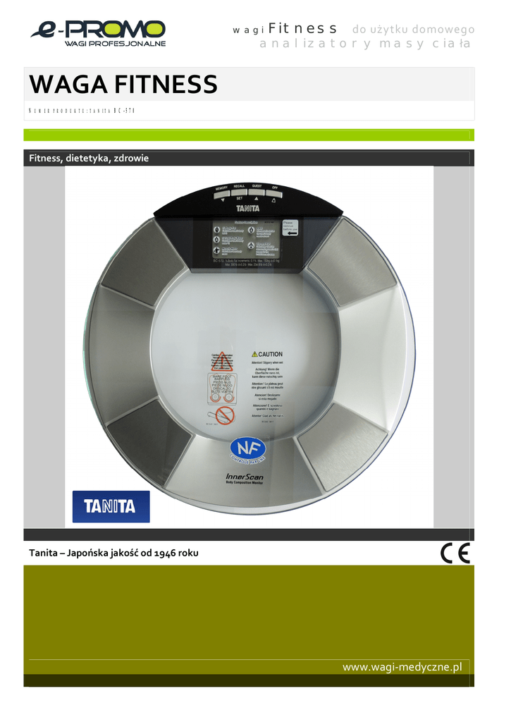w ag i Fitness do u ytku domowego analizatory masy cia a WAGA FITNESS NUMER PRODUKTU: TANITA BC-570 Fitness, dietetyka, zdrowie Tanita – Japo ska jako od 1946 roku www.wagi-medyczne.pl w ag i Fitness do u ytku domowego analizatory masy cia a WAGA FITNESS NUMER PRODUKTU: TANITA BC-570 Opis produktu Analizator masy cia a do domowego u ytku polecany jest wszystkim osobom dbaj cym o utrzymanie swojego organizmu w dobrej kondycji, chc cych pozna pe ny obraz ich wewn trznego zdrowia. Jednocze nie informujemy i analizator nie jest przeznaczony do diagnozowania lub leczenia chorób i zaburze . Prosimy skonsultowa si z lekarzem w razie wszystkich pyta lub w tpliwo ci dotycz cych Pa stwa zdrowia. Osobom odchudzaj cym si analizator pozwoli na bie kontrol czy stosowana dieta jest odpowiednia i proces odchudzania przebiega prawid owo, czy nie nast puje niekorzystna zbyt gwa towna utrata tkanki mi niowej czy te wody w organizmie. Polecana równie dla osób aktywnych, chc cych prowadzi zdrowy tryb ycia, dbaj cych o adn sylwetk by na bie co mia y wp yw i wiadomo zdrowego rozwoju swojego cia a. Analizatory sk adu cia a daj Ci wgl d w kluczowe wska niki zdrowotne, które pozwol Ci na monitorowanie wp ywu zmian w stylu ycia: › Mo esz kontrolowa wp yw diety na Twoje cia o, aby upewni si czy dobra odpowiedni sposób ywienia dostosowany dla Ciebie. › Mo esz kontrolowa post py w przybieraniu na masie mi niowej, oraz sprawdza swój wiek metaboliczny. › Mo esz sprawdza ilo t uszczu trzewnego, który jest g ównym wska nikiem ryzyka wyst pienia cukrzycy typu 2 i chorób serca. › Mo esz obra sobie cel dla Twojej sylwetki i monitorowa post pów w tym kierunku. Specyfikacja: › Metoda pomiaru - BIA (bio-elektryczna analiza impedancji) – pomiar przez stopy › Maksymalna no no – 150 kg › Dok adno wa enia – 100g Analiza cia a: › Masa cia a (kg) › Zawarto tkanki t uszczowej (%) › Masa mi niowa (kg) › Ca kowita zawarto wody w organizmie (%) › Podstawowa przemiana materii - BMR › Zawarto wisceralnej tkanki t uszczowej Funkcje wagi: › Pami pomiarów dla 4 osób › Funkcja tylko waga – wa enie bez wykonania analizy ca a › Funkcja go – jednorazowe u ycie › Funkcja „Atleta” › Funkcja przypomnienia – poprzednie odczyty › Funkcja auto-off – automatyczne wy czenie wagi po 10-20 sekundach › Prze czanie jednostek kg/lb Dane techniczne: › Zasilanie bateryjne 2 baterie CR2032 (baterie za czone w dostawie) › Wy wietlacz LCD – wysoko cyfr 27 mm › Obudowa z tworzywa, pomost z hartowanego szk a o grubo ci 5mm z prze roczystymi elektrodami www.wagi-medyczne.pl ul. Bonarka 21, 30-415 Kraków, tel./fax: +48 12 263 73 27, e-mail: [email protected] Zastrzegamy sobie prawo do pomy ek i zmian technicznych. Karta Katalogowa: Data utworzenia 2013-03-25 14:05:00, aktualizacja: 2013-03-27, waga-Tanita-bc-570-karta-katalogowa w ag i Fitness do u ytku domowego analizatory masy cia a Jak to dzia a Jak to dzia a: Analizator sk adu cia a Tanita oblicza sk ad cia a za pomoc bioimpedancji elektrycznej (BIA). Bezpieczne, o niskim poziomie sygna y elektryczne przechodz przez cia o poprzez opatentowane elektrody Tanita znajduj ce si na platformie analizatora. Sygna z atwo ci przep ywa przez p yny w mi niach i innych tkankach cia a, lecz przechodz c przez tkank t uszczow napotyka opór, poniewa zawiera niewielkie ilo ci p ynów. Opór ten nazywa si impedancj . Odczyty impedancji s nast pnie wprowadzone do medycznie ustalonych formu matematycznych do obliczenia sk adu cia a. Kiedy najlepiej u ywa analizatora: Poziom wody w organizmie w sposób naturalny mo e ulega wahaniom w ci gu dnia i nocy. Wszelkie istotne zmiany w zawarto ci wody w ciele mog wp ywa na organizm. Cia o ma tendencj do dehydratacji po d ugiej nocy, wi c rano masa cia a b dzie ni sza, a procentowa zawarto t uszczu wy sza. Jedzenie du ych posi ków, picie alkoholu, menstruacja, choroba, k piel mo e równie powodowa zmiany w poziomie nawodnienia. Aby uzyska najbardziej wiarygodne odczyty zalecane jest wykonywanie pomiaru przed kolacj . Interpretacja wyników Czym jest procentowa zawarto t uszczu: Procentowa zawarto tkanki t uszczowej w organizmie ustalana jest w stosunku do masy cia a. Ograniczenie poziomu uszczu w organizmie wykaza o, zmniejszenie ryzyka wyst pienia pewnych schorze , takich jak wysokie ci nienie krwi, choroby serca, cukrzycy i nowotwory. Poni szy wykres pokazuje wahanie w tkance t uszczowej. Analizator Sk adu Cia a automatycznie porównuje zawarto uszczu w organizmie do prawid owej zawarto ci na wykresie. Gdy warto zostanie obliczona, czarny pasek zacznie miga w dolnej cz ci ekranu, wskazuj c, gdzie mie ci si zakres dla danego wieku i p ci. www.wagi-medyczne.pl ul. Bonarka 21, 30-415 Kraków, tel./fax: +48 12 263 73 27, e-mail: [email protected] Zastrzegamy sobie prawo do pomy ek i zmian technicznych. Karta Katalogowa: Data utworzenia 2013-03-25 14:05:00, aktualizacja: 2013-03-27, waga-Tanita-bc-570-karta-katalogowa w ag i Fitness do u ytku domowego analizatory masy cia a Czym jest procentowa zawarto wody w ciele: Woda odgrywa istotn rol w wielu procesach organizmu i wyst puje w ka dej komórce, tkance i narz dzie. Utrzymanie zdrowego poziomu wody zapewnia efektywne funkcjonowanie organizmu i zmniejsza ryzyko wyst pienia problemów zdrowotnych z tym zwi zanych. Poziom wody w organizmie mo e naturalnie zmienia si przez ca y dzie i ca noc. Cia o ma tendencj do dehydratacji po d ugiej nocy st d ró nice w p ynie mi dzy dniem i noc . Jedzenie du ych posi ków, picie alkoholu, menstruacja, choroba, k piel mog tak e powodowa ró nice w poziomie nawodnienia. rednia procentowa zawarto doros ego wynosi: wody dla zdrowego Kobieta: 45 do 60% czyzna: od 50 do 65% ród o: Na podstawie bada wewn trznych Tanita Uwaga: ca kowity procent wody w organizmie b dzie mia tendencj do obni ania si z wiekiem, jednocze nie procent tkanki t uszczowej w organizmie wzrasta. Wa ne jest, aby szuka d ugoterminowych zmian w ca kowitej zawarto ci