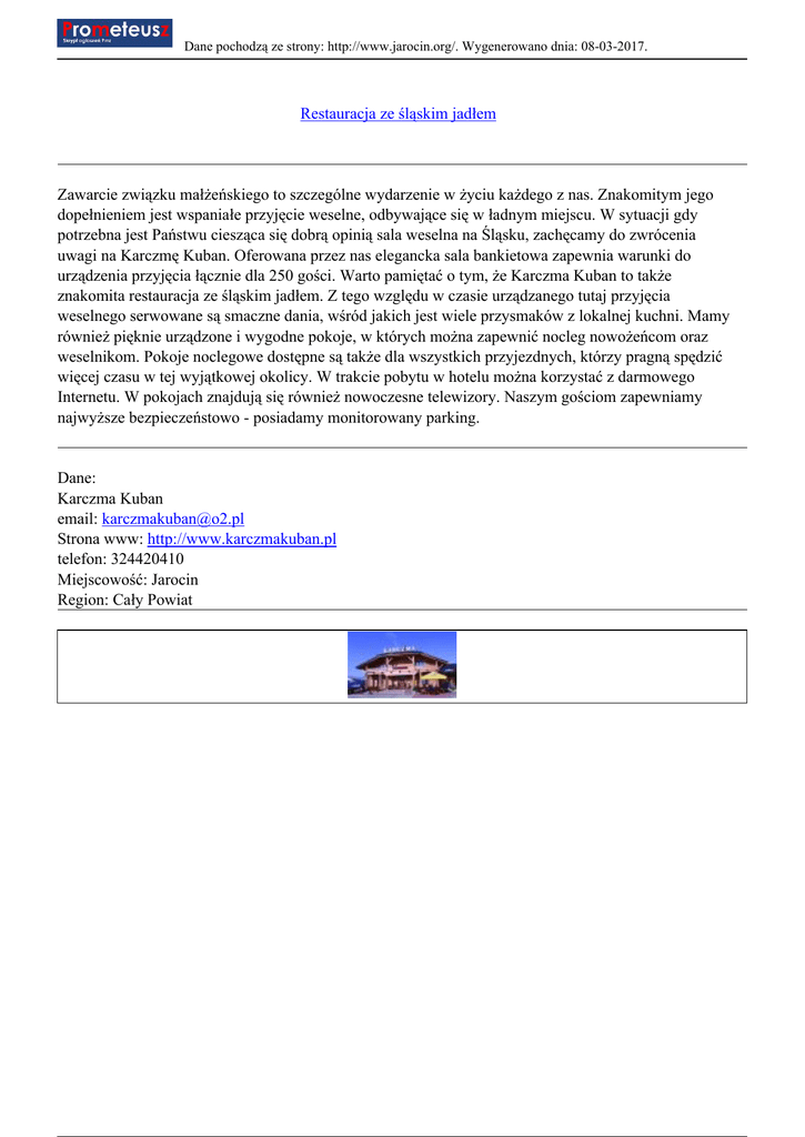 Dane pochodzą ze strony: http://www.jarocin.org/. Wygenerowano dnia: 08-03-2017. Restauracja ze śląskim jadłem Zawarcie związku małżeńskiego to szczególne wydarzenie w życiu każdego z nas. Znakomitym jego dopełnieniem jest wspaniałe przyjęcie weselne, odbywające się w ładnym miejscu. W sytuacji gdy potrzebna jest Państwu ciesząca się dobrą opinią sala weselna na Śląsku, zachęcamy do zwrócenia uwagi na Karczmę Kuban. Oferowana przez nas elegancka sala bankietowa zapewnia warunki do urządzenia przyjęcia łącznie dla 250 gości. Warto pamiętać o tym, że Karczma Kuban to także znakomita restauracja ze śląskim jadłem. Z tego względu w czasie urządzanego tutaj przyjęcia weselnego serwowane są smaczne dania, wśród jakich jest wiele przysmaków z lokalnej kuchni. Mamy również pięknie urządzone i wygodne pokoje, w których można zapewnić nocleg nowożeńcom oraz weselnikom. Pokoje noclegowe dostępne są także dla wszystkich przyjezdnych, którzy pragną spędzić więcej czasu w tej wyjątkowej okolicy. W trakcie pobytu w hotelu można korzystać z darmowego Internetu. W pokojach znajdują się również nowoczesne telewizory. Naszym gościom zapewniamy najwyższe bezpieczeństowo - posiadamy monitorowany parking. Dane: Karczma Kuban email: [email protected] Strona www: http://www.karczmakuban.pl telefon: 324420410 Miejscowość: Jarocin Region: Cały Powiat