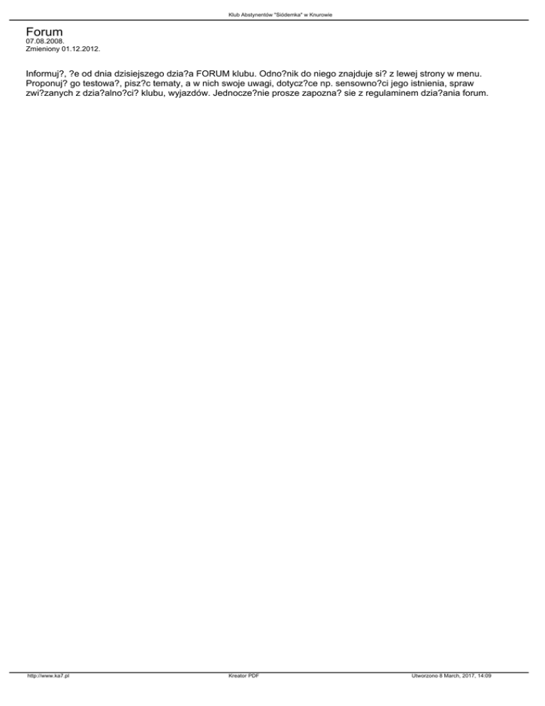 Klub Abstynentów "Siódemka" w Knurowie Forum 07.08.2008. Zmieniony 01.12.2012. Informuj?, ?e od dnia dzisiejszego dzia?a FORUM klubu. Odno?nik do niego znajduje si? z lewej strony w menu. Proponuj? go testowa?, pisz?c tematy, a w nich swoje uwagi, dotycz?ce np. sensowno?ci jego istnienia, spraw zwi?zanych z dzia?alno?ci? klubu, wyjazdów. Jednocze?nie prosze zapozna? sie z regulaminem dzia?ania forum. http://www.ka7.pl Kreator PDF Utworzono 8 March, 2017, 14:09