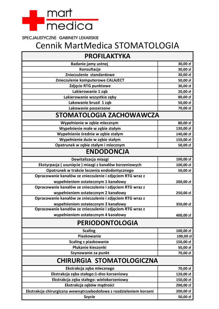 Cennik MartMedica STOMATOLOGIA