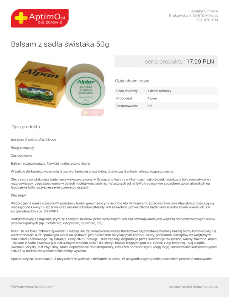 Apteka OPTIMA Krakowska 4, 63-510 Mikstat 531-470-109 Balsam z sadła świstaka 50g cena produktu: 17,99 PLN Opis słownikowy Czas dostawy 1 dzień roboczy Producent Alpine Zastosowanie Ból Opis produktu BALSAM Z SADŁA ŚWISTAKA Rozgrzewający Zastosowanie Balsam rozgrzewający. Nawilża i uelastycznia skórę. W trakcie delikatnego wcierania łatwo wchłania się przez skórę, dostarcza tkankom miłego, kojącego ciepła. Olej z sadła świstaka jest tradycyjnie wykorzystywany w Szwajcarii, Austrii i w Niemczech jako środek łagodzący bóle reumatyczne i rozgrzewający. Jego stosowanie w bólach i dolegliwościach reumatycznych od lat by?o tradycyjnym sposobem górali alpejskich na łagodzenie bólu i przyspieszenie gojenia po urazach. Dlaczego? Współczesna nauka uzasadni?a podstawy tradycyjnej medycyny rejonów Alp. W tkance tłuszczowej Świstaka Alpejskiego znajdują się nienasycone kwasy tłuszczowe oraz naturalne kortykosterydy. Ich zawartość potwierdzona badaniami analitycznymi wynosi ok. 2% kortykosterydów i ok. 5% NNKT. Kortykosterydy są najsilniejszym ze znanych środków przeciwzapalnych. Ich siła oddziaływania jest większa od niesteroidowych leków przeciwzapalnych (np. diclofenac, ketoprofen, ibubrofen, itd.) NNKT to nie tylko "zdrowa żywność". Okazuje się, że nienasycone kwasy tłuszczowe są podstawą budowy każdej błony komórkowej. Są wszechobecne, a ich "podwójna warstwa lipidowa" jest płaszczem okrywającym komórki skóry, podskórne, narządów wewnętrznych oraz układu nerwowego. Są sytuacje, kiedy NNKT brakuje - stan zapalny, degradacja przez substancje toksyczne, wirusy, bakterie. Alpan - Balsam z sadła świstaka jest naturalnym źródłem NNKT dla skóry i tkanek leżących pod nią. Górale z Alp twierdzą - olej z sadła świstaka "czysty" jest zbyt silny. Może doprowadzić do osteoporozy, zaburzeń hormonalnych. Mają rację. Dostarczenie kortykosterydów i NNKT w nadmiarze właśnie takie efekty wywiera. Sposób użycia: Stosować 2 -3 razy dziennie wcierając delikatnie w skórę. W przypadku wystąpienia podrażnień przerwać stosowanie. Plik wygenerowano: 08-03-2017 Oprogramowanie sklepu: AptusShop Apteka OPTIMA Krakowska 4, 63-510 Mikstat 531-470-109 Preparat doskonale się wchłania. Nie pozostawia na skórze tłustej poświaty, ani uczucia lepkości. Opakowanie: Słoik 50 g Plik wygenerowano: 08-03-2017 Powered by TCPDF (www.tcpdf.org) Oprogramowanie sklepu: AptusShop