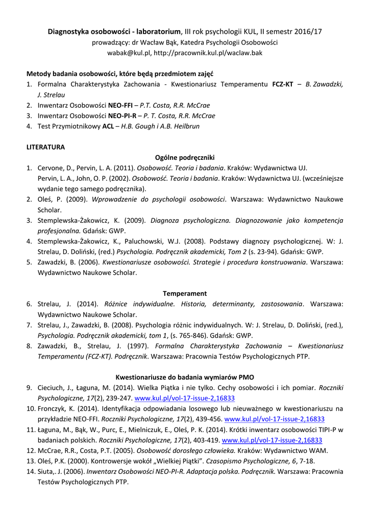 Diagnostyka osobowości - laboratorium, III rok psychologii KUL, II