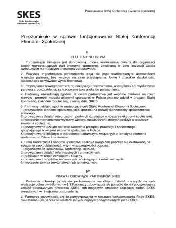 Porozumienie Stałej Konferencji Ekonomii Społecznej Porozumienie w sprawie funkcjonowania Stałej Konferencji Ekonomii Społecznej §1 CELE PARTNERSTWA 1. Porozumienie niniejsze jest dobrowolną umową wielostronną otwartą dla organizacji i osób reprezentujących nurt ekonomii społecznej, zawieraną w celu realizacji zadań społecznych nie mających charakteru zarobkowego. 2. Wszyscy sygnatariusze porozumienia stają się jego równoprawnymi uczestnikami w randze partnera, bez względu na czas przystąpienia, formę i charakter działalności, wielkość czy uzyskiwane wyniki finansowe. 3. Przystąpienie nowego partnera do niniejszego porozumienia, wystąpienie lub wykluczenie partnera z porozumienia, są traktowane jako aneks do porozumienia. 4. Partnerzy oświadczają zgodnie, iż celem partnerstwa jest wspólne działanie na rzecz rozwoju i promocji modelu ekonomii społecznej w Polsce poprzez udział w pracach Stałej Konferencji Ekonomii Społecznej, zwanej dalej SKES. 5. Partnerzy ustalają zgodnie następujące cele Stałej Konferencji Ekonomii Społecznej: 1) promowanie ekonomii społecznej jako sposobu na rozwój ekonomiczny społeczeństwa polskiego, 2) prowadzenie działań integrujących podmioty działające w obszarze ekonomii społecznej, 3) tworzenie mechanizmów wymiany wiedzy, doświadczeń i dobrych praktyk w obszarze ekonomii społecznej, 4) podejmowanie działań na rzecz tworzenia porządku prawnego i społecznego sprzyjającego rozwojowi ekonomii społecznej w Polsce, 5) podejmowanie inicjatyw o charakterze badawczym związanych z tematyką ekonomii społecznej w Polsce i na świecie. 6. Stała Konferencja Ekonomii Społecznej realizuje swoje cele poprzez nie nastawioną na osiąganie zysku działalność, w tym w szczególności poprzez: 1) organizowanie seminariów, konferencji i szkoleń, 2) prowadzenie działań informacyjnych i promocyjnych, 3) publikacje w formie czasopism i książek, 4) prowadzenie projektów badawczych, edukacyjnych i wdrożeniowych, 5) tworzenie struktur terytorialnych lub tematycznych. §2 PRAWA I OBOWIĄZKI PARTNERÓW SKES 1. Partnerzy zobowiązują się do podejmowania wspólnych działań mających na celu realizację celów określonych w § 1.Partnerzy zobowiązują się ponadto do nie podejmowania działań skierowanych przeciwko SKES, lub mogących utrudniać realizację zadań SKES określonych w niniejszym porozumieniu. 2. Partnerzy zobowiązują się do partycypowania w kosztach funkcjonowania Rady SKES, Sekretariatu SKES oraz w kosztach innych inicjatyw podejmowanych przez SKES. 1 Porozumienie Stałej Konferencji Ekonomii Społecznej 3. Rada SKES z zastrzeżeniem § 3 ust. 4 uchwala obowiązek, zasady i wysokość uiszczania składki członkowskiej przez partnerów SKES. 4. Partnerzy deklarują, w ramach posiadanych możliwości, zapewniać tzw. wkład krajowy w przypadku ubiegania się o dofinansowanie ze środków funduszy celowych krajowych lub zagranicznych. 5. Partnerzy mają prawo do nieodpłatnego korzystania z dorobku SKES. Zasady korzystania z majątku trwałego zgromadzonego w ramach SKES zostaną zawarte w odrębnym regulaminie, do uchwalenia którego zobowiązana jest Rada SKES. 6. Partnerzy mają prawo do informowania swojego otoczenia o fakcie uczestniczenia w pracach SKES w randze partnera. §3 RADA SKES 1. Rada SKES jest naczelnym organem SKES składającym się z przedstawicieli wszystkich partnerów. 2. Każdy z partnerów SKES ma równe prawo głosu w sprawach SKES. 3. Rada SKES jest uprawniona do podejmowania wszystkich decyzji w sprawach funkcjonowania SKES. W przypadku decyzji o charakterze majątkowym przedstawiciele partnerów są zobowiązani do okazania pisemnych pełnomocnictw do zawierania stosownych zobowiązań majątkowych. 4. Rada SKES z zastrzeżeniem ust. 5 i 9 podejmuje decyzje na zasadzie zwykłej większości głosów osób obecnych na posiedzeniu Rady SKES. Decyzje Rady SKES nie są wiążące dla Partnerów, którzy wyrażą sprzeciw wobec danej decyzji. Partnerzy SKES deklarują wolę dążenia do konsensusu w sprawach funkcjonowania SKES. 5. Decyzja w sprawie wykluczenia Partnera SKES lub Członka SKES jest podejmowana przez Radę SKES bezwzględną większością głosów przy obecności przynajmniej połowy wszystkich członków Rady SKES, przy czym nie posiada prawa głosu Partner SKES, którego dotyczy decyzja o wykluczeniu. 6. Rada SKES wyłania ze swojego grona Przewodniczącego oraz Sekretarza w celu usprawnienia organizacji pracy Rady. Rada zobowiązana jest uchwalić regulamin pracy Rady, wskazujący w szczególności zasady powoływania Przewodniczącego i Sekretarza, ich uprawnienia oraz długość ich kadencji. 7. Rada SKES może podjąć decyzję o powołaniu Komisji Rewizyjnej, której zadaniem będzie kontrola gospodarki finansowej SKES. W takim wypadku Rada SKES zobowiązana jest określić regulamin pracy Komisji Rewizyjnej. 8. Rada SKES obraduje na posiedzeniach zwoływanych nie rzadziej niż co 3 miesiące przez Sekretariat SKES lub Przewodniczącego. Posiedzenie Rady może zostać ponadto zwołane na wniosek każdego z partnerów SKES. 9. Rada SKES bezwzględną większością głosów przy obecności przynajmniej połowy wszystkich członków Rady SKES uchwala regulamin tworzenia struktur terytorialnych i tematycznych. §4 SEKRETARIAT SKES 1. Partnerzy wyrażają zgodę na utworzenie Sekretariatu SKES jako organu pomocniczego Rady SKES, odpowiedzialnego za realizację jej decyzji oraz za bieżące funkcjonowanie SKES. 2 Porozumienie Stałej Konferencji Ekonomii Społecznej 2. Partnerzy zgodnie wskażą na piśmie osobę prawną, która będzie prowadziła Sekretariat SKES. 3. Rada SKES określi w odrębnym regulaminie zasady funkcjonowania Sekretariatu SKES, zasady wyłaniania osoby prawnej wskazanej w ust. 2, jej uprawnienia oraz czas pełnienia przez nią tej funkcji. 4. Osoba prawna wskazana w ust. 2 w szczególności będzie uprawniona do: 1) reprezentowa