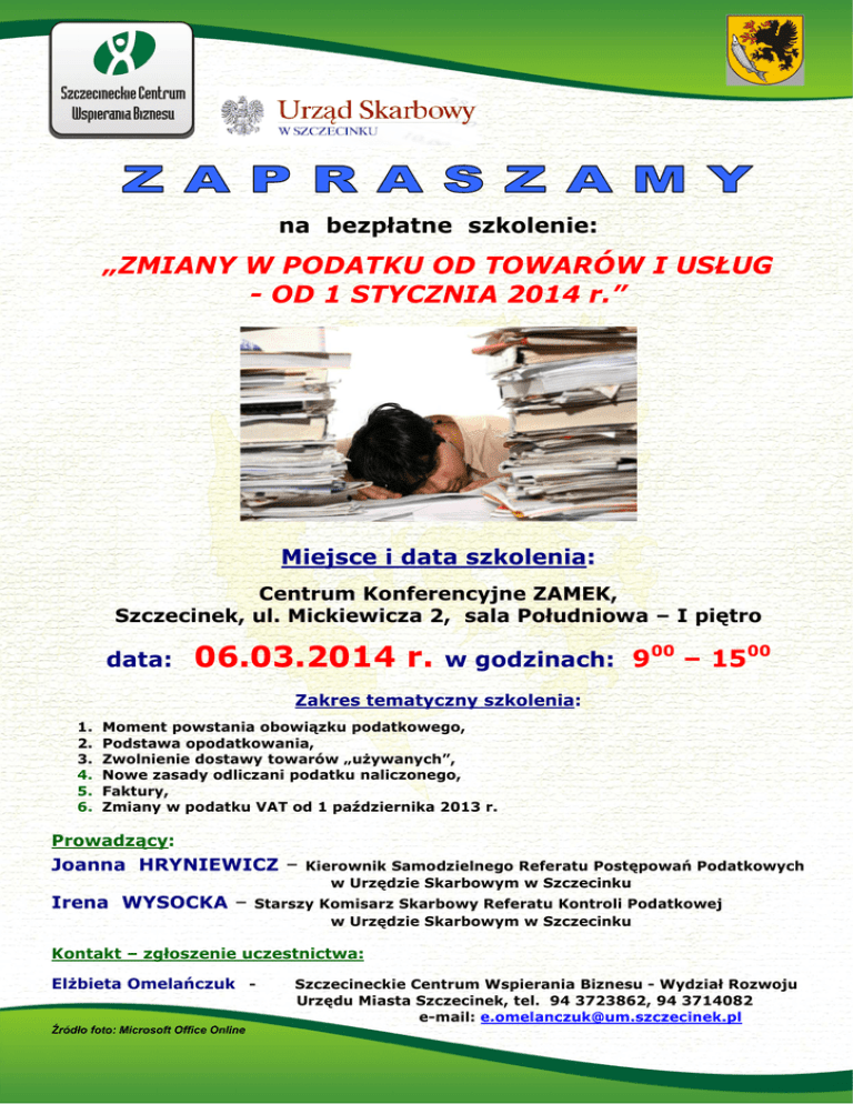na bezpłatne szkolenie: „ZMIANY W PODATKU OD TOWARÓW I USŁUG - OD 1 STYCZNIA 2014 r.” Miejsce i data szkolenia: Centrum Konferencyjne ZAMEK, Szczecinek, ul. Mickiewicza 2, sala Południowa – I piętro data: 06.03.2014 r. w godzinach: 9 00 – 1500 Zakres tematyczny szkolenia: 1. 2. 3. 4. 5. 6. Moment powstania obowiązku podatkowego, Podstawa opodatkowania, Zwolnienie dostawy towarów „używanych”, Nowe zasady odliczani podatku naliczonego, Faktury, Zmiany w podatku VAT od 1 października 2013 r. Prowadzący: Joanna HRYNIEWICZ – Irena WYSOCKA – Kierownik Samodzielnego Referatu Postępowań Podatkowych w Urzędzie Skarbowym w Szczecinku Starszy Komisarz Skarbowy Referatu Kontroli Podatkowej w Urzędzie Skarbowym w Szczecinku Kontakt – zgłoszenie uczestnictwa: Elżbieta Omelańczuk - Szczecineckie Centrum Wspierania Biznesu - Wydział Rozwoju Urzędu Miasta Szczecinek, tel. 94 3723862, 94 3714082 e-mail: [email protected] Źródło foto: Microsoft Office Online Adres: 78-400 Szczecinek, Plac Wolności 7, tel. 094 - 372 38 62, e-mail: [email protected] res: 78-400 Szczecinek, Plac Wolności 7, tel. 094 - 372 38 62, e-mail: [email protected]