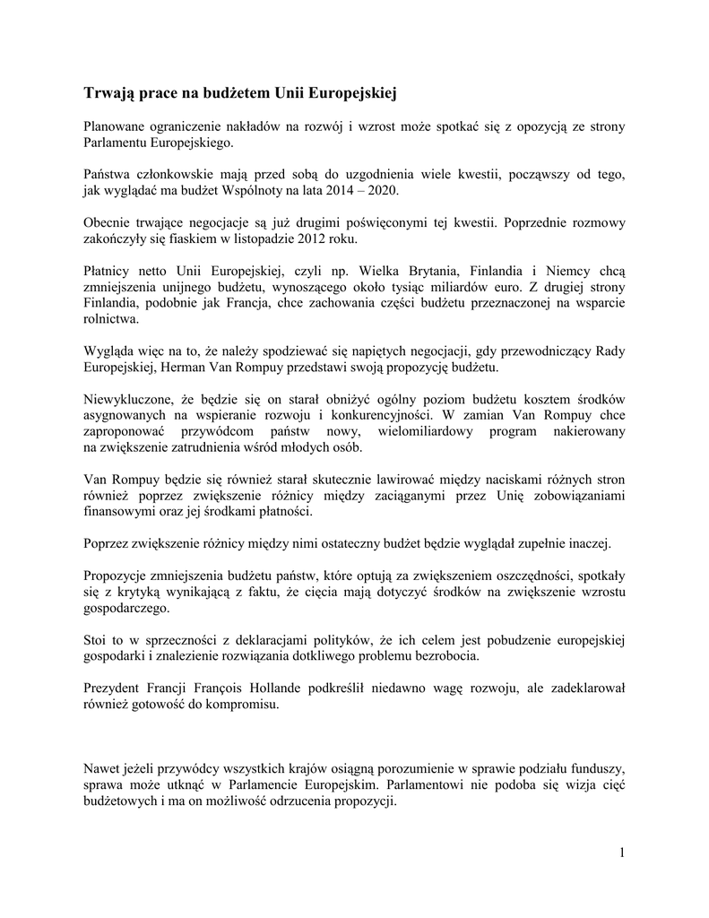 Trwają prace na budżetem Unii Europejskiej Planowane ograniczenie nakładów na rozwój i wzrost może spotkać się z opozycją ze strony Parlamentu Europejskiego. Państwa członkowskie mają przed sobą do uzgodnienia wiele kwestii, począwszy od tego, jak wyglądać ma budżet Wspólnoty na lata 2014 – 2020. Obecnie trwające negocjacje są już drugimi poświęconymi tej kwestii. Poprzednie rozmowy zakończyły się fiaskiem w listopadzie 2012 roku. Płatnicy netto Unii Europejskiej, czyli np. Wielka Brytania, Finlandia i Niemcy chcą zmniejszenia unijnego budżetu, wynoszącego około tysiąc miliardów euro. Z drugiej strony Finlandia, podobnie jak Francja, chce zachowania części budżetu przeznaczonej na wsparcie rolnictwa. Wygląda więc na to, że należy spodziewać się napiętych negocjacji, gdy przewodniczący Rady Europejskiej, Herman Van Rompuy przedstawi swoją propozycję budżetu. Niewykluczone, że będzie się on starał obniżyć ogólny poziom budżetu kosztem środków asygnowanych na wspieranie rozwoju i konkurencyjności. W zamian Van Rompuy chce zaproponować przywódcom państw nowy, wielomiliardowy program nakierowany na zwiększenie zatrudnienia wśród młodych osób. Van Rompuy będzie się również starał skutecznie lawirować między naciskami różnych stron również poprzez zwiększenie różnicy między zaciąganymi przez Unię zobowiązaniami finansowymi oraz jej środkami płatności. Poprzez zwiększenie różnicy między nimi ostateczny budżet będzie wyglądał zupełnie inaczej. Propozycje zmniejszenia budżetu państw, które optują za zwiększeniem oszczędności, spotkały się z krytyką wynikającą z faktu, że cięcia mają dotyczyć środków na zwiększenie wzrostu gospodarczego. Stoi to w sprzeczności z deklaracjami polityków, że ich celem jest pobudzenie europejskiej gospodarki i znalezienie rozwiązania dotkliwego problemu bezrobocia. Prezydent Francji François Hollande podkreślił niedawno wagę rozwoju, ale zadeklarował również gotowość do kompromisu. Nawet jeżeli przywódcy wszystkich krajów osiągną porozumienie w sprawie podziału funduszy, sprawa może utknąć w Parlamencie Europejskim. Parlamentowi nie podoba się wizja cięć budżetowych i ma on możliwość odrzucenia propozycji. 1 W niedawnej wypowiedzi na ten temat Joseph Daul, przywódca Europejskiej Partii Ludowej, największego ugrupowania Parlamentu Europejskiego, zapowiedział odrzucenie wniosku. Daul przypomniał, że skąpstwo krajów członkowskich zagroziło już np. unijnemu programowi wymiany studenckiej Erasmus. Parlament chciałby, żeby środki mogły być przekazywane na różne programy w różnych latach w sposób bardziej elastyczny. Oprócz kwestii budżetowych i związanych z nimi cięć, sprawą otwartą pozostaje również zwrot opłat członkowskich w przypadku Wielkiej Brytanii i paru innych krajów członkowskich. Również Finlandia jest gotowa domagać się rekompensaty za wpłacone przez siebie opłaty członkowskie, jeżeli negocjacje nie ułożą się zgodnie z jej oczekiwaniami. Źródło: Helsingin Sanomat, 07.02.2013 Tłumaczenie robocze: Paweł Błaszczyk, WPHI Helsinki 2