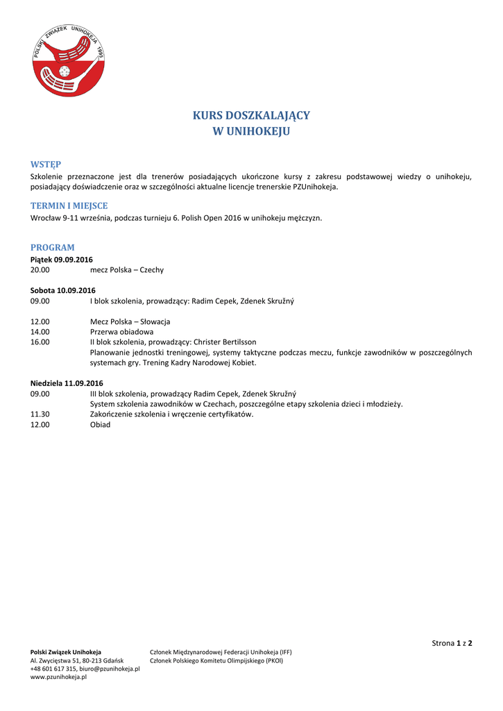 KURS DOSZKALAJĄCY W UNIHOKEJU WSTĘP Szkolenie przeznaczone jest dla trenerów posiadających ukończone kursy z zakresu podstawowej wiedzy o unihokeju, posiadający doświadczenie oraz w szczególności aktualne licencje trenerskie PZUnihokeja. TERMIN I MIEJSCE Wrocław 9-11 września, podczas turnieju 6. Polish Open 2016 w unihokeju mężczyzn. PROGRAM Piątek 09.09.2016 20.00 mecz Polska – Czechy Sobota 10.09.2016 09.00 I blok szkolenia, prowadzący: Radim Cepek, Zdenek Skružný 12.00 14.00 16.00 Mecz Polska – Słowacja Przerwa obiadowa II blok szkolenia, prowadzący: Christer Bertilsson Planowanie jednostki treningowej, systemy taktyczne podczas meczu, funkcje zawodników w poszczególnych systemach gry. Trening Kadry Narodowej Kobiet. Niedziela 11.09.2016 09.00 III blok szkolenia, prowadzący Radim Cepek, Zdenek Skružný System szkolenia zawodników w Czechach, poszczególne etapy szkolenia dzieci i młodzieży. 11.30 Zakończenie szkolenia i wręczenie certyfikatów. 12.00 Obiad Strona 1 z 2 Polski Związek Unihokeja Al. Zwycięstwa 51, 80-213 Gdańsk +48 601 617 315, [email protected] www.pzunihokeja.pl Członek Międzynarodowej Federacji Unihokeja (IFF) Członek Polskiego Komitetu Olimpijskiego (PKOl) KADRA SZKOLENIOWA Radim Cepek (Czechy) - Jeden z najlepszych zawodników w historii Czech. W Reprezentacji Czech wystąpił 128 razy, strzelając przy tym 128 bramek. Od 2011 roku związany z czeskim klubem Floorball Chodov. W 2011 zajął V miejsce w plebiscycie na najlepszego zawodnika świata. Zdenek Skružný - trener Reprezentacji Czech w latach 1998 - 2008. Największy sukces odniósł w roku 2004 kiedy to wraz z Reprezentacją Czech zdobył Wicemistrzostwo Świata. W chwili obecnej związany z Czeską Unią Unihokeja. Christer Bertilsson - doskonale znany w Polsce szkoleniowiec ze Szwecji. Od 2014 roku I trener seniorskiej Reprezentacji Polski Kobiet. W swojej bogatej karierze trenerskiej pracował w wielu szwedzkich klubach oraz m.in. w Alligator Malans (Szwajcaria). ZAKWATEROWANIE Akademik Politechniki Wrocławskiej, ul. Edwarda Wittiga 8, pokoje dwuosobowe. KOSZTY 150 zł – cena obejmuje zakwaterowanie i wyżywienie od piątku (kolacja) do niedzieli (obiad) oraz wstęp na poszczególne mecze. Wpłata jest jednocześnie potwierdzeniem i gwarancją uczestnictwa w kursie. Wpłaty należy uiścić na konto PZUnihokeja: 43 1020 4115 0000 9202 0162 9385 z dopiskiem - Szkolenie trenerskie, Wrocław. ZGŁOSZENIA Należy wysyłać na adres: [email protected] do 5 września 2016 roku. Ilość miejsc ograniczona. Z racji podziału na pokoje dwuosobowe bardzo prosimy o przesyłanie zgłoszeń parami, co ułatwi przydział pokojów pomiędzy uczestników. Strona 2 z 2 Polski Związek Unihokeja Al. Zwycięstwa 51, 80-213 Gdańsk +48 601 617 315, [email protected] www.pzunihokeja.pl Członek Międzynarodowej Federacji Unihokeja (IFF) Członek Polskiego Komitetu Olimpijskiego (PKOl)