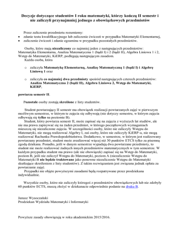 Decyzje dotyczące studentów I roku matematyki, którzy kończą II semestr i nie zaliczyli przynajmniej jednego z obowiązkowych przedmiotów Przez zaliczenie przedmiotu rozumiemy: zdanie testu kwalifikacyjnego lub zaliczenie ćwiczeń w przypadku Matematyki Elementarnej, zaliczenie ćwiczeń i zdanie egzaminu w przypadku pozostałych przedmiotów. Osoby, które mają niezaliczony co najmniej jeden z następujących przedmiotów: Matematyka Elementarna, Analiza Matematyczna 1 (bądź I) i 2 (bądź II), Algebra Liniowa 1 i 2, Wstęp do Matematyki, KiERP, podlegają następującym zasadom. Każda osoba, która o zaliczyła Matematykę Elementarną, Analizę Matematyczną 1 (bądź I) i Algebrę Liniową 1 oraz o zaliczyła co najmniej dwa przedmioty spośród następujących czterech przedmiotów: Analiza Matematyczna 2 (bądź II), Algebra Liniowa 2, Wstęp do Matematyki, KiERP, powtarza semestr II. Pozostałe osoby zostają skreślone z listy studentów. Student powtarzający II semestr ma obowiązek realizacji powtarzanych zajęć w pierwszym możliwym semestrze, w którym te zajęcia się odbywają (nie dotyczy semestru, w którym zajęcia odbywają się tylko na poziomie B). Student, który powtarza semestr II, może zapisać się na zajęcia z wyższych lat studiów, ale nie ma prawa zapisywać się na żaden przedmiot, w którego początkowych wymaganiach mieszczą się niezaliczone zajęcia. W szczególności osoby, które nie zaliczyły Wstępu do Matematyki, nie mogą realizować Algebry I, zaś osoby, które nie zaliczyły KiERP-u, nie mogą realizować Rachunku Prawdopodobieństwa. Dodatkowo, w semestrze, w którym jest realizowany powtarzany przedmiot, student może zrealizować więcej niż 30 punktów ETCS tylko za pisemną zgodą dziekana. Ponadto, jeśli w danym semestrze wypadają dwa powtarzane przedmioty, to student nie może realizować żadnych innych przedmiotów matematycznych w tym semestrze. W każdym przypadku student ma prawo (ale nie obowiązek) zapisać się na Wstęp do Matematyki, poziom B, jeśli nie zaliczył Wstępu do Matematyki, poziom A (niezaliczenie Wstępu do Matematyki B nie będzie traktowane jako ponowne niezaliczenie Wstępu do Matematyki skutkujące skreśleniem z listy studentów). Z takim rozwiązaniem jest związana jednak opłata za powtarzanie zajęć. Przypadki nie objęte powyższymi zasadami będą rozpatrywane przez prodziekana indywidualnie. Wszystkie osoby, które nie zaliczyły któregoś z przedmiotów obowiązkowych lub nie zdobyły 60 punktów ECTS, muszą złożyć w dziekanacie odpowiednie podanie na druku B. Janusz Wysoczański Prodziekan Wydziału Matematyki i Informatyki Powyższe zasady obowiązują w roku akademickim 2015/2016.