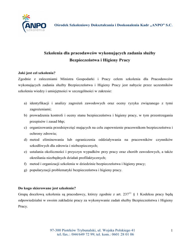 Ośrodek Szkoleniowy Dokształcania i Doskonalenia Kadr „ANPO” S.C. Szkolenia dla pracodawców wykonujących zadania słuŜby Bezpieczeństwa i Higieny Pracy Jaki jest cel szkolenia? Zgodnie z zaleceniami Ministra Gospodarki i Pracy celem szkolenia dla Pracodawców wykonujących zadania słuŜby Bezpieczeństwa i Higieny Pracy jest nabycie przez uczestników szkolenia wiedzy i umiejętności w szczególności w zakresie: a) identyfikacji i analizy zagroŜeń zawodowych oraz oceny ryzyka związanego z tymi zagroŜeniami; b) prowadzenia kontroli i oceny stanu bezpieczeństwa i higieny pracy, w tym przestrzegania przepisów i zasad bhp; c) organizowania przedsięwzięć mających na celu zapewnienie pracownikom bezpieczeństwa i ochrony zdrowia; d) metod eliminowania lub ograniczenia oddziaływania na pracowników czynników szkodliwych dla zdrowia i niebezpiecznych; e) ustalania okoliczności i przyczyn wypadków przy pracy oraz chorób zawodowych, a takŜe określania niezbędnych działań profilaktycznych; f) metod i organizacji szkolenia w dziedzinie bezpieczeństwa i higieny pracy; g) popularyzacji problematyki bezpieczeństwa i higieny pracy. Do kogo skierowane jest szkolenie? Grupą docelową szkolenia są pracodawcy, którzy zgodnie z art. 23711 § 1 Kodeksu pracy będą odpowiedzialni w swoim zakładzie pracy za wykonywanie zadań słuŜby Bezpieczeństwa i Higieny Pracy. 97-300 Piotrków Trybunalski, ul. Wojska Polskiego 41 tel./fax.: /044/649 72 99; tel. kom.: 0601 28 01 06 1 Ośrodek Szkoleniowy Dokształcania i Doskonalenia Kadr „ANPO” S.C. W jakiej formie zorganizowane jest szkolenie? Szkolenie zorganizowane jest w formie kursu lub seminarium – z uwzględnieniem ćwiczeń oraz z wykorzystaniem odpowiednich pomocy dydaktycznych, w szczególności filmów, tablic oraz folii do wyświetlania informacji. Szkolenie trwa 64 godziny lekcyjne, w tym 6 godzin ćwiczeniowych. Szkolenie moŜe być zorganizowane zarówno u Zleceniodawcy, jak i w siedzibie Ośrodka Szkoleniowego „ANPO”. MoŜliwe i szczególnie zalecane jest zorganizowanie szkolenie w formie wyjazdowej w atrakcyjnych miejscowościach na terenie całego kraju i Europy. 97-300 Piotrków Trybunalski, ul. Wojska Polskiego 41 tel./fax.: /044/649 72 99; tel. kom.: 0601 28 01 06 2