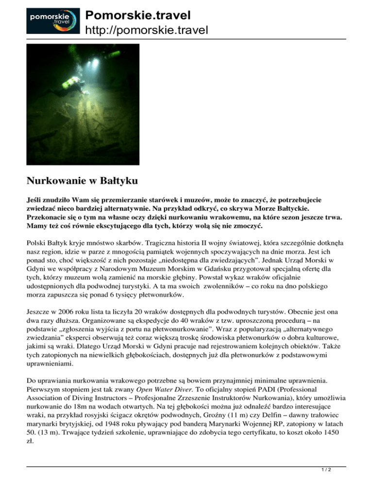 Pomorskie.travel http://pomorskie.travel Nurkowanie w Bałtyku Jeśli znudziło Wam się przemierzanie starówek i muzeów, może to znaczyć, że potrzebujecie zwiedzać nieco bardziej alternatywnie. Na przykład odkryć, co skrywa Morze Bałtyckie. Przekonacie się o tym na własne oczy dzięki nurkowaniu wrakowemu, na które sezon jeszcze trwa. Mamy też coś równie ekscytującego dla tych, którzy wolą się nie zmoczyć. Polski Bałtyk kryje mnóstwo skarbów. Tragiczna historia II wojny światowej, która szczególnie dotknęła nasz region, idzie w parze z mnogością pamiątek wojennych spoczywających na dnie morza. Jest ich ponad sto, choć większość z nich pozostaje „niedostępna dla zwiedzających”. Jednak Urząd Morski w Gdyni we współpracy z Narodowym Muzeum Morskim w Gdańsku przygotował specjalną ofertę dla tych, którzy muzeum wolą zamienić na morskie głębiny. Powstał wykaz wraków oficjalnie udostępnionych dla podwodnej turystyki. A ta ma swoich zwolenników – co roku na dno polskiego morza zapuszcza się ponad 6 tysięcy płetwonurków. Jeszcze w 2006 roku lista ta liczyła 20 wraków dostępnych dla podwodnych turystów. Obecnie jest ona dwa razy dłuższa. Organizowane są ekspedycje do 40 wraków z tzw. uproszczoną procedurą – na podstawie „zgłoszenia wyjścia z portu na płetwonurkowanie”. Wraz z popularyzacją „alternatywnego zwiedzania” eksperci obserwują też coraz większą troskę środowiska płetwonurków o dobra kulturowe, jakimi są wraki. Dlatego Urząd Morski w Gdyni pracuje nad rejestrowaniem kolejnych obiektów. Także tych zatopionych na niewielkich głębokościach, dostępnych już dla płetwonurków z podstawowymi uprawnieniami. Do uprawiania nurkowania wrakowego potrzebne są bowiem przynajmniej minimalne uprawnienia. Pierwszym stopniem jest tak zwany Open Water Diver. To oficjalny stopień PADI (Professional Association of Diving Instructors – Profesjonalne Zrzeszenie Instruktorów Nurkowania), który umożliwia nurkowanie do 18m na wodach otwartych. Na tej głębokości można już odnaleźć bardzo interesujące wraki, na przykład rosyjski ścigacz okrętów podwodnych, Groźny (11 m) czy Delfin – dawny trałowiec marynarki brytyjskiej, od 1948 roku pływający pod banderą Marynarki Wojennej RP, zatopiony w latach 50. (13 m). Trwające tydzień szkolenie, uprawniające do zdobycia tego certyfikatu, to koszt około 1450 zł. 1/2 Pomorskie.travel http://pomorskie.travel Do nurkowania na ok. 30-40 m potrzebny jest kolejny stopień, Advanced Open Water Diver (PADI), znany też jako Deep Diver. – Mówimy tu nadal o nurkowaniu rekreacyjnym, to znaczy niewymagającym dekompresji – mówi Krzysztof Wnorowski z Centrum Nurkowego Tryton w Gdańsku. Z takim certyfikatem możemy zanurkować do jednego z najciekawszych obiektów w naszym morzu. Znajdujący się na 32 m Munin to niemiecki okręt wojenny przebudowany z trawlera rybackiego. Ostatnim stopniem wtajemniczenia jest tak zwane nurkowanie trymiksowe – poniżej 40 m. Ale nie wszystko naraz. – Czy nurkowanie to sport ekstremalny? – Ja bym tego nie nazwał sportem. Niewiele jest w tym aktywności, to raczej odkrywanie nowych przestrzeni – odpowiada Krzysztof Wnorowski. Najbardziej pożądanymi obiektami są oczywiście te zatopione najgłębiej, wymagające większego doświadczenia. Takim wyzwaniem jest transportowiec Franken (70m). Oddany do użytku w 1943 roku, przeznaczony był do zaopatrywania krążowników w paliwo, amunicję i żywność. Zbombardowany w 1945 roku. Są też fascynujące wraki objęte zakazem nurkowania. Do takich należy MS Wilhelm Gustloff, dawny flagowy wycieczkowiec nazistowskiej organizacji turystycznej KdF, włączony do Kriegsmarine, zatopiony w tragicznych okolicznościach. Dla miłośników zapomnianych historii jest jeszcze jedna atrakcja – tym razem naziemna. To Park Kulturowy Rzucewo koło Pucka. Miejsce to już od XIX wieku jest ważną przystanią archeologiczną związaną z polskim Bałtykiem. W 1894 roku odkryto tu ślady prehistorycznej osady rybackiej z późnej epoki kamienia. W dzisiejszym Parku można zobaczyć, jak żyli pradawni mieszkańcy ziem Zatoki Puckiej i okolic, obejrzeć prawdziwe przedmioty codziennego użytku i rekonstrukcję osad. Nadal sądzicie, że historia jest nudna? Sylwia Gutowska Źródła: Urząd Morski w Gdyni, Narodowe Muzeum Morskie w Gdańsku Centrum Nurkowe Fot. T.Stachura Tryton, www.wrakibaltyku.pl Mariusz Ochocki (m.ochocki) 2/2 Powered by TCPDF (www.tcpdf.org)