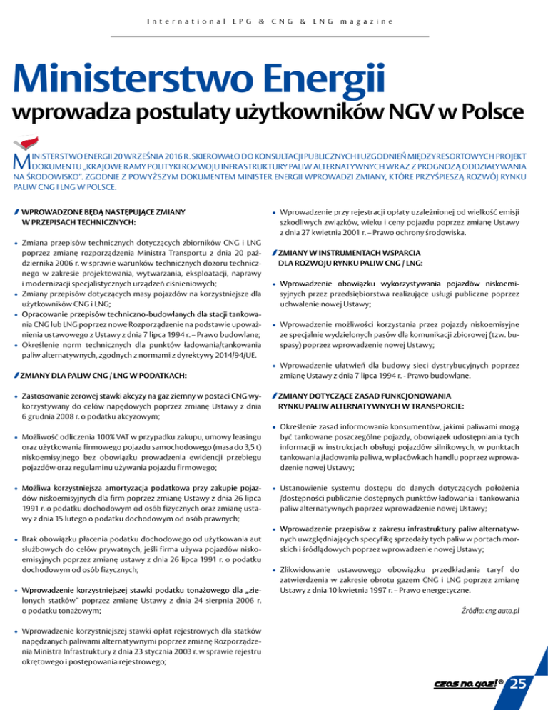 Inter national LP G & CNG & L NG ma ga zin e Ministerstwo Energii wprowadza postulaty użytkowników NGV w Polsce M INISTERSTWO ENERGII 20 WRZEŚNIA 2016 R. SKIEROWAŁO DO KONSULTACJI PUBLICZNYCH I UZGODNIEŃ MIĘDZYRESORTOWYCH PROJEKT DOKUMENTU „KRAJOWE RAMY POLITYKI ROZWOJU INFRASTRUKTURY PALIW ALTERNATYWNYCH WRAZ Z PROGNOZĄ ODDZIAŁYWANIA NA ŚRODOWISKO”. ZGODNIE Z POWYŻSZYM DOKUMENTEM MINISTER ENERGII WPROWADZI ZMIANY, KTÓRE PRZYŚPIESZĄ ROZWÓJ RYNKU PALIW CNG I LNG W POLSCE. WPROWADZONE BĘDĄ NASTĘPUJĄCE ZMIANY W PRZEPISACH TECHNICZNYCH: • Zmiana przepisów technicznych dotyczących zbiorników CNG i LNG poprzez zmianę rozporządzenia Ministra Transportu z dnia 20 paź� dziernika 2006 r. w sprawie warunków technicznych dozoru technicz� nego w zakresie projektowania, wytwarzania, eksploatacji, naprawy i modernizacji specjalistycznych urządzeń ciśnieniowych; • Zmiany przepisów dotyczących masy pojazdów na korzystniejsze dla użytkowników CNG i LNG; • ���������������������������������������������������������������� Opracowanie przepisów techniczno-budowlanych dla stacji tankowa� nia CNG lub LNG poprzez nowe Rozporządzenie na podstawie upoważ� nienia ustawowego z Ustawy z dnia 7 lipca 1994 r. – Prawo budowlane; • Określenie norm technicznych dla punktów ładowania/tankowania paliw alternatywnych, zgodnych z normami z dyrektywy 2014/94/UE. ZMIANY DLA PALIW CNG / LNG W PODATKACH: •������������������������������������������������������������������ Zastosowanie zerowej stawki akcyzy na gaz ziemny w postaci CNG wy� korzystywany do celów napędowych poprzez zmianę Ustawy z dnia 6 grudnia 2008 r. o podatku akcyzowym; • Możliwość odliczenia 100% VAT w przypadku zakupu, umowy leasingu oraz użytkowania firmowego pojazdu samochodowego (masa do 3,5 t) niskoemisyjnego bez obowiązku prowadzenia ewidencji przebiegu pojazdów oraz regulaminu używania pojazdu firmowego; •���������������������������������������������������������������� Możliwa korzystniejsza amortyzacja podatkowa przy zakupie pojaz� dów niskoemisyjnych dla firm poprzez zmianę Ustawy z dnia 26 lipca 1991 r. o podatku dochodowym od osób fizycznych oraz zmianę usta� wy z dnia 15 lutego o podatku dochodowym od osób prawnych; • Brak obowiązku płacenia podatku dochodowego od użytkowania aut służbowych do celów prywatnych, jeśli firma używa pojazdów nisko� emisyjnych poprzez zmianę ustawy z dnia 26 lipca 1991 r. o podatku dochodowym od osób fizycznych; • ���������������������������������������������������������������� Wprowadzenie korzystniejszej stawki podatku tonażowego dla „zie� lonych statków” poprzez zmianę Ustawy z dnia 24 sierpnia 2006 r. o podatku tonażowym; • Wprowadzenie przy rejestracji opłaty uzależnionej od wielkość emisji szkodliwych związków, wieku i ceny pojazdu poprzez zmianę Ustawy z dnia 27 kwietnia 2001 r. – Prawo ochrony środowiska. ZMIANY W INSTRUMENTACH WSPARCIA DLA ROZWOJU RYNKU PALIW CNG / LNG: •��������������������������������������������������������� Wprowadzenie obowiązku wykorzystywania pojazdów niskoemi� syjnych przez przedsiębiorstwa realizujące usługi publiczne poprzez uchwalenie nowej Ustawy; • Wprowadzenie możliwości korzystania przez pojazdy niskoemisyjne ze specjalnie wydzielonych pasów dla komunikacji zbiorowej (tzw. bu� spasy) poprzez wprowadzenie nowej Ustawy; • Wprowadzenie ułatwień dla budowy sieci dystrybucyjnych poprzez zmianę Ustawy z dnia 7 lipca 1994 r. - Prawo budowlane. ZMIANY DOTYCZĄCE ZASAD FUNKCJONOWANIA RYNKU PALIW ALTERNATYWNYCH W TRANSPORCIE: • Określenie zasad informowania konsumentów, jakimi paliwami mogą być tankowane poszczególne pojazdy, obowiązek udostępniania tych informacji w instrukcjach obsługi pojazdów silnikowych, w punktach tankowania /ładowania paliwa, w placówkach handlu poprzez wprowa� dzenie nowej Ustawy; • Ustanowienie systemu dostępu do danych dotyczących położenia /dostępności publicznie dostępnych punktów ładowania i tankowania paliw alternatywnych poprzez wprowadzenie nowej Ustawy; • ����������������������������������������������������������������� Wprowadzenie przepisów z zakresu infrastruktury paliw alternatyw� nych uwzględniających specyfikę sprzedaży tych paliw w portach mor� skich i śródlądowych poprzez wprowadzenie nowej Ustawy; • Zlikwidowanie ustawowego obowiązku przedkładania taryf do zatwierdzenia w zakresie obrotu gazem CNG i LNG poprzez zmianę Ustawy z dnia 10 kwietnia 1997 r. – Prawo energetyczne. Źródło: cng.auto.pl • Wprowadzenie korzystniejszej stawki opłat rejestrowych dla statków napędzanych paliwami alternatywnymi poprzez zmianę Rozporządze� nia Ministra Infrastruktury z dnia 23 stycznia 2003 r. w sprawie rejestru okrętowego i postępowania rejestrowego; 25