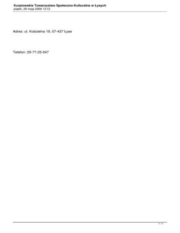 Kurpiowskie Towarzystwo Społeczno-Kulturalne w Łysych piątek, 29 maja 2009 13:12 Adres: ul. Kościelna 19, 07-437 Łyse Telefon: 29-77-25-047 1/1