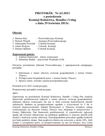 PROTOKÓŁ Nr 62.2013 z posiedzenia Komisji Rolnictwa, Handlu i Usług z dnia 29 kwietnia 2013r. Obecni: 1. Dariusz Kur 2. Henryk Wójcik 3 Aleksandra Świeżak 4. Adam Wojtyra 5. Danuta Opłotna - Przewodniczący Komisji - Zastępca Przewodniczącego - Członek Komisji - Członek Komisji - Członek Komisji Zaproszeni goście: 1. Andrzej Sarnowski – lekarz weterynarii 2. Sebastian Białek – pracownik Wydziału UGK Otwarcia posiedzenia dokonał Przewodniczący i zaproponował następujący porządek: 1. Informacja o stanie zdrowia zwierząt gospodarskich z terenu Gminy Tłuszcz. 2. Wyłapywanie bezpańskich psów z terenu Gminy Tłuszcz. 3. Sprawy różne, wnioski i pisma korespondencyjne. Protokół nr 61.2013 został przyjęty. Proponowany porządek został przyjęty. Ad 1. Zaproszony na posiedzenie Komisji Rolnictwa, Handlu i Usług Pan Andrzej Sarnowski poinformował radnych o stanie zdrowia zwierząt gospodarskich. Zdaniem lekarza weterynarii nie ma w śród zwierząt hodowlanych chorób zakaźnych, badania są przeprowadzane zgodnie z wytycznymi co 5 lat w różnych miejscowościach. Zakład Weterynarii w Tłuszczu świadczy usługi weterynaryjne na obszarze Gminy Tłuszcz oraz obejmuje 6 miejscowości z Gminy Dąbrówka. Pan Sarnowski poinformował, iż częstotliwość zgłoszeń spada, jak również odnotowuje się tendencje spadkową w znaczny sposób jeśli chodzi o hodowlę trzody chlewnej. Prawdopodobnie powodem spadku hodowli jest brak punktów skupu. Stan pogłowia obniża się corocznie o około 18%. Jeśli chodzi o szczepienia psów, to przeprowadzane są one na bieżąco, lecz wielu Komisja Rolnictwa, Handlu i Usług Strona 1 właścicieli psów odmawia ze względu na brak wystarczających środków finansowych. Nie odnotowano na terenie gminy przypadku wścieklizny wśród lisów, gdyż prowadzona jest profilaktyka poprzez szczepienia z rzutu samolotów. Ad 2. Zaproszony na posiedzenie Komisji Rolnictwa, Handlu i Usług Sebastian Białek przybliżył informację odnośnie podejmowanych działań związanych z wyłapywaniem bezpańskich psów. W 2012 roku dzięki współpracy Gminy Tłuszcz z mieszkanką Gminy Tłuszcz, która w ramach wolontariatu znalazła dom dla 130 bezpańskich psów. W chwili obecnej po podpisaniu umowy Gmina Tłuszcz może zlecić w miesiącu odłowienie 3-4 sztuk psów. W ramach rozstrzygniętego postępowania przetargowego Gmina podpisała umowę z firmą otworzoną przez wcześniej wspomnianą mieszkankę naszej Gminy. Obecnie wałęsających się psów na terenie Gminy. Radny Wójcik zgłosił pracownikowi Wydziału UGK potrzebę wyłapania 2 bezpańskich psów po miejscowości Chrzęsne. W odpowiedzi Pan Białek poinformował, że w miesiącu maju zostaną one odłowione. Podana została również informacja, ze w budżecie gminnym na 2013 roku została zabezpieczona kwota 50tys zł na odławianie psów (koszt 1 psa to ok. 1500zł). Pan Sebastian Białek poinformował również, iż w dniach 8-9.05.2013r. odbędzie się zbiórka folii po sianokiszonkach. Zainteresowane osoby powinny zgłaszać zapotrzebowanie na odbiór do Urzędu Miejskiego do pokoju 16. Wkrótce odbędzie się również szczepienie lisów przeciw wściekliźnie. Ad 3. Wnioski Komisji Rolnictwa, Handlu i Usług: Komisja wnioskuje o zaproszenie na posiedzenie w dniu 6 maja 2013r., godz. 8.30 pracownika odpowiedzialnego za realizację funduszy sołeckich. Komisja zapoznała się z treścią: 1. Oceny zasobów pomocy społecznej na rok 2012 dla gminy Tłuszcz – radni zapoznali się z treścią opracowania- załącznik nr 1 do niniejszego protokołu. 2. Oferty seminarium dofinansowywanego ze środków NFOŚiGW pt. „Nowe zadania organów w zakresie budowy komunalnych systemów gospodarowania odpadami” – załącznik nr 2 do niniejszego protokołu. 3. Zaproszeniem wystosowanym przez Krajowe Stowarzyszenie Sołtysów na Krajową Pielgrzymkę Sołtysów i Środowisk Wiejskich do Sanktuarium Matki Bożej w Licheniu w dniu 25.05.2013r. – załącznik nr 3 do niniejszego protokołu. Komisja Rolnictwa, Handlu i Usług Strona 2 Po zapoznaniu się z treścią pisma Komisja Rolnictwa, Handlu i Usług sugeruje, aby poinformować telefonicznie sołtysów (z zastrzeżeniem, że wyjazd jest możliwy dla sołtysów i członków rady sołeckiej) o możliwości wyjazdu. 4. Zaproszenie dla delegacji z Tłuszcza (pracownicy urzędu, radni i przedsiębiorcy) do odwiedzenia miasta Kazan w Turcji – załącznik nr 4 do niniejszego protokołu. 5. Zarządzenie nr 0050.22.2013 Burmistrza Tłuszcza z dnia 26.03.2013r. w sprawie przedstawienia rocznych sprawozdań z wykonania planów finansowych samorządowych instytucji kultury za 2012r. – załącznik nr 5 do niniejszego protokołu. 6. Zarządzenie nr 0050.21.2013 Burmistrza Tłuszcza z dnia 26 marca 2013 roku w sprawie przedstawienia rocznego sprawozdania z wykonania budżetu Gminy Tłuszcz za 2012 rok – załącznik nr 6 do niniejszego protokołu. Załączniki do niniejszego protokołu są do wglądu w pokoju nr 38 Urzędu Miejskiego w Tłuszczu. Termin kolejnego spotkania komisja ustaliła na dzień 06.05.2013r., godz. 8.30. Na tym protokół zakończono. Przewodniczący Komisji Dariusz Kur Dokument utworzony przez: Karolina Gajcy Data utworzenia dokumentu: 06.05.2013r. Komisja Rolnictwa, Handlu i Usług Strona 3