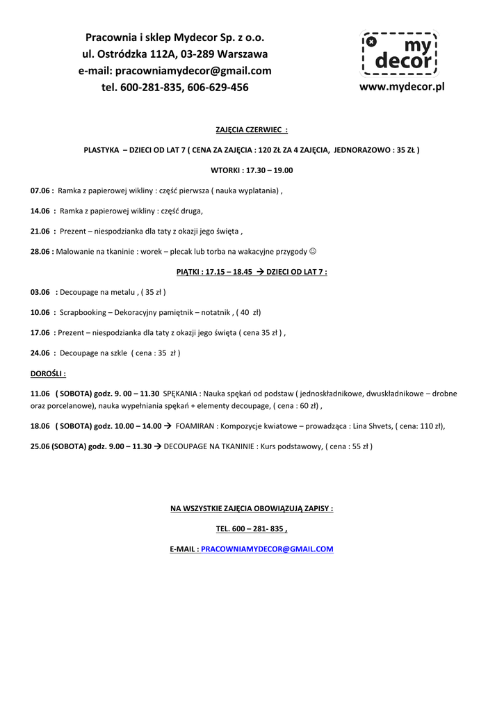 Pracownia i sklep Mydecor Sp. z o.o. ul. Ostródzka 112A, 03-289 Warszawa e-mail: [email protected] tel. 600-281-835, 606-629-456 www.mydecor.pl ZAJĘCIA CZERWIEC : PLASTYKA – DZIECI OD LAT 7 ( CENA ZA ZAJĘCIA : 120 ZŁ ZA 4 ZAJĘCIA, JEDNORAZOWO : 35 ZŁ ) WTORKI : 17.30 – 19.00 07.06 : Ramka z papierowej wikliny : część pierwsza ( nauka wyplatania) , 14.06 : Ramka z papierowej wikliny : część druga, 21.06 : Prezent – niespodzianka dla taty z okazji jego święta , 28.06 : Malowanie na tkaninie : worek – plecak lub torba na wakacyjne przygody PIĄTKI : 17.15 – 18.45 DZIECI OD LAT 7 : 03.06 : Decoupage na metalu , ( 35 zł ) 10.06 : Scrapbooking – Dekoracyjny pamiętnik – notatnik , ( 40 zł) 17.06 : Prezent – niespodzianka dla taty z okazji jego święta ( cena 35 zł ) , 24.06 : Decoupage na szkle ( cena : 35 zł ) DOROŚLI : 11.06 ( SOBOTA) godz. 9. 00 – 11.30 SPĘKANIA : Nauka spękań od podstaw ( jednoskładnikowe, dwuskładnikowe – drobne oraz porcelanowe), nauka wypełniania spękań + elementy decoupage, ( cena : 60 zł) , 18.06 ( SOBOTA) godz. 10.00 – 14.00 FOAMIRAN : Kompozycje kwiatowe – prowadząca : Lina Shvets, ( cena: 110 zł), 25.06 (SOBOTA) godz. 9.00 – 11.30 DECOUPAGE NA TKANINIE : Kurs podstawowy, ( cena : 55 zł ) NA WSZYSTKIE ZAJĘCIA OBOWIĄZUJĄ ZAPISY : TEL. 600 – 281- 835 , E-MAIL : [email protected]