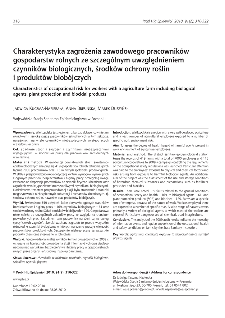 318 Probl Hig Epidemiol 2010, 91(2): 318-322 Charakterystyka zagrożenia zawodowego pracowników gospodarstw rolnych ze szczególnym uwzględnieniem czynników biologicznych, środków ochrony roślin i produktów biobójczych Characteristics of occupational risk for workers with a agriculture farm including biological agents, plant protection and biocidal products Jadwiga Kuczma-Napierała, Anna Bresińska, Marek Duszyński Wojewódzka Stacja Sanitarno-Epidemiologiczna w Poznaniu Wprowadzenie. Wielkopolska jest regionem z bardzo dobrze rozwiniętym rolnictwem i szeroką rzeszą pracowników zatrudnionych w tym sektorze, narażonych na wiele czynników niebezpiecznych występujących w środowisku pracy. Cel. Zbadanie stopnia zagrożenia czynnikami niebezpiecznymi występującymi w środowisku pracy dla pracowników zatrudnionych w rolnictwie. Materiał i metoda. W ewidencji powiatowych stacji sanitarnoepidemiologicznych znajduje się 419 gospodarstw rolnych zatrudniających łącznie 7000 pracowników oraz 113 rolniczych spółdzielni produkcyjnych. W 2009 r. przeprowadzono akcje dotyczącą kontroli wymogów wynikających z ogólnych przepisów bezpieczeństwa i higieny pracy. Szczególną uwagę zwrócono na ekspozycje pracowników na czynniki fizyczne i chemiczne oraz zagrożenie wynikające z kontaktu z szkodliwymi czynnikami biologicznymi. Dodatkowym tematem przeprowadzonej akcji było stosowanie i warunki magazynowania niebezpiecznych substancji i preparatów chemicznych, tj. środków ochrony roślin, nawozów oraz produktów biobójczych. Wyniki. Stwierdzono 359 uchybień, które dotyczyły: ogólnych warunków bezpieczeństwa i higieny pracy – 169, czynników biologicznych – 61 oraz środków ochrony roślin (SOR) i produktów biobójczych – 129. Gospodarstwa rolne należą do szczególnych zakładów pracy, ze względu na charakter prowadzonych prac. Zatrudnieni tam pracownicy narażeni są na szereg specyficznych zagrożeń. Szeroki wachlarz zagrożeń to przede wszystkim różnorodne czynniki biologiczne, w których narażeniu pracuje większość pracowników produkcyjnych. Szczególnie niebezpieczne są wszystkie produkty chemiczne stosowane w rolnictwie. Wnioski. Przeprowadzona analiza wyników kontroli prowadzonych w 2009 r. wskazuje na konieczność prowadzenia akcji informacyjnych oraz ciągłego nadzoru nad warunkami bezpieczeństwa i higieny pracy w gospodarstwach rolnych przez organy Państwowej Inspekcji Sanitarnej. Introduction. Wielkopolska is a region with a very well developed agriculture and a vast number of agricultural employees exposed to a number of specific work environment risks. Aim. To assess the degree of health hazard of harmful agents present in work environment of agricultural employees. Material and method. The district sanitary-epidemiological station keeps the records of 419 farms with a total of 7000 employees and 113 agricultural cooperatives. In 2009 a campaign controlling the requirements of the occupational safety regulations was launched. Particular attention was paid to the employees’ exposure to physical and chemical factors and risks arising from exposure to harmful biological agents. An additional aim of the project was the assessment of the use and storage conditions of hazardous chemical substances and preparations, such as fertilizers, pesticides and biocides. Results. There were noted 359 faults related to the general conditions of occupational safety and health – 169, to biological agents – 61, and plant protection products (SOR) and biocides – 129. Farms are a specific sort of enterprise, because of the nature of work. Workers employed there are exposed to a number of specific risks. A wide range of hazards covers primarily a variety of biological agents to which most of the workers are exposed. Particularly dangerous are all chemicals used in agriculture. Conclusions. The analysis of the 2009 audit results indicates the necessity of information events and regular supervision of the occupational health and safety conditions on farms by the State Sanitary Inspection. Key words: agricultural chemicals, exposure to biological agents, harmful physical agents Słowa kluczowe: chemikalia w rolnictwie, narażenie, czynniki biologiczne, szkodliwe czynniki fizyczne © Probl Hig Epidemiol 2010, 91(2): 318-322 www.phie.pl Nadesłano: 10.02.2010 Zakwalifikowano do druku: 28.05.2010 Adres do korespondencji / Address for correspondence Dr Jadwiga Kuczma-Napierała Wojewódzka Stacja Sanitarno-Epidemiologiczna w Poznaniu ul. Noskowskiego 23, 60-705 Poznań, tel. 61 8544 802 e-mail: [email protected], [email protected] Kuczma-Napierała J i wsp. Charakterystyka zagrożenia zawodowego pracowników gospodarstw rolnych ... Wstęp i cel pracy Wielkopolska jest regionem z bardzo dobrze rozwiniętym rolnictwem. W ewidencji powiatowych stacji sanitarno-epidemiologicznych znajduje się 419 gospodarstw rolnych zatrudniających łącznie 7000 pracowników oraz 113 rolniczych spółdzielni produkcyjnych, w których wszyscy pracujący (około 1700 osób) są jej równoprawnymi członkami [1]. Z uwagi na fakt, iż rolnicy są grupą zawodową narażoną na bardzo wiele czynników szkodliwych dla zdrowia, postanowiono przeprowadzić akcję kontrolną, której celem było sprawdzenie oraz poprawa warunków bezpieczeństwa i higieny pracy (BHP) pracowników zatrudnionych w rolnictwie oraz zapobieganie występowaniu chorób zawodowych. chemicznych, tj. środków ochrony roślin, nawozów oraz produktów biobójczych. Należy zaznaczyć, iż rolnicze spółdzielnie produkcyjne kontrolowano głównie w zakresie stosowania preparatów niebezpiecznych - ze względu na ograniczenia, wynikające z problemu ustalenia pracodawcy i pracowników, w rozumieniu przepisów Kodeksu pracy. Stwierdzone uchybienia Podczas przeprowadzonej akcji stwierdzono 359 uchybień, które dotyczyły ogólnych warunków BHP – 169, czynników biologicznych – 61 oraz środkó