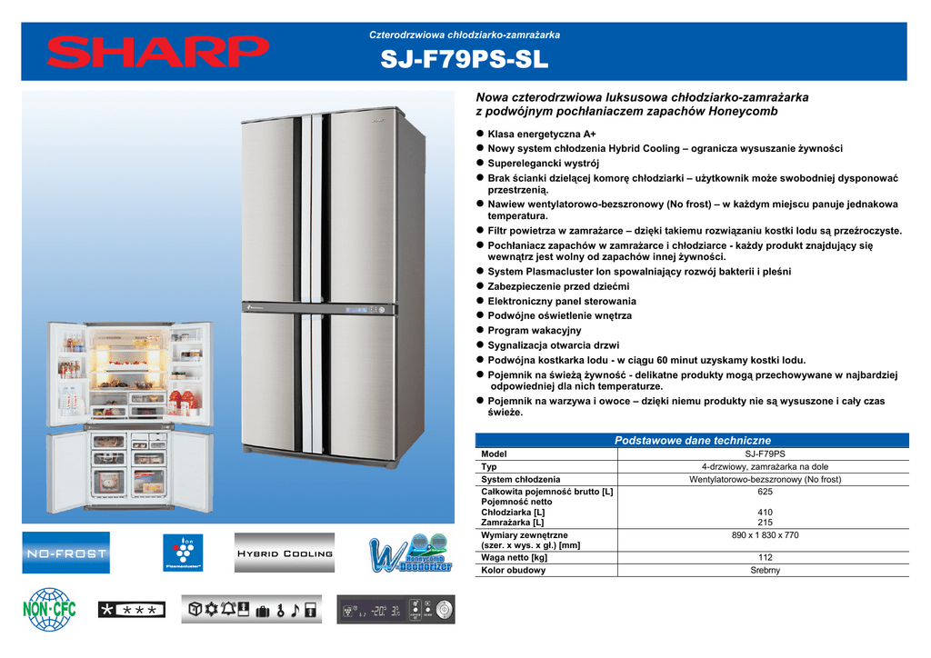 Czterodrzwiowa chłodziarko-zamrażarka SJ-F79PS-SL Nowa czterodrzwiowa luksusowa chłodziarko-zamrażarka z podwójnym pochłaniaczem zapachów Honeycomb Klasa energetyczna A+ Nowy system chłodzenia Hybrid Cooling – ogranicza wysuszanie żywności Superelegancki wystrój Brak ścianki dzielącej komorę chłodziarki – użytkownik może swobodniej dysponować przestrzenią. Nawiew wentylatorowo-bezszronowy (No frost) – w każdym miejscu panuje jednakowa temperatura. Filtr powietrza w zamrażarce – dzięki takiemu rozwiązaniu kostki lodu są przeźroczyste. Pochłaniacz zapachów w zamrażarce i chłodziarce - każdy produkt znajdujący się wewnątrz jest wolny od zapachów innej żywności. System Plasmacluster Ion spowalniający rozwój bakterii i pleśni Zabezpieczenie przed dziećmi Elektroniczny panel sterowania Podwójne oświetlenie wnętrza Program wakacyjny Sygnalizacja otwarcia drzwi Podwójna kostkarka lodu - w ciągu 60 minut uzyskamy kostki lodu. Pojemnik na świeżą żywność - delikatne produkty mogą przechowywane w najbardziej odpowiedniej dla nich temperaturze. Pojemnik na warzywa i owoce – dzięki niemu produkty nie są wysuszone i cały czas świeże. Podstawowe dane techniczne Model Typ System chłodzenia Całkowita pojemność brutto [L] Pojemność netto Chłodziarka [L] Zamrażarka [L] Wymiary zewnętrzne (szer. x wys. x gł.) [mm] Waga netto [kg] Kolor obudowy SJ-F79PS 4-drzwiowy, zamrażarka na dole Wentylatorowo-bezszronowy (No frost) 625 410 215 890 x 1 830 x 770 112 Srebrny Dane techniczne Nazwa modelu Pojemność brutto (L) Chłodziarka (L) Zamrażarka (L) Pojemność netto (L) Ciężar Wymiary Klasa energetyczna Kolor Uchwyt Panel uchwytu Chłodziarka (L) Zamrażarka (L) Brutto (kg) Netto (kg) Szerokość Wysokość *1 Głębokość Srebrny Wykończenie Wykończenie Wyświetlacz LCD Wykończenie powierzchni Funkcje Elektroniczny panel sterowania Regulacja temperatury chłodziarki i zamrażarki Generator jonów Plasmacluster Błyskawiczne zamrażanie Błyskawiczne przygotowanie lodu Podwójna kostkarka do lodu Alarm otwartych drzwi Tryb wakacyjny Czasomierz Zabezpieczenie przed dziećmi Hybrydowy system chłodzenia Oświetlenie wnętrza Pojemnik na wino Półki w chłodziarce *1 Bez uchwytu. *2 Po zastosowaniu odpowiednich pojemniczków. SJ-F79PS-SL (seria luksusowa) 625 410 215 605 394 211 129 112 890 1 830 770 A+ Stal nierdzewna Srebrny połysk Matowa powierzchnia Białe znaki na czarnym tle Typ wolnostojący Żeby zapewnić właściwą wentylację lodówki, należy ją ustawić w ten sposób, by z tyłu i z boków urządzenia było co najmniej 6 cm wolnej przestrzeni, a powyżej 9 cm. Z opisywanej lodówki można korzystać przy temperaturze otoczenia pomiędzy +5°C i +38°C. Przez dłuższy czas nie wolno jej przechowywać w temperaturze poniżej -10°C. Zmiany napięcia znamionowego w sieci elektrycznej, do której podłączona jest lodówka, nie powinny przekraczać ±6%. Wymiary i wolna przestrzeń Lustrzane a) Regulacja temperatury chłodziarki i zamrażarki b) Włączanie i wyłączanie systemu Plasmacluster c) Włączanie i wyłączanie ekspresowego przygotowania 2 lodu* 2 d) Włączanie i wyłączanie ekspresowego zamrażania* e) Alarm otwarcia drzwi f) Tryb wakacyjny g) Czasomierz h) Zabezpieczenie przed dziećmi Tak Tak Tak Tak 2 pojemniki Tak Tak Tak Tak Tak Dwie pionowe lampy 4 x 15 W Tak 3 z hartowanego szkła UWAGI: Parametry techniczne mogą ulec zmianie bez uprzedniego powiadomienia. Różnice pomiędzy specyfikacją a stanem faktycznym nie mogą być podstawą reklamacji. Dystrybutor: SHARP Electronics (Europe) GMBH Spółka z o.o. Oddział w Polsce 02-844 Warszawa, ul. Puławska 469 tel.: +48 22/545 81 00, faks: +48 22/545 81 05 www.sharp.pl