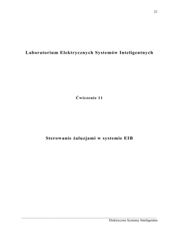 21 Laboratorium Elektrycznych Systemów Inteligentnych Ćwiczenie 11 Sterowanie Ŝaluzjami w systemie EIB ___________________________________________________________________________ Elektryczne Systemy Inteligentne 22 Sterowanie Ŝaluzjami w systemie EIB 1. Wstęp. Celem ćwiczenia jest nauczenie przyszłego uŜytkownika systemu EIB operacji związanych z instalacją i eksploatacją sytemu oraz poznanie jego podstawowych funkcji. W ćwiczeniu wykorzystywane są komponenty systemu EIB, których opis znajduje się poniŜej. 1.1. Zasilacz 320 mA. Zasilacz napięciowy ze zintegrowaną cewką do zasilania magistrali EIB. Zasilacz przystosowany jest do montaŜu na szynie instalacyjnej 35 mm. Parametry techniczne: Napięcie zasilania 230 V AC +10%/-15%, 50..60 Hz, Napięcie wyjściowe 30 V DC ±1%, SELV, Prąd znamionowy 320 mA, odporny na zwarcia, moc 4 VA, masa 0,210 kg. Połączenie z magistralą za pośrednictwem zacisku magistralnego. Rys. 1. Zasilacz 320 mA firmy ABB. 1.2. Łącze RS 232. Łącze szeregowe słuŜy do połączenia komputera PC z magistralą EIB. Łącze montowane jest na porcie magistralnym w puszcze instalacyjnej. Połączenie z komputerem za pomocą 9-polowego złącza RS 232 (standard PC) oraz RS 562 (niektóre notebooki PC). Wybór RS 232 / RS 562 za pomocą przełącznika. Parametry techniczne: Napięcie zasilania 24 V DC, magistrala EIB, wyjście RS 232/RS 562, masa 0,08 kg. Połączenie z magistralą złączem 10pinowym przez port magistralny montowany w puszce. Rys. 2. Łącze szeregowe RS 232 firmy ABB. 1.3. Wyjście binarne 4 x 6 A. 4-kanałowy aktor załączający o budowie modułowej przeznaczony jest do mocowania na szynie 35 mm. Połączenie z magistralą EIB odbywa się poprzez zacisk magistralny. Przy uŜyciu czterech styków moŜna łączyć cztery niezaleŜne grupy urządzeń elektrycznych. Urządzenie nie wymaga dodatkowego zasilania. Przy zaniku napięcia magistralnego aktor moŜe załączyć obwód roboczy (np. oświetlenie robocze lub awaryjne). W ustawieniu standardowym aktor załącza przekaźnik po otrzymaniu telegramu o wartości „1” oraz wyłącza go po otrzymaniu telegramu o wartości „0”. Gdy parametr „sposób załączania”( „Switching mode”) jest ustawiony na „styk rozwierny”, aktor załącza przekaźnik po otrzymaniu telegramu o wartości „0” oraz wyłącza go po otrzymaniu telegramu o wartości „1”. ___________________________________________________________________________ Elektryczne Systemy Inteligentne 23 Parametry techniczne: Napięcie zasilania 24 V DC, magistrala EIB, Wyjścia: 4 wyjścia 6A, 230 V AC, Szerokość montaŜowa 4 moduły po 18 mm, Masa 0,18 kg. Połączenie z magistralą za pośrednictwem zacisku magistralnego. Rys. 3. Wyjście binarne 4 x 6 A firmy ABB. 1.4. Przycisk Triton + IR + wyświetlacz Przycisk wielokrotny przystosowany do montaŜu na porcie magistralnym w puszcze instalacyjnej. Urządzenie posiada 5 przycisków do sterowania np. załączaniem/wyłączaniem, ściemnianiem lub Ŝaluzjami przez wysyłanie komend na magistralę EIB. MoŜliwe jest zaprogramowanie do 6 scen świetlnych. Poszczególne funkcje mogą być obsługiwane za pomocą pilota na podczerwień. Urządzenie posiada wyświetlacz, na którym wyświetlane mogą być informacje o statusie urządzeń oraz róŜnego rodzaju awarie. Wyświetlacz pracuje w trzech trybach: wyświetlanie nadchodzących telegramów, pomoc, wyświetlanie stałe. KaŜdy klawisz posiada wskaźnik stanu w postaci diody LED oraz podświetlane okienko opisowe. 5 Parametry techniczne: INFO IR Napięcie zasilania 24 V DC, magistrala EIB. Elementy sterowania i informacji: − 5 przycisków z 2 stykami kaŜdy, − wyświetlacz na 16 znaków, − 5 dwukolorowych diod LED, − 5 diod podświetlających okienka opisowe, − odbiornik podczerwieni, Masa 0,13 kg. Połączenie z magistralą złączem 10-pinowym przez port magistralny montowany w puszce. Rys. 4. Przycisk Triton firmy ABB. 1.5. Czujnik obecności. Parametry techniczne: 1 lx, PIR Napięcie zasilania 24 V DC, magistrala EIB. Elementy sterowania: − przełącznik, − potencjometr zmierzchowy 5..1000 lx, − potencjometr czasu opóźnienia 10 s..17 min, Masa 0,04 kg. Połączenie z magistralą złączem 10-pinowym przez port magistralny montowany w puszce. Rys. 5. Czujnik obecności ABB. Urządzenie jest sensorem ruchu montowanym na porcie magistralnym w puszcze instalacyjnej. Urządzenie wysyła na magistralę EIB telegramy łączeniowe do aktorów. Czujka posiada przełącznik umoŜliwiający przełączenie urządzenia w 3 tryby pracy ON/AUTOMATIC/OFF. Przełącznik moŜna takŜe zablokować w pozycji neutralnej. Urządzenie posiada z tyłu dwa potencjometry, którymi reguluje się czas opóźnienia oraz wbudowany czujnik zmierzchowy. MoŜliwa jest takŜe regulacja obszaru detekcji. ___________________________________________________________________________ Elektryczne Systemy Inteligentne 24 2. Wykonanie ćwiczenia. W ćwiczeniu naleŜy zaprojektować, zaprogramować i uruchomić sterowanie. Programowana funkcja sterowania Ŝaluzjami zostanie zrealizowana za pomocą sterownika Ŝaluzji JA/S 4.6.1, przycisku Triton 5-cio pozycyjnego (6327) i czujnika obecności oraz wejścia binarnego, np. urządzenia sterującego zaworem ogrzewania 6164 U-500. W ćwiczeniu, z wykorzystaniem urządzeń opisanych we wstępie, wykonać projekt oraz uruchomić instalację, w której będzie realizowany następujący scenariusz postępowania: - Po pierwszym wykryciu ruchu w sali ćwiczeń Ŝaluzje w oknach zostaną otwarte, a następnie automatycznie włączy się oświetlenie. Wyłączenie światła w sali przyciskiem Triton spowoduje natomiast zamknięcie Ŝaluzji. W przypadku zagroŜenia zbyt silnym wiatrem, dzięki zaprogramowanej funkcji bezpieczeństwa dla rolet, rolety zostaną podniesione. Jest to istotne w przypadku, gdy Ŝaluzje zewnętrzne posiadają poziome lamele. Kiedy instaluje się Ŝaluzje zewnętrzne
