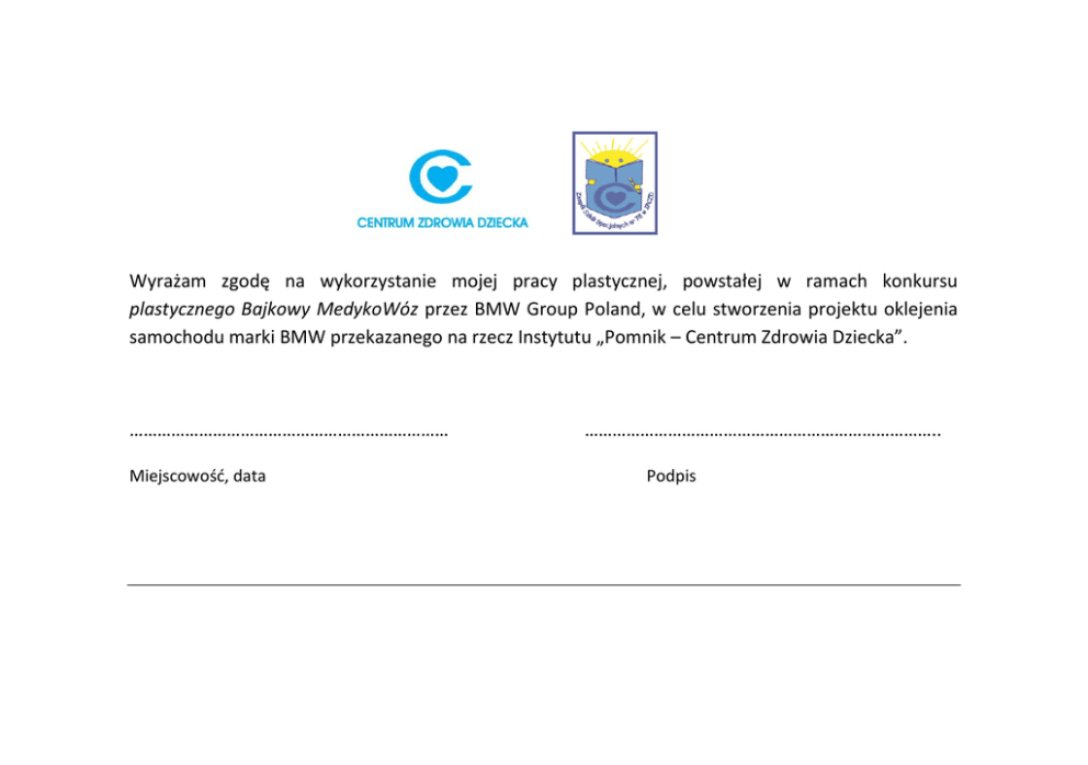Wyrażam zgodę na wykorzystanie mojej pracy plastycznej, powstałej w ramach konkursu plastycznego Bajkowy MedykoWóz przez BMW Group Poland, w celu stworzenia projektu oklejenia samochodu marki BMW przekazanego na rzecz Instytutu „Pomnik – Centrum Zdrowia Dziecka”. …………………………………………………………… Miejscowość, data ………………………………………………………………….. Podpis