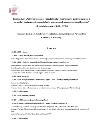 Seminarium „Polityka wysokiej rozdzielczości: mechanizmy polityki opartej o dowody i partycypacji obywatelskiej w procesach zarządzania publicznego” 18 kwietnia, godz. 13.00 – 17.00 Muzeum Kolekcji im. Jana Pawła II Fundacji im. Janiny i Zbigniewa Porczyńskich Warszawa, Pl. Bankowy 1 Program 13.00 -‐13.30 – Lunch 13.30 – 13.40 – Rozpoczęcie seminarium Kuba Wygnański, Pracownia Badań i Innowacji Społecznych Stocznia, Stowarzyszenie Klon/Jawor 13.40-‐ 14.20 – Polityka wysokiej rozdzielczości w zarządzaniu publicznym Michał Boni, Szef Zespołu Doradców Strategicznych Premiera (udział niepotwierdzony) Przedstawiciel Ministerstwa Rozwoju Regionalnego Agnieszka Chłoń -‐ Domińczak, Szkoła Główna Handlowa, Instytut Badań Edukacyjnych Andrzej Porawski, dyrektor biura Związku Miast Polskich 14.20-‐ 14.30 Dyskusja 14.30-‐ 15.00 Polityki publiczne a otwartość rządu – idea i praktyka open government Edwin Bendyk, Polityka Alek Tarkowski, Centrum Cyfrowe Projekt Polska Tomasz Siemoniak, sekretarz stanu w Ministerstwie Spraw Wewnętrznych i Administracji 15.00-‐15.10 Dyskusja 15.10-‐ 15.30 Przerwa kawowa 15.30 – 16.00 Prezentacja portalu mojapolis.pl 16.00-‐16.30 Przykłady analiz regionalnych i wykorzystania mojapolis.pl Adam Płoszaj, Centrum Europejskich Studiów Regionalnych i Lokalnych EUROREG UW Barbara Fatyga, Albert Hupa, Obserwatorium Żywej Kultury, Instytut Stosowanych Nauk Społecznych UW Joanna Tyrowicz, Wydział Nauk Ekonomicznych UW 16.30-‐17.00 Dyskusja Seminarium organizowane jest w ramach projektu Moja Polis – interaktywny system monitoringu partnerstwa lokalne-‐go i rozwoju aktywnych społeczności lokalnych – realizowanego dzięki wsparciu udzielonemu przez Islandię, Liechtenstein i Norwegię poprzez dofinansowanie ze środków Mechanizmu Finansowego Europejskiego Obszaru Gospodarczego oraz Norweskiego Mechanizmu Finansowego.