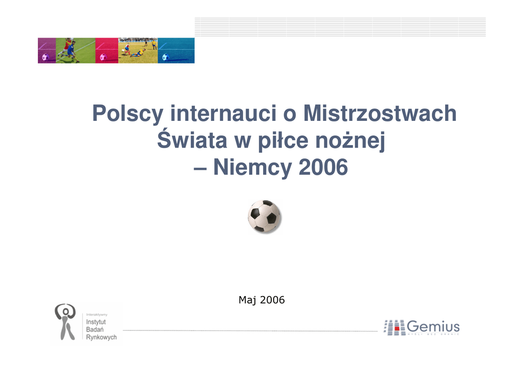 Polscy internauci o Mistrzostwach Świata w piłce nożnej – Niemcy 2006 Maj 2006 Spis treści O badaniu----------------------------------------------------------------------------------------------------------------------3 Oglądanie transmisji meczy-------------------------------------------------------------------------------------------------4 Oglądanie transmisji meczy w ramach Mistrzostw Świata w piłce nożnej – Niemcy 2006------------------------------------4 Zamiar oglądania rozgrywek Mistrzostw Świata w piłce nożnej – Niemcy 2006 a demografia respondentów---------------5 Typowani zwycięzcy----------------------------------------------------------------------------------------------------------6 Typowani zwycięzcy Mistrzostw Świata w piłce nożnej – Niemcy 2006 (TOP 10)----------------------------------------------6 Typowanie Brazylii jako zwycięzcy Mistrzostw Świata w piłce nożnej – Niemcy 2006 a demografia respondentów---------7 Typowanie Polski jako zwycięzcy Mistrzostw Świata w piłce nożnej – Niemcy 2006 a demografia respondentów-----------8 Grupa A – typowani zwycięzcy-----------------------------------------------------------------------------------------------------9 Grupa B – typowani zwycięzcy----------------------------------------------------------------------------------------------------10 Grupa C – typowani zwycięzcy----------------------------------------------------------------------------------------------------11 Grupa D – typowani zwycięzcy----------------------------------------------------------------------------------------------------12 Grupa E – typowani zwycięzcy----------------------------------------------------------------------------------------------------13 Grupa F – typowani zwycięzcy----------------------------------------------------------------------------------------------------14 Grupa G – typowani zwycięzcy----------------------------------------------------------------------------------------------------15 Grupa H – typowani zwycięzcy----------------------------------------------------------------------------------------------------16 Udział reprezentacji Polski--------------------------------------------------------------------------------------------------17 Zakłady bukmacherskie-----------------------------------------------------------------------------------------------------18 Czy zamierza Pan(i) zawierać zakłady bukmacherskie dotyczące Mistrzostw Świata w piłce nożnej – Niemcy 2006?------18 2 O badaniu Badanie zostało zrealizowane w dn. 22 - 23 maja metodą CAWI (Computer Assisted Web Interview) na próbie 1674 użytkowników internetu 15+. 3 Oglądanie transmisji meczy Zamiar oglądania transmisji meczy w ramach Mistrzostw Św iata w piłce nożnej - Niemcy 2006 Nie wiem, trudno powiedzieć 14,5% Nie 17,3% Tak 68,2% Źródło: Gemius SA/IIBR, maj 2006. 4 Oglądanie transmisji meczy Zamiar oglądania rozgrywek Mistrzostw Świata w piłce nożnej - Niemcy 2006 a demografia respondentów (odpowiedzi "Tak") 85% 81,1% 79,3% 74,1% 75% 72,7% 71,7% 70,2% 67,9% 65% 67,0% 66,9% 66,9% Wyższe 69,3% 70% Pomaturalnie/niepełne wyższe/licencjat 80% 63,1% 60% 60,2% 59,5% 55% Wiek Miejsce zamieszkania Średnie Zawodowe/niepełne średnie Podstawowe/gimnazjalne Miasto powyżej 500 tys. mieszkańców Miasto 100 - 500 tys. mieszkańców Wieś 45+ 35-44 25-34 15-24 Mężczyzna Kobieta Płeć Miasto poniżej 100 tys. mieszkańców 53,9% 50% Wykształcenie Źródło: Gemius SA/IIBR, maj 2006. 5 Typowani zwycięzcy 50% 45% Typowani zwycięzcy Mistrzostw Świata w piłce nożnej - Niemcy 2006 (top 10) 43,5% 40% 35% 30% 25% 20% 15% 10% 7,5% 6,9% 6,0% 3,6% 5% 2,9% 2,8% 2,7% 2,0% 1,2% 0% Brazylia Niemcy Polska Anglia Włochy Francja Argentyna Portugalia Hiszpania Holandia Źródło: Gemius SA/IIBR, maj 2006. 6 Typowani zwycięzcy 60% Typowanie Brazylii jako zwycięzcy Mistrzostw Świata w piłce nożnej - Niemcy 2006 a demografia respondentów 53,3% 50% 51,2% 49,8% 49,2% 48,1% 47,9% 42,5% 40% 42,2% 41,6% 39,4% 38,2% 37,8% 36,2% 34,4% Płeć Wiek Miejsce zamieszkania Wyższe Pomaturalnie/niepełne wyższe/licencjat Średnie Zawodowe/niepełne średnie Podstawowe/gimnazjalne Miasto powyżej 500 tys. mieszkańców Wieś 45+ 35-44 25-34 15-24 Mężczyzna Kobieta 20% Miasto 100 - 500 tys. mieszkańców 30,9% Miasto poniżej 100 tys. mieszkańców 30% Wykształcenie Źródło: Gemius SA/IIBR, maj 2006. 7 Typowani zwycięzcy 15% Typowanie Polski jako zwycięzcy Mistrzostw Świata w piłce nożnej - Niemcy 2006 a demografia respondentów 10,4% 10% 9,6% 9,2% 8,6% 8,5% 7,4% 7,2% 6,3% 5% 5,6% 5,9% 6,3% 5,6% 3,6% 2,6% Wiek Miejsce zamieszkania Wyższe Pomaturalnie/niepełne wyższe/licencjat Średnie Zawodowe/niepełne średnie Podstawowe/gimnazjalne Miasto powyżej 500 tys. mieszkańców Miasto 100 - 500 tys. mieszkańców Miasto poniżej 100 tys. mieszkańców Wieś 35-44 25-34 15-24 Mężczyzna Kobieta Płeć 45+ 0,9% 0% Wykształcenie Źródło: Gemius SA/IIBR, maj 2006. 8 Grupa A – typowani zwycięzcy 90% Grupa A - typowani zwycięzcy 82,4% 80% 68,2% 70% 60% 50% 40% 30% 20,8% 20% 11,2% 10% 6,3% 0% Niemcy Polska Ekwador Kostaryka Nie wiem, trudno powiedzieć Źródło: Gemius SA/IIBR, maj 2006. 9 Grupa B – typowani zwycięzcy 90% Grupa B - typowani zwycięzcy 84,3% 80% 73,0% 70% 60% 50% 40% 30% 20% 15,5% 11,9% 10% 3,4% 0% Anglia Szwecja Paragwaj Trynidad i Tobago Nie wiem, trudno powiedzieć Źródło: Gemius SA/IIBR, maj 2006. 10 Grupa C – typowani zwycięzcy 90% Grupa C - typowani zwycięzcy 80,2% 80% 73,7% 70% 60% 50% 40% 30% 20% 12,5% 11,6% 9,5% 10% 0% Argentyna Holandia Serbia i Czarnogóra Wybrzeże Kości Słoniowej Nie wiem, trudno powiedzieć Źródło: Gemius SA/IIBR, maj 2006. 11 Grupa D – typowani zwycięzcy 90% Grupa D - typowani zwycięzcy 81,4% 80% 73,4% 70% 60% 50% 40% 30% 20% 13,5% 9,8% 10% 8,5% 0% Portugalia Meksyk Iran Angola Nie wiem, trudno powiedzieć Źródło: Gemius 