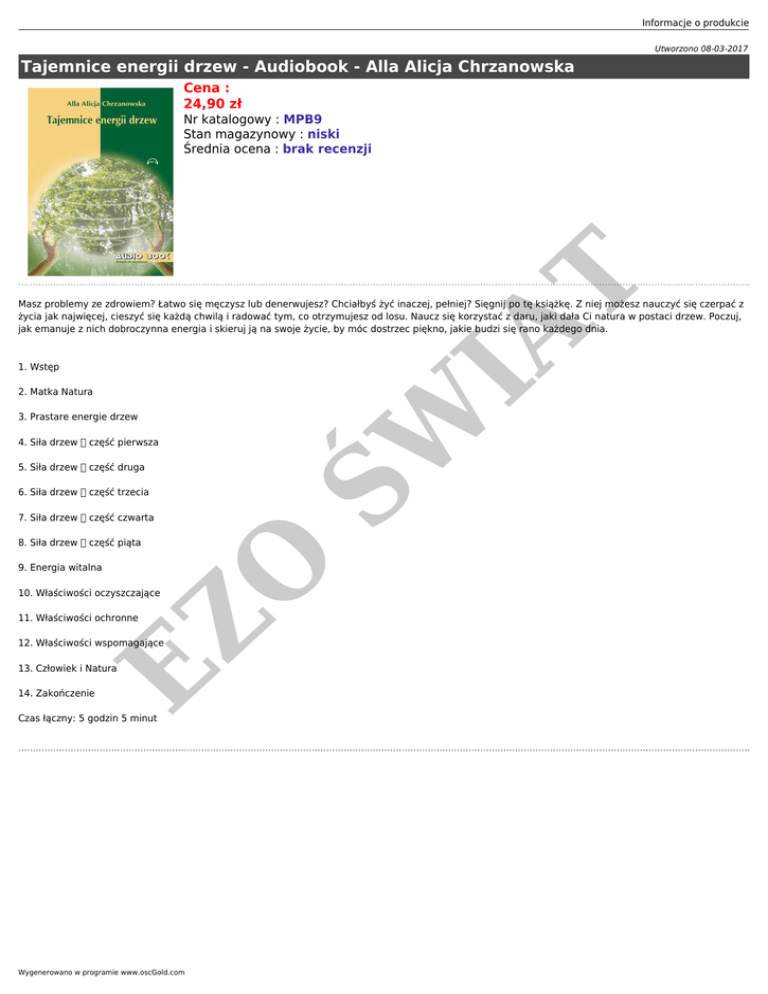 Informacje o produkcie Utworzono 08-03-2017 Tajemnice energii drzew - Audiobook - Alla Alicja Chrzanowska Cena : 24,90 zł IA T Nr katalogowy : MPB9 Stan magazynowy : niski Średnia ocena : brak recenzji Masz problemy ze zdrowiem? Łatwo się męczysz lub denerwujesz? Chciałbyś żyć inaczej, pełniej? Sięgnij po tę książkę. Z niej możesz nauczyć się czerpać z życia jak najwięcej, cieszyć się każdą chwilą i radować tym, co otrzymujesz od losu. Naucz się korzystać z daru, jaki dała Ci natura w postaci drzew. Poczuj, jak emanuje z nich dobroczynna energia i skieruj ją na swoje życie, by móc dostrzec piękno, jakie budzi się rano każdego dnia. 1. Wstęp 3. Prastare energie drzew 4. Siła drzew część pierwsza 5. Siła drzew część druga 6. Siła drzew część trzecia 7. Siła drzew część czwarta ŚW 2. Matka Natura EZ O 8. Siła drzew część piąta 9. Energia witalna 10. Właściwości oczyszczające 11. Właściwości ochronne 12. Właściwości wspomagające 13. Człowiek i Natura 14. Zakończenie Czas łączny: 5 godzin 5 minut Wygenerowano w programie www.oscGold.com