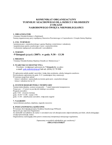 KOMUNIKAT ORGANIZACYJNY TURNIEJU SZACHOWEGO DLA DZIECI I MŁODZIEśY Z OKAZJI NARODOWEGO ŚWIĘTA NIEPODLEGŁOŚCI 1. ORGANIZATOR • Gminny Ośrodek Kultury w Rędzinach Turniej organizowany przy współpracy Starostwa Powiatowego w Częstochowie i Urzędu Gminy Rędziny 2. CEL TURNIEJU • promocja pow. częstochowskiego i gminy Rędziny wśród dzieci i młodzieŜy • popularyzacja sportu szachowego w pow. częstochowskim • wyłonienie najlepszych zawodniczek i zawodników 3. TERMIN •9 listopad (piątek) 2007r. w godz. 9.30 – 13.30 4. MIEJSCE • Gminny Ośrodek Kultury Rędziny-Osiedle ul. Mickiewicza 7 5. WARUNKI UCZESTNICTWA Przesłanie (wstępnego) zgłoszenia do 7 listopada br. na adres: e-mail: [email protected] lub tel. (034) 32 79 998 W zgłoszeniu naleŜy podać: nazwisko i imię, data urodzenia, szkoła, kategoria szachowa Potwierdzenie zgłoszenia do godz. 9.15 (zamknięcie listy startowej). W turnieju mogą brać udział: • dzieci i młodzieŜ zamieszkała na terenie gmin pow. częstochowskiego • dzieci i młodzieŜ do lat 18 6. SYSTEM ROZGRYWEK I TEMPO GRY Turniej indywidualny, system szwajcarski – 7 rund, kojarzenie komputerowe Tempo gry - 15 minut na partię dla kaŜdego zawodnika Program zawodów: godz. 9.20 – otwarcie turnieju godz. 10.30 ÷13.00 – rundy I-VII godz. 13.30 – zakończenie zawodów, wręczenie nagród 7. NAGRODY • przewidziano puchary, dyplomy, nagrody rzeczowe 8. POSTANOWIENIA KOŃCOWE W turnieju obowiązują przepisy Kodeksu Szachowego PZSzach. Sprzęt do gry zapewnia Organizator. Za zdolność zawodników do startu w zawodach oraz ich ubezpieczenie odpowiedzialny jest klub, szkoła delegujące swoją reprezentację, rodzic. Organizatorzy zastrzegają sobie prawo ostatecznej interpretacji niniejszego regulaminu. Zapraszamy wszystkich miłośników gry szachowej ! ORGANIZATORZY