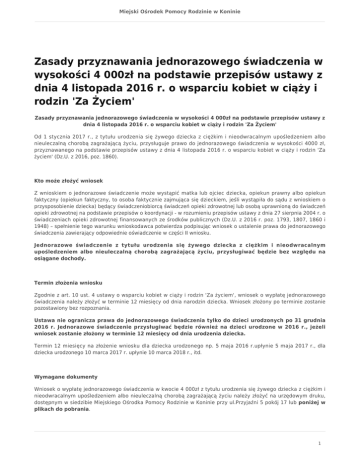Miejski Ośrodek Pomocy Rodzinie w Koninie Zasady przyznawania jednorazowego świadczenia w wysokości 4 000zł na podstawie przepisów ustawy z dnia 4 listopada 2016 r. o wsparciu kobiet w ciąży i rodzin 'Za Życiem' Zasady przyznawania jednorazowego świadczenia w wysokości 4 000zł na podstawie przepisów ustawy z dnia 4 listopada 2016 r. o wsparciu kobiet w ciąży i rodzin 'Za Życiem' Od 1 stycznia 2017 r., z tytułu urodzenia się żywego dziecka z ciężkim i nieodwracalnym upośledzeniem albo nieuleczalną chorobą zagrażającą życiu, przysługuje prawo do jednorazowego świadczenia w wysokości 4000 zł, przyznawanego na podstawie przepisów ustawy z dnia 4 listopada 2016 r. o wsparciu kobiet w ciąży i rodzin 'Za życiem' (Dz.U. z 2016, poz. 1860). Kto może złożyć wniosek Z wnioskiem o jednorazowe świadczenie może wystąpić matka lub ojciec dziecka, opiekun prawny albo opiekun faktyczny (opiekun faktyczny, to osoba faktycznie zajmująca się dzieckiem, jeśli wystąpiła do sądu z wnioskiem o przysposobienie dziecka) będący świadczeniobiorcą świadczeń opieki zdrowotnej lub osobą uprawnioną do świadczeń opieki zdrowotnej na podstawie przepisów o koordynacji - w rozumieniu przepisów ustawy z dnia 27 sierpnia 2004 r. o świadczeniach opieki zdrowotnej finansowanych ze środków publicznych (Dz.U. z 2016 r. poz. 1793, 1807, 1860 i 1948) – spełnienie tego warunku wnioskodawca potwierdza podpisując wniosek o ustalenie prawa do jednorazowego świadczenia zawierający odpowiednie oświadczenie w części II wniosku. Jednorazowe świadczenie z tytułu urodzenia się żywego dziecka z ciężkim i nieodwracalnym upośledzeniem albo nieuleczalną chorobą zagrażającą życiu, przysługiwać będzie bez względu na osiągane dochody. Termin złożenia wniosku Zgodnie z art. 10 ust. 4 ustawy o wsparciu kobiet w ciąży i rodzin 'Za życiem', wniosek o wypłatę jednorazowego świadczenia należy złożyć w terminie 12 miesięcy od dnia narodzin dziecka. Wniosek złożony po terminie zostanie pozostawiony bez rozpoznania. Ustawa nie ogranicza prawa do jednorazowego świadczenia tylko do dzieci urodzonych po 31 grudnia 2016 r. Jednorazowe świadczenie przysługiwać będzie również na dzieci urodzone w 2016 r., jeżeli wniosek zostanie złożony w terminie 12 miesięcy od dnia urodzenia dziecka. Termin 12 miesięcy na złożenie wniosku dla dziecka urodzonego np. 5 maja 2016 r.upłynie 5 maja 2017 r., dla dziecka urodzonego 10 marca 2017 r. upłynie 10 marca 2018 r., itd. Wymagane dokumenty Wniosek o wypłatę jednorazowego świadczenia w kwocie 4 000zł z tytułu urodzenia się żywego dziecka z ciężkim i nieodwracalnym upośledzeniem albo nieuleczalną chorobą zagrażającą życiu należy złożyć na urzędowym druku, dostępnym w siedzibie Miejskiego Ośrodka Pomocy Rodzinie w Koninie przy ul.Przyjaźni 5 pokój 17 lub poniżej w plikach do pobrania. 1 Miejski Ośrodek Pomocy Rodzinie w Koninie Ponadto konieczne jest dołączenie do wniosku dwóch zaświadczeń: 1. Zaświadczenie lekarskie, potwierdzającego ciężkie i nieodwracalne upośledzenia albo nieuleczalną chorobę zagrażającą życiu, które powstały w prenatalnym okresie rozwoju dziecka lub w czasie porodu. Zaświadczenie takie powinno być wystawionego przez lekarza z którym Narodowy Fundusz Zdrowia zawarł umowę o udzielanie świadczeń opieki zdrowotnej, albo lekarza, który jest zatrudniony lub wykonuje zawód w przychodni, z którą NFZ zawarł umowę o udzielanie świadczeń opieki zdrowotnej, posiadającego specjalizację II stopnia lub tytuł specjalisty w dziedzinie: położnictwa i ginekologii, perinatologii lub neonatologii. Obowiązujące przepisy nie przewidują sformalizowanego wzoru takiego zaświadczenia. 2. Podobnie jak w przypadku jednorazowej zapomogi z tytułu urodzenia dziecka (tzw. becikowego), jednorazowe świadczenie przysługiwać będzie tylko w sytuacji, gdy matka dziecka pozostawała pod opieką medyczną nie później niż od 10 tygodnia ciąży do dnia porodu. Fakt ten należy potwierdzić odpowiednim zaświadczeniem lekarskim lub zaświadczeniem wystawionym przez położną. Wzór tego zaświadczenia określony jest w rozporządzeniu Ministra Zdrowia z dnia 14 września 2010 r. w sprawie formy opieki medycznej nad kobieta w ciąży, uprawniającej do dodatku z tytułu urodzenia dziecka oraz wzoru zaświadczenia potwierdzającego pozostawanie pod ta opieką (Dz. U. z 2010 r., Nr 183, poz. 1234). Wymóg legitymowania się zaświadczeniem o pozostawaniu pod opieką medyczną nie później niż od 10 tygodnia ciąży do dnia porodu, nie dotyczy opiekuna prawnego, opiekuna faktycznego i osoby, która przysposobiła dziecko. Karta ciąży, wyniki badań, wpisy ze szpitala oraz inna dokumentacja medyczna nie stanowią dokumentów uprawniających do otrzymania w/w świadczenia. Uwaga!!! Zaświadczenie lekarskie, potwierdzające ciężkie i nieodwracalne upośledzenia albo nieuleczalną chorobę zagrażającą życiu, które powstały w prenatalnym okresie rozwoju dziecka lub w czasie porodu musi być wystawione przez lekarza z którym Narodowy Fundusz Zdrowia zawarł umowę o udzielanie świadczeń opieki zdrowotnej, albo lekarza, który jest zatrudniony lub wykonuje zawód w przychodni, z którą NFZ zawarł umowę o udzielanie świadczeń opieki zdrowotnej, posiadającego: ● ● specjalizację II stopnia lub tytuł specjalisty w dziedzinie: położnictwa i ginekologii, perinatologii lub neonatologii. Gdzie złożyć wniosek Zarządzeniem nr 184/2016 z dnia 29.12.2016 r. Prezydent Miasta Konina przekazał Miejskiemu Ośrodkowi Pomocy Rodzinie w Koninie realizację zadań wynikających z ustawy z dnia 4 listopada 2016 r. o wsparciu kobiet w ciąży i rodzin 'Za życiem'. Mieszkańcy Konina mogą złożyć wniosek o ustalenie prawa do w/w świadczenia w siedzibie Miejskiego Ośrodka Pomocy Rodzinie w Koninie przy ul.Przyjaźni 5 pokój nr 17, od poniedziałku