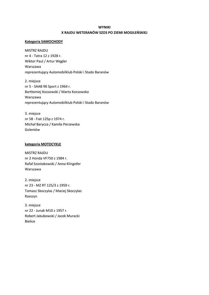 WYNIKI X RAJDU WETERANÓW SZOS PO ZIEMI MOGILEOSKIEJ Kategoria SAMOCHODY MISTRZ RAJDU nr 4 - Tatra 12 z 1928 r. Wiktor Paul / Artur Węgler Warszawa reprezentujący Automobilklub Polski i Stado Baranów 2. miejsce nr 5 - SAAB 96 Sport z 1964 r. Bartłomiej Kossowski / Marta Kossowska Warszawa reprezentujący Automobilklub Polski i Stado Baranów 3. miejsce nr 58 - Fiat 125p z 1974 r. Michał Barycza / Kamila Perzewska Goleniów kategoria MOTOCYKLE MISTRZ RAJDU nr 2 Honda VF750 z 1984 r. Rafał Szostakowski / Anna Klingofer Warszawa 2. miejsce nr 23 - MZ RT 125/3 z 1959 r. Tomasz Skoczylas / Maciej Skoczylas Rzeszyn 3. miejsce nr 22 - Junak M10 z 1957 r. Robert Jakubowski / Jacek Muracki Bielice WYRÓŻNIENIA ZA NAJLEPSZE MIEJSCA W POSZCZEGÓLNYCH KATEGORIACH WIEKOWYCH „pre 45” nr 4 - Tatra 12 z 1928 r. Wiktor Paul / Artur Węgler Warszawa reprezentujący Automobilklub Polski i Stado Baranów „pre 60” nr 95 Volvo z 1960 r. Mirosław Walczak / Magdalena Zajdel Gruszczyn reprezentujący Automobilklub Wielkopolski „pre 70” nr 5 - SAAB 96 Sport z 1964 r. Bartłomiej Kossowski / Marta Kossowska Warszawa reprezentujący Automobilklub Polski i Stado Baranów „post 70” nr 58 - Fiat 125p 1974 r. Michał Barycza / Kamila Perzewska Goleniów
