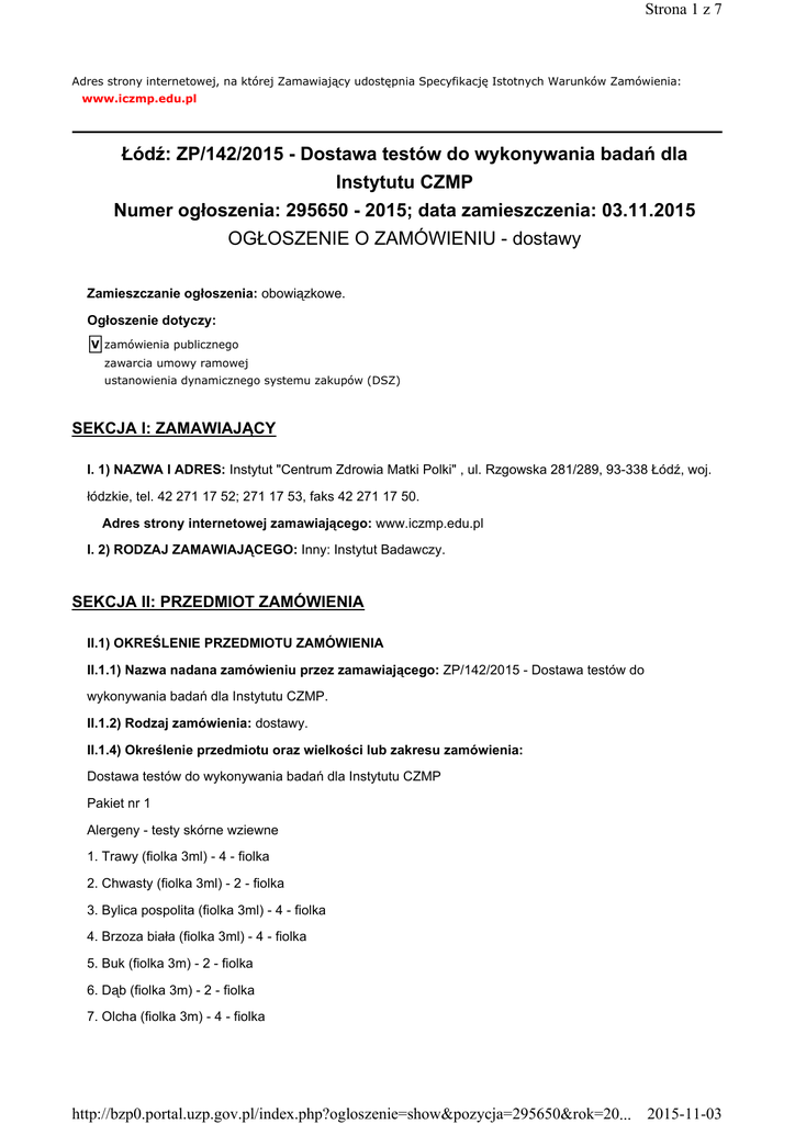 Strona 1 z 7 Adres strony internetowej, na której Zamawiający udostępnia Specyfikację Istotnych Warunków Zamówienia: www.iczmp.edu.pl Łódź: ZP/142/2015 - Dostawa testów do wykonywania badań dla Instytutu CZMP Numer ogłoszenia: 295650 - 2015; data zamieszczenia: 03.11.2015 OGŁOSZENIE O ZAMÓWIENIU - dostawy Zamieszczanie ogłoszenia: obowiązkowe. Ogłoszenie dotyczy: V zamówienia publicznego zawarcia umowy ramowej ustanowienia dynamicznego systemu zakupów (DSZ) SEKCJA I: ZAMAWIAJĄCY I. 1) NAZWA I ADRES: Instytut "Centrum Zdrowia Matki Polki" , ul. Rzgowska 281/289, 93-338 Łódź, woj. łódzkie, tel. 42 271 17 52; 271 17 53, faks 42 271 17 50. Adres strony internetowej zamawiającego: www.iczmp.edu.pl I. 2) RODZAJ ZAMAWIAJĄCEGO: Inny: Instytut Badawczy. SEKCJA II: PRZEDMIOT ZAMÓWIENIA II.1) OKREŚLENIE PRZEDMIOTU ZAMÓWIENIA II.1.1) Nazwa nadana zamówieniu przez zamawiającego: ZP/142/2015 - Dostawa testów do wykonywania badań dla Instytutu CZMP. II.1.2) Rodzaj zamówienia: dostawy. II.1.4) Określenie przedmiotu oraz wielkości lub zakresu zamówienia: Dostawa testów do wykonywania badań dla Instytutu CZMP Pakiet nr 1 Alergeny - testy skórne wziewne 1. Trawy (fiolka 3ml) - 4 - fiolka 2. Chwasty (fiolka 3ml) - 2 - fiolka 3. Bylica pospolita (fiolka 3ml) - 4 - fiolka 4. Brzoza biała (fiolka 3ml) - 4 - fiolka 5. Buk (fiolka 3m) - 2 - fiolka 6. Dąb (fiolka 3m) - 2 - fiolka 7. Olcha (fiolka 3m) - 4 - fiolka http://bzp0.portal.uzp.gov.pl/index.php?ogloszenie=show&pozycja=295650&rok=20... 2015-11-03 Strona 2 z 7 8. Jesion (fiolka 3m) - 2 - fiolka 9. Komosa (fiolka 3m) - 2 - fiolka 10. Parietaria (fiolka 3m) - 2 - fiolka 11. Leszczyna (fiolka 3m) - 4 - fiolka 12. Bez czarny (fiolka 3m) - 2 - fiolka 13. Kłosówka (fiolka 3m) - 2 - fiolka 14. Kupkówka (fiolka 3m) - 2 - fiolka 15. Mniszek lekarski (fiolka 3m) - 2 - fiolka 16. śyto (fiolka 3m) - 4 - fiolka 17. Babka lancetowa (fiolka 3m) - 2 - fiolka 18. Tymotka łąkowa (fiolka 3m) - 2 - fiolka 19. Kostrzewa łąkowa (fiolka 3m) - 2 - fiolka 20. Sierść psa (fiolka 3m) - 4 - fiolka 21. Sierść chomika (fiolka 3m) - 4 - fiolka 22. Sierść królika (fiolka 3m) - 2 - fiolka 23. Sierść kota (fiolka 3m) - 4 - fiolka 24. Sierść świnki morskiej (fiolka 3m) - 2 - fiolka 25. Roztocza ID farinae (fiolka 3m) - 4 - fiolka 26. Roztocza IID pteronyssinus (fiolka 3m) - 4 - fiolka 27. Kurz z siana (fiolka 3m) - 2 - fiolka 28. Candida albicans MS (fiolka 3 ml) - 2 - fiolka 29. Pleśnie 30. Alternaria tenuis (fiolka 3m) - 4 - fiolka 31. Aspergilus fumigatus (fiolka 3m) - 4 - fiolka 32. Cladospotium her (fiolka 3m) - 4 - fiolka 33. Alergeny - testy skórne pokarmowe 34. Owoce cytrusowe (fiolka 3m) - 2 - fiolka 35. Mięsa I (fiolka 3m) - 2 - fiolka 36. Mięsa II (fiolka 3m) - 2 - fiolka 37. Mięso indycze (fiolka 3m) - 2 - fiolka 38. Mięso kurze (fiolka 3m) - 2 - fiolka 39. Wieprzowina (fiolka 3m) - 2 - fiolka 40. Wołowina (fiolka 3m) - 2 - fiolka 41. Pstrąg (fiolka 3m) - 2 - fiolka 42. Dorsz (fiolka 3m) - 2 - fiolka 43. Łosoś (fiolka 3m) - 2 - fiolka http://bzp0.portal.uzp.gov.pl/index.php?ogloszenie=show&pozycja=295650&rok=20... 2015-11-03 Strona 3 z 7 44. Jabłko (fiolka 3m) - 4 - fiolka 45. Pomarańcza (fiolka 3m) - 4 - fiolka 46. Banan (fiolka 3m) - 2 - fiolka 47. Gruszka (fiolka) - 2 - fiolka 48. Truskawka (fiolka 3m) - 4 - fiolka 49. Orzeszki ziemne (fiolka 3m) - 4 - fiolka 50. Orzech laskowy (fiolka 3m) - 2 - fiolka 51. Orzech włoski (fiolka 3m) - 2 - fiolka 52. Winogrona (fiolka 3m) - 2 - fiolka 53. Cytryna (fiolka 3m) - 2 - fiolka 54. Pomidor (fiolka 3m) - 2 - fiolka 55. Papryka (fiolka 3m) - 2 - fiolka 56. Ziemniak (fiolka 3m) - 2 - fiolka 57. Pietruszka (fiolka 3m) - 2 - fiolka 58. Seler (fiolka 3m) - 2 - fiolka 59. Mąka Ŝytnia (fiolka 3m) - 4 - fiolka 60. Mąka pszenna (fiolka 3m) - 4 - fiolka 61. Mąka kukurydziana (fiolka 3m) - 2 - fiolka 62. Mleko krowie (fiolka 3m) - 4 - fiolka 63. śółtko jaja (fiolka 3m) - 2 - fiolka 64. Białko jaja (fiolka 3m) - 4 - fiolka 65. Kakao (fiolka 3m) - 2 - fiolka 66. Marchew (fiolka 3m) - 2 - fiolka 67. Soja (fiolka 3m) - 2 - fiolka 68. Roztwory kontrolne 69. Roztwór kontrolny ujemny - sól fizjologiczna (fiolka 3m) - 6 - fiolka 70. Roztwór kontrolny dodatni - histamina (fiolka 3m) - 6 - fiolka Pakiet nr 2 - Zestaw do wykonywania testów płatkowych 1 Parafenylenodiamina 1,0% waz. - 1 - szt. 2 Siarczan neomycyny 20% waz. - 1 - szt. 3 Benzokaina 5% waz. - 1 - szt. 4 Siarczan niklu sześćiouwodniony 5% waz. - 1 - szt. 5 Mieszanka parabenów 16% waz. - 1 - szt. 6 Alkohol lanoliny (alkohol wełny) 30% waz. - 1 - szt. 7 Mieszanka seskwiterpenów laktonowych 0,1% waz. - 1 - szt. 8 Budezonid 0,01% waz. - 1 - szt. http://bzp0.portal.uzp.gov.pl/index.php?ogloszenie=show&pozycja=295650&rok=20... 2015-11-03 Strona 4 z 7 9 21 - Piwolantiksokartolu 0,1% waz. - 1 - szt. 10 Mieszanka zapachowa II 14% waz. - 1 - szt. 11 Propolis 10% waz. - 1 - szt. 12 Balsam peruwiański - 1 - szt. Pakiet nr 3 1 Panelowe testy narkotykowe wykrywające 10 róŜnych narkotyków w moczu (AMP-BAR-BZO-COCMDMA-MET-MTD-OPI-TCA-THC). - 220 - szt. 2 Szybki test ureazowy mokry lub suchy w diagnostyce przewodu pokarmowego w zakresie wykrywania Helicobacter pylori w wycinkach błony śluzowej Ŝołądka dzieci i dorosłych. Szybki test ureazowy (mokry) - szybkość reakcji, wysoka czułość i specyficzność, krótki czas odczytu - 160 minut, łatwość wykonywania, moŜliwość oceny skuteczności leczenia po kuracji antybiotykowej, przechowywyanie w temperaturze pokojowej. Szybki test ureazowy (suchy) - prostota wykonania badania, wysoka czułość i specyficzność, szybki wynik badania, eliminacja tzw. Blushing effect, moŜliwość oceny stopnia zakaŜenia, nie daje fałszywie dodatnich wyników, wyników z krwią i Ŝółcią, przechowywanie w temperaturze pokojowej. - 2500 - szt. II.1.5) V przewiduje się udzielenie zamówień uzupełniających: Określenie przedmiotu oraz wielkości lub zakresu zamówień