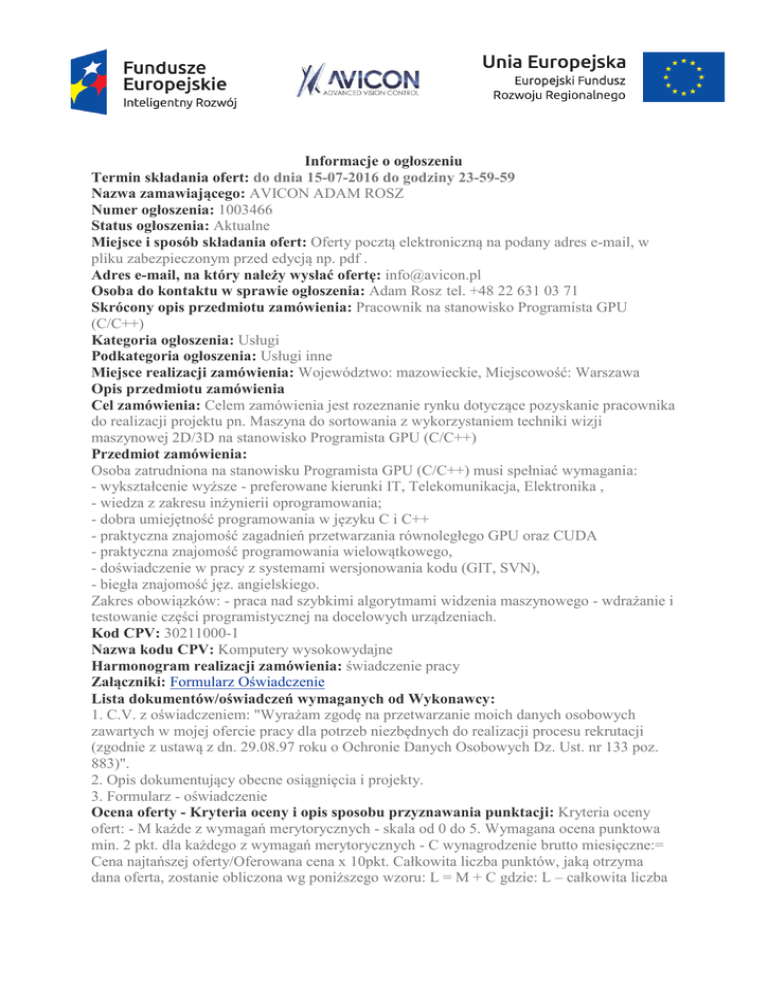 Informacje o ogłoszeniu Termin składania ofert: do dnia 15-07-2016 do godziny 23-59-59 Nazwa zamawiającego: AVICON ADAM ROSZ Numer ogłoszenia: 1003466 Status ogłoszenia: Aktualne Miejsce i sposób składania ofert: Oferty pocztą elektroniczną na podany adres e-mail, w pliku zabezpieczonym przed edycją np. pdf . Adres e-mail, na który należy wysłać ofertę: [email protected] Osoba do kontaktu w sprawie ogłoszenia: Adam Rosz tel. +48 22 631 03 71 Skrócony opis przedmiotu zamówienia: Pracownik na stanowisko Programista GPU (C/C++) Kategoria ogłoszenia: Usługi Podkategoria ogłoszenia: Usługi inne Miejsce realizacji zamówienia: Województwo: mazowieckie, Miejscowość: Warszawa Opis przedmiotu zamówienia Cel zamówienia: Celem zamówienia jest rozeznanie rynku dotyczące pozyskanie pracownika do realizacji projektu pn. Maszyna do sortowania z wykorzystaniem techniki wizji maszynowej 2D/3D na stanowisko Programista GPU (C/C++) Przedmiot zamówienia: Osoba zatrudniona na stanowisku Programista GPU (C/C++) musi spełniać wymagania: - wykształcenie wyższe - preferowane kierunki IT, Telekomunikacja, Elektronika , - wiedza z zakresu inżynierii oprogramowania; - dobra umiejętność programowania w języku C i C++ - praktyczna znajomość zagadnień przetwarzania równoległego GPU oraz CUDA - praktyczna znajomość programowania wielowątkowego, - doświadczenie w pracy z systemami wersjonowania kodu (GIT, SVN), - biegła znajomość jęz. angielskiego. Zakres obowiązków: - praca nad szybkimi algorytmami widzenia maszynowego - wdrażanie i testowanie części programistycznej na docelowych urządzeniach. Kod CPV: 30211000-1 Nazwa kodu CPV: Komputery wysokowydajne Harmonogram realizacji zamówienia: świadczenie pracy Załączniki: Formularz Oświadczenie Lista dokumentów/oświadczeń wymaganych od Wykonawcy: 1. C.V. z oświadczeniem: "Wyrażam zgodę na przetwarzanie moich danych osobowych zawartych w mojej ofercie pracy dla potrzeb niezbędnych do realizacji procesu rekrutacji (zgodnie z ustawą z dn. 29.08.97 roku o Ochronie Danych Osobowych Dz. Ust. nr 133 poz. 883)". 2. Opis dokumentujący obecne osiągnięcia i projekty. 3. Formularz - oświadczenie Ocena oferty - Kryteria oceny i opis sposobu przyznawania punktacji: Kryteria oceny ofert: - M każde z wymagań merytorycznych - skala od 0 do 5. Wymagana ocena punktowa min. 2 pkt. dla każdego z wymagań merytorycznych - C wynagrodzenie brutto miesięczne:= Cena najtańszej oferty/Oferowana cena x 10pkt. Całkowita liczba punktów, jaką otrzyma dana oferta, zostanie obliczona wg poniższego wzoru: L = M + C gdzie: L – całkowita liczba punktów, M - punkty uzyskane za spełnienie wymagań merytorycznych, C – punkty uzyskane w kryterium „Cena”. Wykluczenia: Z udziału w postępowaniu wykluczone są podmioty powiązane osobowo i kapitałowo z Zamawiającym. Przez powiązania kapitałowe lub osobowe rozumie się wzajemne powiązania między Zamawiającym lub osobami upoważnionymi do zaciągania zobowiązań w imieniu zamawiającego lub osobami wykonującymi w imieniu zamawiającego czynności związane z przygotowaniem i przeprowadzaniem procedury wyboru wykonawcy, a Wykonawcą, polegające w szczególności na: 1) uczestniczeniu w spółce, jako wspólnik spółki cywilnej lub spółki osobowej, 2) posiadaniu co najmniej 10 % udziałów lub akcji, 3) pełnieniu funkcji członka organu nadzorczego lub zarządzającego, prokurenta, pełnomocnika, 4) pozostawaniu w związku małżeńskim, w stosunku pokrewieństwa lub powinowactwa w linii prostej, pokrewieństwa drugiego stopnia lub powinowactwa drugiego stopnia w linii bocznej lub w stosunku przysposobienia, opieki lub kurateli. Każdy z oferentów, odpowiadając na zapytanie ofertowe, powinien złożyć Oświadczenie o braku powiązań osobowych i kapitałowych – według wzoru stanowiącego załącznik nr 1 do niniejszego ogłoszenia. Zamawiający (beneficjent): AVICON ADAM ROSZ Tytuł projektu: Maszyna do sortowania z wykorzystaniem techniki wizji maszynowej 2D/3D Numer projektu: POIR.01.01.01-00-0392/15-00