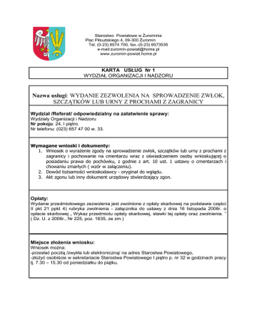Starostwo Powiatowe w Żurominie Plac Piłsudskiego 4, 09-300 Żuromin Tel. (0-23) 6574 700, fax.-(0-23) 6573535 e-mail:[email protected] www.zuromin-powiat.home.pl KARTA USŁUG Nr 1 WYDZIAŁ ORGANIZACJI I NADZORU Nazwa usługi: WYDANIE ZEZWOLENIA NA SPROWADZENIE ZWŁOK, SZCZĄTKÓW LUB URNY Z PROCHAMI Z ZAGRANICY Wydział /Referat/ odpowiedzialny na załatwienie sprawy: Wydziały Organizacji i Nadzoru Nr pokoju: 24, I piętro. Nr telefonu: (023) 657 47 00 w. 33. Wymagane wnioski i dokumenty: 1. Wniosek o wyrażenie zgody na sprowadzenie zwłok, szczątków lub urny z prochami z zagranicy i pochowanie na cmentarzu wraz z oświadczeniem osoby wnioskującej o posiadaniu prawa do pochówku, z godnie z art. 10 ust. 1 ustawy o cmentarzach i chowaniu zmarłych ( wzór w załączeniu). 2. Dowód tożsamości wnioskodawcy - oryginał do wglądu. 3. Akt zgonu lub inny dokument urzędowy stwierdzający zgon. Opłaty: Wydanie przedmiotowego zezwolenia jest zwolnione z opłaty skarbowej na podstawie części II pkt 21 ppkt 4) rubryka zwolnienia - załącznika do ustawy z dnia 16 listopada 2006r. o opłacie skarbowej „ Wykaz przedmiotu opłaty skarbowej, stawki tej opłaty oraz zwolnienia. ” ( Dz. U. z 2006r., Nr 225, poz. 1635, ze zm.) Miejsce złożenia wniosku: Wniosek można: -przesłać pocztą /zwykła lub elektroniczną/ na adres Starostwa Powiatowego, -złożyć osobiście w sekretariacie Starostwa Powiatowego I piętro p. nr 32 w godzinach pracy tj. 7.30 – 15.30 od poniedziałku do piątku. Termin załatwienia sprawy: Sprawę załatwia się niezwłocznie, nie później jednak niż w terminie 3 dni od dnia otrzymania wniosku. Podstawa prawna: 1. Ustawa z dnia 31 stycznia 1959 roku o cmentarzach i chowaniu zmarłych (t.j. z 2000r., Nr 23, poz. 295, ze zm.). 2. Rozporządzenie Ministra Zdrowia z dnia 27 grudnia 2007r. w sprawie wydawania pozwoleń i zaświadczeń na przewóz zwłok i szczątków ludzkich (Dz. U. Nr 249, Nr 1866). Tryb odwoławczy: Od decyzji o odmowie wydania zezwolenia na sprowadzenie zwłok, szczątków lub urny przysługuje odwołanie do Samorządowego Kolegium Odwoławczego w Ciechanowie, w terminie 14 dni od daty jej otrzymania, za pośrednictwem Starosty Żuromińskiego. Adres: SKO 06-400 Ciechanów ul. Rzeczkowska 6, Uwagi: Prawo do informacji publicznej podlega ograniczeniu ze względu na : -prywatność osoby fizycznej lub tajemnicy przedsiębiorcy, -ochronę informacji niejawnych, -ochronę innych tajemnic ustawowo określonych np. tajemnica skarbowa, statystyczna. Ograniczenie to nie dotyczy informacji o osobach pełniących funkcje publiczne , mających związek z pełnieniem tych funkcji, w tym o warunkach powierzenia i wykonywania funkcji oraz przypadku , gdy osoba fizyczna lub przedsiębiorstwo rezygnują z przysługującego im prawa. Aktualność kart jest sprawdzana nie rzadziej niż raz na trzy miesiące. Opracował: Sprawdził: Zatwierdził: Żuromin, dnia ............................................ .......................................................... ( imię i nazwisko wnioskodawcy) ................................................................... ( miejsce zamieszkania, adres wnioskodawcy) DO STAROSTY ŻUROMIŃSKIEGO Wniosek o wydanie zezwolenia na sprowadzenie zwłok i szczątków z obcego państwa wnoszę o zezwolenie na sprowadzenie z ..................................................................................... ....................................................................................................................................................... ( nazwa państwa i miejscowości, z której zostaną sprowadzone zwłoki) do Polski zwłok/ szczątków/ urny z prochami* ........................................................................... ....................................................................................................................................................... ( imię i nazwisko osoby zmarłej) z domu* .............................................................. urodzonego /ej dnia ........................................ w .................................................... ostatnio zamieszkałej w ....................................................... zmarłej dnia ............................................................. w ................................................................ ....................................................................................................................................................... (nazwa państwa i miejscowości, w której nastąpił zgon) w celu pochowania na cmentarzu ............................................................................................... ( nazwa cmentarza i miejscowości) ....................................................................................................................................................... .............................. Przyczyną śmierci była niżej wskazana (podkreślić właściwą) / nie była* niżej wymieniona choroba zakaźna: 1) cholera, 2) dur wysypkowy i inne riketsjozy, 3) dżuma, 4) gorączka powrotna, 5) nagminne porażenie dziecięce, 6) nosacizna, 7) trąd, 8) wąglik, 9) wścieklizna, 10) żółta gorączka i inne wirusowe gorączki krwotoczne. Zwłoki /szczątki/ urna z prochami* zostaną/nie wywiezione/a z ................................... dnia ............................ następującym środkiem transportu ....................................................... .................................................................................................................................... (wskazać jakim) Jednocześnie oświadczam pod rygorem odpowiedzialności karnej za składanie fałszywych zeznań, że zgodnie z art. 10 ust. 1 ustawy z dnia 31 stycznia 1959 r. o cmentarzach i chowaniu zmarłych (Dz. U. z 2000 r., Nr 23, poz. 295, ze zm.) jestem osobą uprawnioną do pochowania zwłok/ szczątków / urny z prochami * ww. osoby. .......