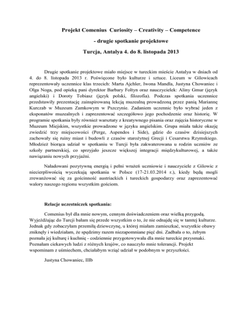 Projekt Comenius Curiosity – Creativity – Competence - drugie spotkanie projektowe Turcja, Antalya 4. do 8. listopada 2013 Drugie spotkanie projektowe miało miejsce w tureckim mieście Antalya w dniach od 4. do 8. listopada 2013 r. Poświęcone było kulturze i sztuce. Liceum w Gilowicach reprezentowały uczennice klas trzecich: Marta Ajchler, Iwona Mandla, Justyna Chowaniec i Olga Noga, pod opieką pani dyrektor Barbary Foltyn oraz nauczycielek: Aliny Gmur (język angielski) i Doroty Tobiasz (język polski, filozofia). Podczas spotkania uczennice przedstawiły prezentację zainspirowaną lekcją muzealną prowadzoną przez panią Mariannę Kurczab w Muzeum Zamkowym w Pszczynie. Zadaniem uczennic było wybrać jeden z eksponatów muzealnych i zaprezentować szczegółowo jego pochodzenie oraz historię. W programie spotkania były również warsztaty z kreatywnego pisania oraz zajęcia historyczne w Muzeum Miejskim, wszystkie prowadzone w języku angielskim. Grupa miała także okazję zwiedzić trzy miejscowości (Perge, Aspendos i Side), gdzie do czasów dzisiejszych zachowały się ruiny miast i budowli z czasów starożytnej Grecji i Cesarstwa Rzymskiego. Młodzież biorąca udział w spotkaniu w Turcji była zakwaterowana u rodzin uczniów ze szkoły partnerskiej, co sprzyjało jeszcze większej integracji międzykulturowej, a także nawiązaniu nowych przyjaźni. Naładowani pozytywną energią i pełni wrażeń uczniowie i nauczyciele z Gilowic z niecierpliwością wyczekują spotkania w Polsce (17-21.03.2014 r.), kiedy będą mogli zrewanżować się za gościnność austriackich i tureckich gospodarzy oraz zaprezentować walory naszego regionu wszystkim gościom. Relacje uczestniczek spotkania: Comenius był dla mnie nowym, cennym doświadczeniem oraz wielką przygodą. Wyjeżdżając do Turcji bałam się przede wszystkim o to, że nie odnajdę się w tamtej kulturze. Jednak gdy zobaczyłam przemiłą dziewczynę, u której miałam zamieszkać, wszystkie obawy zniknęły i wiedziałam, że spędzimy razem niezapomniane pięć dni. Zadbała o to, żebym poznała jej kulturę i kuchnię - codziennie przygotowywała dla mnie tureckie przysmaki. Poznałam ciekawych ludzi z różnych krajów, co nauczyło mnie tolerancji. Projekt wspominam z uśmiechem, chciałabym wziąć udział w podobnym w przyszłości. Justyna Chowaniec, IIIb Uczestnictwo w „Comeniusie” dało nam możliwość przeżycia ciekawej przygody. Przyłączając się do projektu nie miałam pojęcia, że z Turcji oprócz „pamiątkowego” nadbagażu przywiozę mnóstwo miłych wspomnień i niezapomnianych wrażeń ☺ Przez kilka dni byłyśmy goszczone przez rodziny tureckie, dzięki czemu mogłyśmy poznać tamtejsze zwyczaje i kulturę. Atrakcyjne miejsca, które zwiedzałyśmy, pozostaną nam na długo w pamięci, a na wszelki wypadek wszystkie udokumentowałyśmy zdjęciowo ☺ Co przyniosło mi największą radość? Nie powiem, że kebaby, choć smakowały rewelacyjnie! Reprezentanci różnych krajów mogli spotkać się w tym uroczym mieście, jakim jest Antalya, w tym my – Polki, podczas gdy w kraju ojczyźnianym zimno i plucha jesienna - stąd pewnie w drodze powrotnej szok termiczny... Prowadzenie dialogów w obcym języku, przygotowywanie prezentacji w ramach zajęć projektowych było świetnym sposobem na sprawdzenie swoich możliwości i dobrym pomysłem na poznanie siebie i innych. Bardzo się cieszę, że biorę udział w tym przedsięwzięciu. Marta Ajchler, IIIa Antalya to zdecydowanie miejsce do którego chciałabym jeszcze kiedyś wrócić. Zwiedziliśmy wiele ciekawych miejsc między innymi stare miasto, ruiny w Aspendos i Side, miałyśmy okazję spróbować typowych potraw dla tego regionu, posłuchać tradycyjnej tureckiej muzyki, a nawet do niej zatańczyć lub raczej starać się naśladować kolegów. Najmilej jednak wspominam czas, który spędziłam z moją nową rodzinką ( to właśnie tak nazywałyśmy goszczące nas rodziny) i niekończące się wieczorne rozmowy z Deniz. Miałam okazję poczuć niesamowitą gościnność Turków, a w nowym domu już od pierwszego wieczoru zostałam zapoznana z niektórymi tureckimi tradycjami jak np. picie herbaty w specjalnie do tego przeznaczonych szklaneczkach, zaraz po kolacji. Wyjazd ten był dla mnie doświadczeniem którego na pewno nigdy nie zapomnę. Cieszę się, że mogłam zobaczyć piękne zakątki tego kraju, nauczyć się wielu nowych rzeczy i przede wszystkim poznać wspaniałych ludzi. Mam tylko nadzieję, że przyjaźnie które zawarliśmy w trakcie trwania wyjazdu będą trwały jeszcze długo po zakończeniu tego projektu. Pozdrawiam, Iwona Mandla, III a If I had a choice, I would like to stay in Turkey for more than 5 days. It was a really great time with people from other countries! It wasn't just a school trip. I met very friendly and nice people, new culture, tradition and tasted delicious dishes. I'm glad of choosing a school which gave me a possibility of taking part in a Comenius project. Now, I'm just waiting for arrival of my 'host sister' to Poland! Olga Noga, IIIa