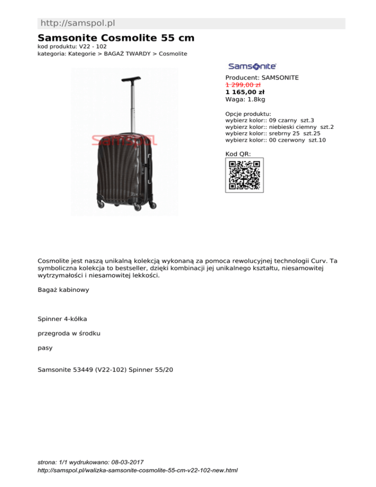 http://samspol.pl Samsonite Cosmolite 55 cm kod produktu: V22 - 102 kategoria: Kategorie > BAGAŻ TWARDY > Cosmolite Producent: SAMSONITE 1 299,00 zł 1 165,00 zł Waga: 1.8kg Opcje produktu: wybierz kolor:: 09 czarny szt.3 wybierz kolor:: niebieski ciemny szt.2 wybierz kolor:: srebrny 25 szt.25 wybierz kolor:: 00 czerwony szt.10 Kod QR: Cosmolite jest naszą unikalną kolekcją wykonaną za pomoca rewolucyjnej technologii Curv. Ta symboliczna kolekcja to bestseller, dzięki kombinacji jej unikalnego kształtu, niesamowitej wytrzymałości i niesamowitej lekkości. Bagaż kabinowy Spinner 4-kółka przegroda w środku pasy Samsonite 53449 (V22-102) Spinner 55/20 strona: 1/1 wydrukowano: 08-03-2017 http://samspol.pl/walizka-samsonite-cosmolite-55-cm-v22-102-new.html