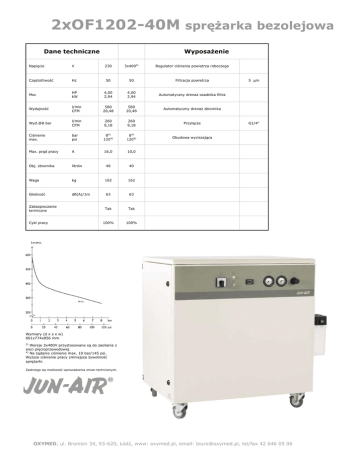 2xOF1202-40M sprężarka bezolejowa Dane techniczne Wyposażenie Napięcie V 230 3x4002) Regulator ciśnienia powietrza roboczego Częstotliwość Hz 50 50 Filtracja powietrza Moc HP kW 4,00 2,94 4,00 2,94 Automatyczny drenaż osadnika filtra Wydajność l/min CFM 580 20,48 580 20,48 Automatyczny drenaż zbiornika Wyd.@8 bar l/min CFM 260 9,18 260 9,18 Przyłącze Ciśnienie max. bar psi 84) 1204) 84) 1204) Obudowa wyciszająca Max. prąd pracy A 16,0 10,0 Obj. zbiornika litrów 40 40 Waga kg 162 162 Głośność dB(A)/1m 63 63 Tak Tak 100% 100% Zabezpieczenie termiczne Cykl pracy 5 µm G1/4‟ Wymiary (d x s x w) 661x774x856 mm 2) Wersje 3x400V przystosowane są do zasilania z sieci pięcioprzewodowej. 4) Na żądanie ciśnienie max. 10 bar/145 psi. Wyższe ciśnienie pracy zmniejsza żywotność sprężarki. Zastrzega się możliwość wprowadzenia zmian technicznych. OXYMED, ul. Bronisin 34, 93-620, Łódź, www: oxymed.pl, email: [email protected], tel/fax 42 646 05 06