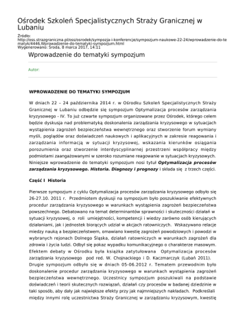 Ośrodek Szkoleń Specjalistycznych Straży Granicznej w Lubaniu Źródło: http://oss.strazgraniczna.pl/oss/osrodek/sympozja-i-konferencje/sympozjum-naukowe-22-24/wprowadzenie-do-te matyk/4446,Wprowadzenie-do-tematyki-sympozjum.html Wygenerowano: Środa, 8 marca 2017, 14:11 Wprowadzenie do tematyki sympozjum Autor: WPROWADZENIE DO TEMATYKI SYMPOZJUM W dniach 22 – 24 października 2014 r. w Ośrodku Szkoleń Specjalistycznych Straży Granicznej w Lubaniu odbędzie się sympozjum Optymalizacja procesów zarządzania kryzysowego - IV. To już czwarte sympozjum organizowane przez Ośrodek, którego celem będzie dyskusja nad problematyką doskonalenia zarządzania kryzysowego w sytuacjach wystąpienia zagrożeń bezpieczeństwa wewnętrznego oraz stworzenie forum wymiany myśli, poglądów oraz doświadczeń naukowych i aplikacyjnych w zakresie reagowania i zarządzania informacją w sytuacji kryzysowej, wskazania kierunków osiągania porozumienia oraz stworzenie interdyscyplinarnej przestrzeni współpracy między podmiotami zaangażowanymi w szeroko rozumiane reagowanie w sytuacjach kryzysowych. Niniejsze wprowadzenie do tematyki sympozjum nosi tytuł Optymalizacja procesów zarządzania kryzysowego. Historia. Diagnozy i prognozy i składa się z trzech części. Część I Historia Pierwsze sympozjum z cyklu Optymalizacja procesów zarządzania kryzysowego odbyło się 26-27.10. 2011 r. Przedmiotem dyskusji na sympozjum było poszukiwanie efektywnych procedur zarządzania kryzysowego w warunkach wystąpienia zagrożeń bezpieczeństwa powszechnego. Debatowano na temat determinantów sprawności i skuteczności działań w sytuacji kryzysowej, o roli umiejętności, kompetencji i wiedzy zarówno osób kierujących działaniami, jak i jednostek biorących udział w akcjach ratowniczych. Wskazywano relacje miedzy nauką a bezpieczeństwem, omawiano kwestię zagrożeń powodziowych i powodzi w wybranych rejonach Dolnego Śląska, działań ratowniczych w warunkach zagrożeń dla zdrowia i życia ludzi. Odbył się pokaz wypadku komunikacyjnego o charakterze masowym. Efektem debaty w Ośrodku była książka zatytułowana Optymalizacja procesów zarządzania kryzysowego pod red. W. Chojnackiego i D. Kaczmarczyk (Lubań 2011). Drugie sympozjum odbyło się w dniach 05-06.2012 r. Tematem przewodnim było doskonalenie procedur zarządzania kryzysowego w warunkach wystąpienia zagrożeń bezpieczeństwa wewnętrznego. Uczestnicy sympozjum poszukiwali na podstawie doświadczeń i teorii skutecznych rozwiązań, działań czy procesów w badanej dziedzinie w taki sposób, aby dały jak największe efekty przy jak najmniejszych nakładach. Podkreślali między innymi rolę uczestnictwa Straży Granicznej w zarządzaniu kryzysowym, kwestię doskonalenia systemu zarządzania kryzysowego Straży Granicznej. Pokłosiem konferencji była dwutomowa monografia Zarządzanie kryzysowe. Tom I Uwarunkowania teoretyczne, prawne i organizacyjne. Tom II. Diagnoza rozwiązań praktycznych w zakresie bezpieczeństwa wewnętrznego (Legnica 2012). Trzecie sympozjum odbyło się 3.10.2013 r. i jego celem było zarówno wskazanie możliwych kierunków zmian mających na celu poprawę efektywności działania w sytuacjach kryzysowych, jak i kwestia zarządzania informacją, w tym relacji z mediami. Uczestnicy sympozjum poruszali w wystąpieniach problematykę komunikowania kryzysowego, prowadzenia efektywnej polityki informacyjnej, możliwości wykorzystania Systemu Wspomagania Kierowania w systemie zarządzania granicami, efektywności działań SG przypadku ewakuacji Międzynarodowego Portu Lotniczego, sposobów doskonalenia systemu zarządzania kryzysowego Straży Granicznej. Efektem spotkania uczestników sympozjum była książka zatytułowana Optymalizacja procesów zarządzania kryzysowego. Część III pod red. J. Stawnickiej. Część II Diagnozy Czwarte sympozjum Optymalizacja procesów zarządzania kryzysowego IV odbędzie się w Ośrodku Szkoleń Specjalistycznych Straży Granicznej w Lubaniu w dniach 22 – 214.10.2014 r. Celem czwartego sympozjum jest zdiagnozowanie skutecznych działań w obszarze zarządzania kryzysowego i komunikacji z mediami w kryzysie. Wystąpienia uczestników – przedstawicieli władz centralnych, lokalnych, służb mundurowych oraz świata nauki będą się koncentrowały wokół dwóch obszarów: zarządzanie kryzysowe oraz obsługa medialna kryzysu. Celem sympozjum jest utworzenie interdyscyplinarnej przestrzeni współpracy i wymiany doświadczeń praktyków i przedstawicieli nauki, wymiana poglądów i doświadczeń związanych z udziałem SG w zarządzaniu kryzysowym, wywołania dyskusji nad aktualnymi problemami rozwoju teorii i praktyki zarządzania kryzysowego. W czasie konferencji prezentowane będą zagadnienia teoretyczne i praktyczne związane z problematyką zarządzania kryzysowego, w tym kwestie zagrożenia bezpieczeństwa rejonów przygranicznych wschodniej granicy UE, doświadczeń polskich służb granicznych i celnych w zakresie zintegrowanego zarządzania granicami na przykładzie granicy polsko-ukraińskiej. Poruszana będzie kwestia współpracy Straży Granicznej z Policją w ochronie wschodniej granicy Polski, z Siłami Zbrojnymi RP w zakresie przeciwdziałania zagrożeniom na polskich obszarach morskich. Odrębne zagadnienie dotyczy ćwiczeń służb podległych MSW, które odbyły się w dniach 23-25 kwietnia 2014 t. perspektywy praktyków, badań przepływu informacji oraz obrazu medialnego i obsługi medialnej ćwiczeń. W kręgu media relations pozostanie temat manipulowania przez media informacją. Poruszone zostaną kwestie Systemu Wspomagania Kierowania SG, a także problematyka związana z przygotowaniami systemu zarządzania kryzysowego w RP na wypadek masowego napływu cudzoziemców. Dzięki nowej ustawie o cudzoziemcach która weszła w życie z dniem 1 maja 2014 r., Straż Graniczna jest wiodąca instytucją w zakresie rozpoznawania, zapobi