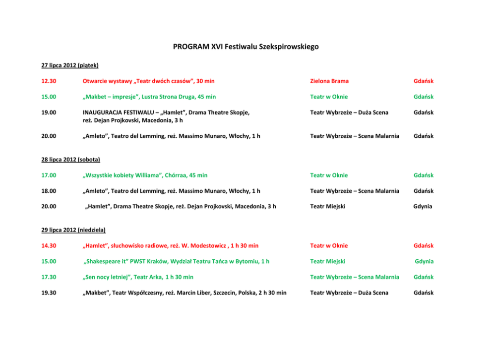 PROGRAM XVI Festiwalu Szekspirowskiego 27 lipca 2012 (piątek) 12.30 Otwarcie wystawy „Teatr dwóch czasów”, 30 min Zielona Brama Gdańsk 15.00 „Makbet – impresje”, Lustra Strona Druga, 45 min Teatr w Oknie Gdańsk 19.00 INAUGURACJA FESTIWALU – „Hamlet”, Drama Theatre Skopje, reż. Dejan Projkovski, Macedonia, 3 h Teatr Wybrzeże – Duża Scena Gdańsk 20.00 „Amleto”, Teatro del Lemming, reż. Massimo Munaro, Włochy, 1 h Teatr Wybrzeże – Scena Malarnia Gdańsk 28 lipca 2012 (sobota) 17.00 „Wszystkie kobiety Williama”, Chórraa, 45 min Teatr w Oknie Gdańsk 18.00 „Amleto”, Teatro del Lemming, reż. Massimo Munaro, Włochy, 1 h Teatr Wybrzeże – Scena Malarnia Gdańsk Teatr Miejski Gdynia 20.00 „Hamlet”, Drama Theatre Skopje, reż. Dejan Projkovski, Macedonia, 3 h 29 lipca 2012 (niedziela) 14.30 „Hamlet”, słuchowisko radiowe, reż. W. Modestowicz , 1 h 30 min Teatr w Oknie Gdańsk 15.00 „Shakespeare it” PWST Kraków, Wydział Teatru Tańca w Bytomiu, 1 h Teatr Miejski Gdynia 17.30 „Sen nocy letniej”, Teatr Arka, 1 h 30 min Teatr Wybrzeże – Scena Malarnia Gdańsk 19.30 „Makbet”, Teatr Współczesny, reż. Marcin Liber, Szczecin, Polska, 2 h 30 min Teatr Wybrzeże – Duża Scena Gdańsk 20.00 „Burza”, Teatr Polski, Bydgoszcz, reż. Maja Kleczewska, Polska, 2 h 30 min (wyjazd autokarem 17.00) Teatr Polski Bydgoszcz Teatr w Oknie Gdańsk 30 lipca 2012 (poniedziałek) 16.00 „Julia”, film, reż. Agnieszka Ślisz, 20 min 17.30 „Opus Hamlet”, HamletScenen / Walny Theatre, reż. Adam Walny i Lars Kynde Dania / Polska, 30 min Teatr Wybrzeże – Scena Malarnia Gdańsk 18.30 „Opus Hamlet”, HamletScenen / Walny Theatre, reż. Adam Walny i Lars Kynde Dania / Polska, 30 min Teatr Wybrzeże – Scena Malarnia Gdańsk 19.30 „Opus Hamlet”, HamletScenen / Walny Theatre, reż. Adam Walny i Lars Kynde Dania / Polska, 30 min Teatr Wybrzeże – Scena Malarnia Gdańsk 19.30 „Makbet”, Teatr Współczesny, reż. Marcin Liber, Szczecin, Polska, 2 h 30 min Teatr Wybrzeże – Duża Scena Gdańsk 20.00 „Burza”, Teatr Polski, Bydgoszcz, reż. Maja Kleczewska, Polska, 2 h 30 min (wyjazd autokarem 17.00) Teatr Polski Bydgoszcz 21.00 Performance Anny Kalwajtys oraz Katarzyny Pastuszak, 1 h Teatr w Oknie Gdańsk 31 lipca 2012 (wtorek) 15.00 „Nie płacz, Kordelio”, In gremio , 30 min Teatr w Oknie Gdańsk 18.00 „Hamlet”, Teatr Walny i Lars Kynde, reż. Adam Walny, Dania / Polska, 1 h Teatr Wybrzeże – Czarna Sala Gdańsk 20.00 „Lear. Komedia”, Teatr Prijut Komedianta, reż. Konstantin Bogomołow, Rosja, 3 h Teatr Wybrzeże – Scena Kameralna Sopot 1 sierpnia 2012 (środa) 16.00 „Hamlet”, słuchowisko radiowe, reż. W. Modestowicz, 1 h 30 min Park Kolibki Gdynia 18.00 „Hamlet”, Teatr Walny i Lars Kynde, reż. Adam Walny, Dania / Polska, 1 h Park Kolibki Gdynia 20.00 „Lear. Komedia”, Teatr Prijut Komedianta, reż. Konstantin Bogomołow, Rosja, 3 h Teatr Wybrzeże – Scena Kameralna Sopot 21.30 Koncert HYPERPOTAMUS, Hiszpania, 1 h Teatr w Oknie Gdańsk 2 sierpnia 2012 (czwartek) 15.00 „Ofelia”, spektakl studentów Akademii Teatralnej w Warszawie, 30 min Teatr w Oknie Gdańsk 17.00 „Król Ryszard III”, Teatr im. Jaracza, reż. Grzegorz Wiśniewski, Łódź, Polska, 2 h Teatr Wybrzeże – Duża Scena Gdańsk 20:30 „Król Ryszard III”, Teatr im. Jaracza, reż. Grzegorz Wiśniewski, Łódź, Polska, 2 h Teatr Wybrzeże – Duża Scena Gdańsk 3 sierpnia 2012 (piątek) 13.00 „Shylock”, monodram Piotra Kondrata, 1 h Teatr w Oknie Gdańsk 15.00 „Szekspiracje” WGWK, 1 h Teatr w Oknie Gdańsk 18.00 „Shylock”, monodram Piotra Kondrata, 1 h Teatr w Oknie Gdańsk 18.30 „Opowieść zimowa”, Parrabbola, Wielka Brytania, 2 h 30 min Wydział Rzeźby ASP, Plac Wałowy 15 Gdańsk 21.00 Film o spektaklu „Burza”, Teatr Narodowy w Krajowej, Rumunia, 1 h 20 min Teatr w Oknie Gdańsk 4 sierpnia 2012 (sobota) 18.30 19.00 20.00 „Opowieść zimowa”, Parrabola, Wielka Brytania, 2 h 30 min „Julia”, film, reż. Agnieszka Ślisz , 20 min „Burza”, Teatr Narodowy w Krajowej, reż. Silviu Purcărete, Rumunia, 2 h Wydział Rzeźby ASP, Plac Wałowy 15 Gdańsk Teatr w Oknie Gdańsk Teatr Wybrzeże – Duża Scena Gdańsk Gdańsk 5 sierpnia 2012 (niedziela) 13.00 PARADA PLENER 18.30 „Opowieść zimowa”, Parrabbola, Wielka Brytania, 2 h 30 min Wydział Rzeźby ASP, Plac Wałowy 15 Gdańsk 18.30 „Hamlet”, Thalia Theater, reż. Luk Perceval, Niemcy, 1 h 50 min Opera Bałtycka Gdańsk 20.00 „Burza”, Teatr Narodowy w Krajowej, reż. Silviu Purcărete, Rumunia, 2 h Teatr Wybrzeże – Duża Scena Gdańsk „Opowieść zimowa”, Parrabbola, Wielka Brytania, 2 h 30 min Wydział Rzeźby ASP, Plac Wałowy 15 Gdańsk 6 sierpnia 2012 18.30 LEGENDA: program główny wydarzenia specjalne SzekspirOFF