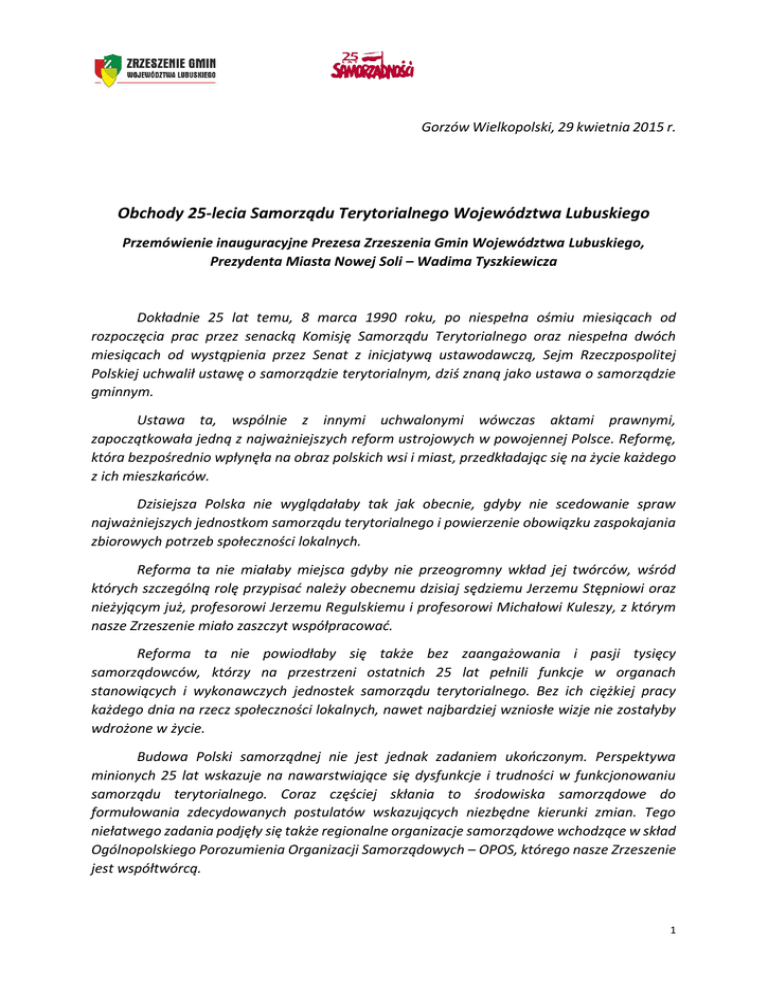 Gorzów Wielkopolski, 29 kwietnia 2015 r. Obchody 25-lecia Samorządu Terytorialnego Województwa Lubuskiego Przemówienie inauguracyjne Prezesa Zrzeszenia Gmin Województwa Lubuskiego, Prezydenta Miasta Nowej Soli – Wadima Tyszkiewicza Dokładnie 25 lat temu, 8 marca 1990 roku, po niespełna ośmiu miesiącach od rozpoczęcia prac przez senacką Komisję Samorządu Terytorialnego oraz niespełna dwóch miesiącach od wystąpienia przez Senat z inicjatywą ustawodawczą, Sejm Rzeczpospolitej Polskiej uchwalił ustawę o samorządzie terytorialnym, dziś znaną jako ustawa o samorządzie gminnym. Ustawa ta, wspólnie z innymi uchwalonymi wówczas aktami prawnymi, zapoczątkowała jedną z najważniejszych reform ustrojowych w powojennej Polsce. Reformę, która bezpośrednio wpłynęła na obraz polskich wsi i miast, przedkładając się na życie każdego z ich mieszkańców. Dzisiejsza Polska nie wyglądałaby tak jak obecnie, gdyby nie scedowanie spraw najważniejszych jednostkom samorządu terytorialnego i powierzenie obowiązku zaspokajania zbiorowych potrzeb społeczności lokalnych. Reforma ta nie miałaby miejsca gdyby nie przeogromny wkład jej twórców, wśród których szczególną rolę przypisać należy obecnemu dzisiaj sędziemu Jerzemu Stępniowi oraz nieżyjącym już, profesorowi Jerzemu Regulskiemu i profesorowi Michałowi Kuleszy, z którym nasze Zrzeszenie miało zaszczyt współpracować. Reforma ta nie powiodłaby się także bez zaangażowania i pasji tysięcy samorządowców, którzy na przestrzeni ostatnich 25 lat pełnili funkcje w organach stanowiących i wykonawczych jednostek samorządu terytorialnego. Bez ich ciężkiej pracy każdego dnia na rzecz społeczności lokalnych, nawet najbardziej wzniosłe wizje nie zostałyby wdrożone w życie. Budowa Polski samorządnej nie jest jednak zadaniem ukończonym. Perspektywa minionych 25 lat wskazuje na nawarstwiające się dysfunkcje i trudności w funkcjonowaniu samorządu terytorialnego. Coraz częściej skłania to środowiska samorządowe do formułowania zdecydowanych postulatów wskazujących niezbędne kierunki zmian. Tego niełatwego zadania podjęły się także regionalne organizacje samorządowe wchodzące w skład Ogólnopolskiego Porozumienia Organizacji Samorządowych – OPOS, którego nasze Zrzeszenie jest współtwórcą. 1 Z okazji ustanowionego przez Senat roku 2015 rokiem obchodów 25-lecia samorządu terytorialnego, wspólnie z innymi organizacjami z terenu całej Polski sformułowaliśmy 25 postulatów na 25-lecie funkcjonowania samorządu terytorialnego, w których zwracamy uwagę na podstawowe problemy dotyczące: ustroju jednostek samorządu terytorialnego, sposobu ich finansowania, zadań na nie nakładanych, jak również kontroli i nadzoru nad ich działalnością. Sformułowaliśmy także postulaty dotyczące trybu tworzenia prawa samorządowego, które coraz częściej powstaje w sposób chaotyczny, w oderwaniu od spójnej i całościowej wizji. Wyrażamy nadzieję, iż nasz głos w dyskusji na temat przyszłości samorządu terytorialnego w Polsce okaże się słyszalny. Liczymy na to, iż wyrażając nasze postulaty, uda się nam wpłynąć na przyszły kształt samorządu terytorialnego, stanowiącego jeden z fundamentów demokratycznego państwa prawa oraz społeczeństwa obywatelskiego, które wspólnie pragniemy kształtować. Z tego miejsca również, jako Prezes Zrzeszenia Gmin Województwa Lubuskiego drugiej kadencji, pragnę serdecznie podziękować Koleżankom i Kolegom samorządowcom, za okazane dotychczas zaangażowanie we wspólne działania stowarzyszenia. Wszystkim osobom i instytucjom - Posłom, Senatorom, Przedstawicielom Władz Państwowych i Regionalnych, serdecznie dziękujemy za podjęte wszelkie inicjatywy, które polepszają stan polskiego prawa, otwierają ścieżkę dialogu, a co za tym idzie, budują solidne podstawy do właściwego funkcjonowania samorządu terytorialnego. 2